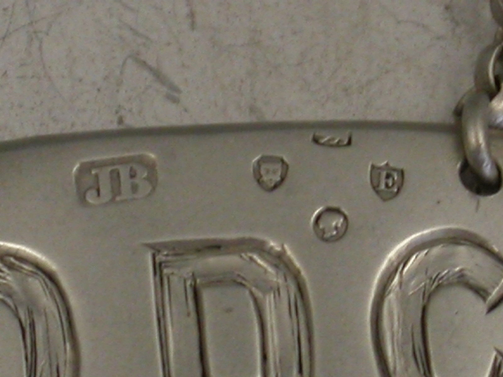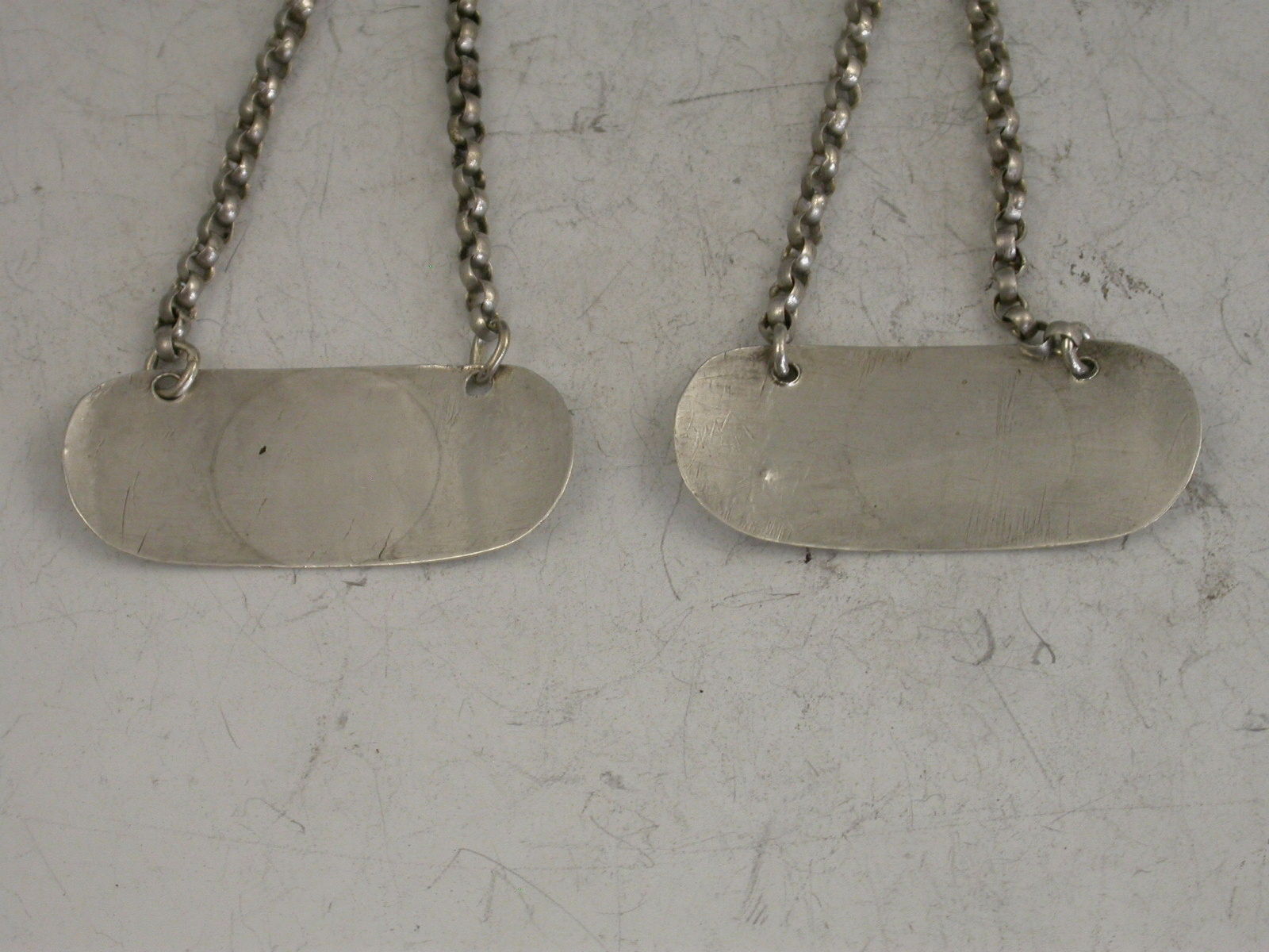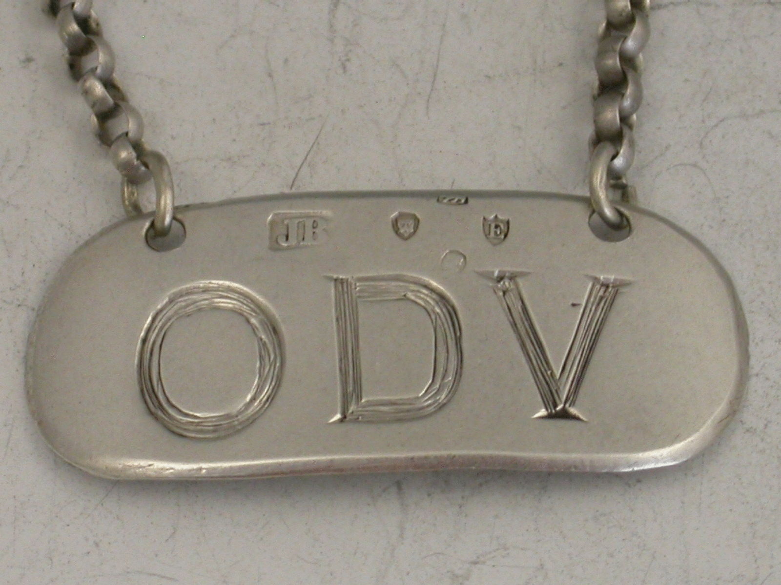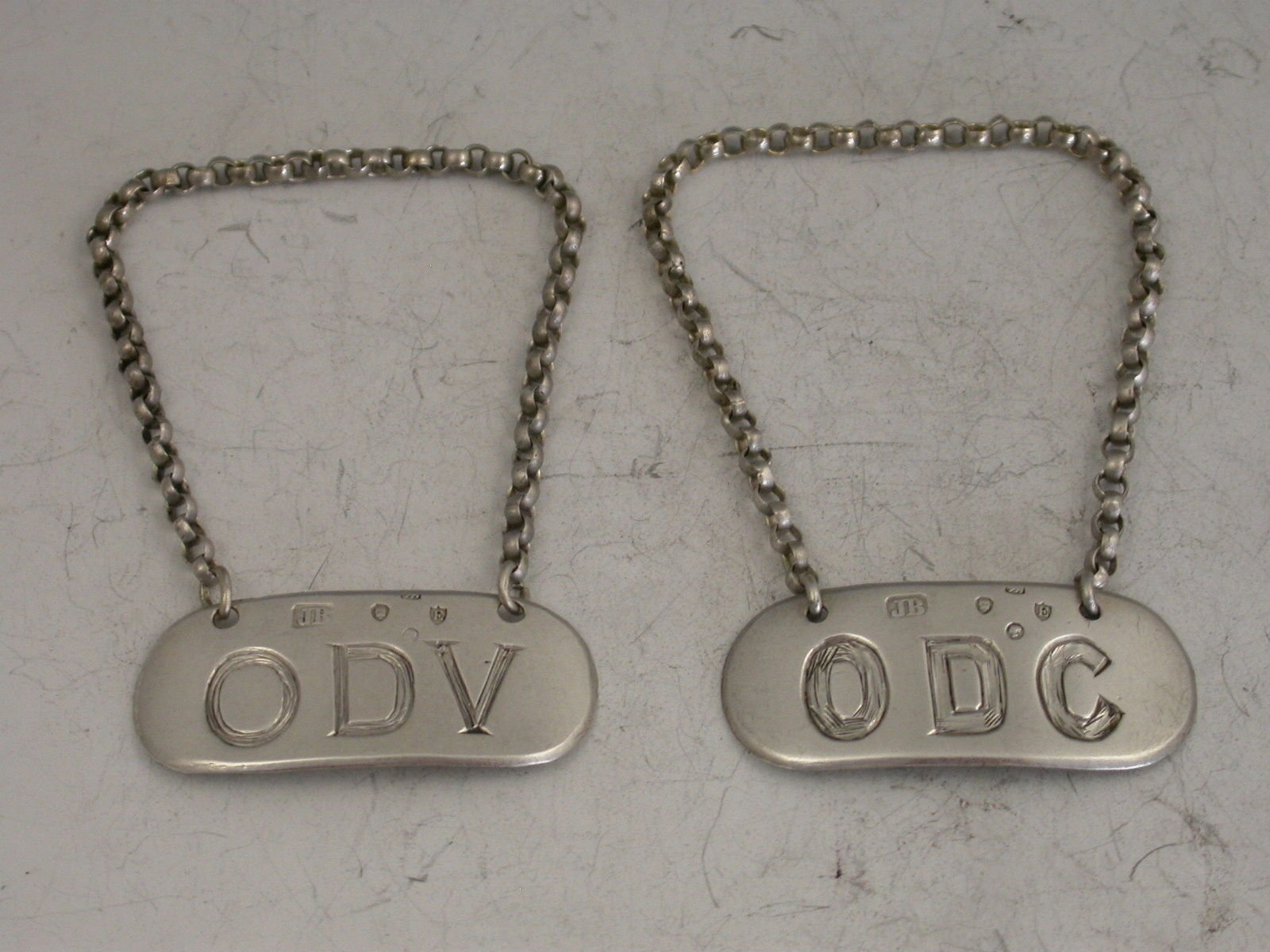 An unusual pair Victorian silver Toilet Water or Spirit Labels, of plain rounded rectangular form, engraved with the mysterious titles; ODV and ODC. Possibly for perfumed oils ?