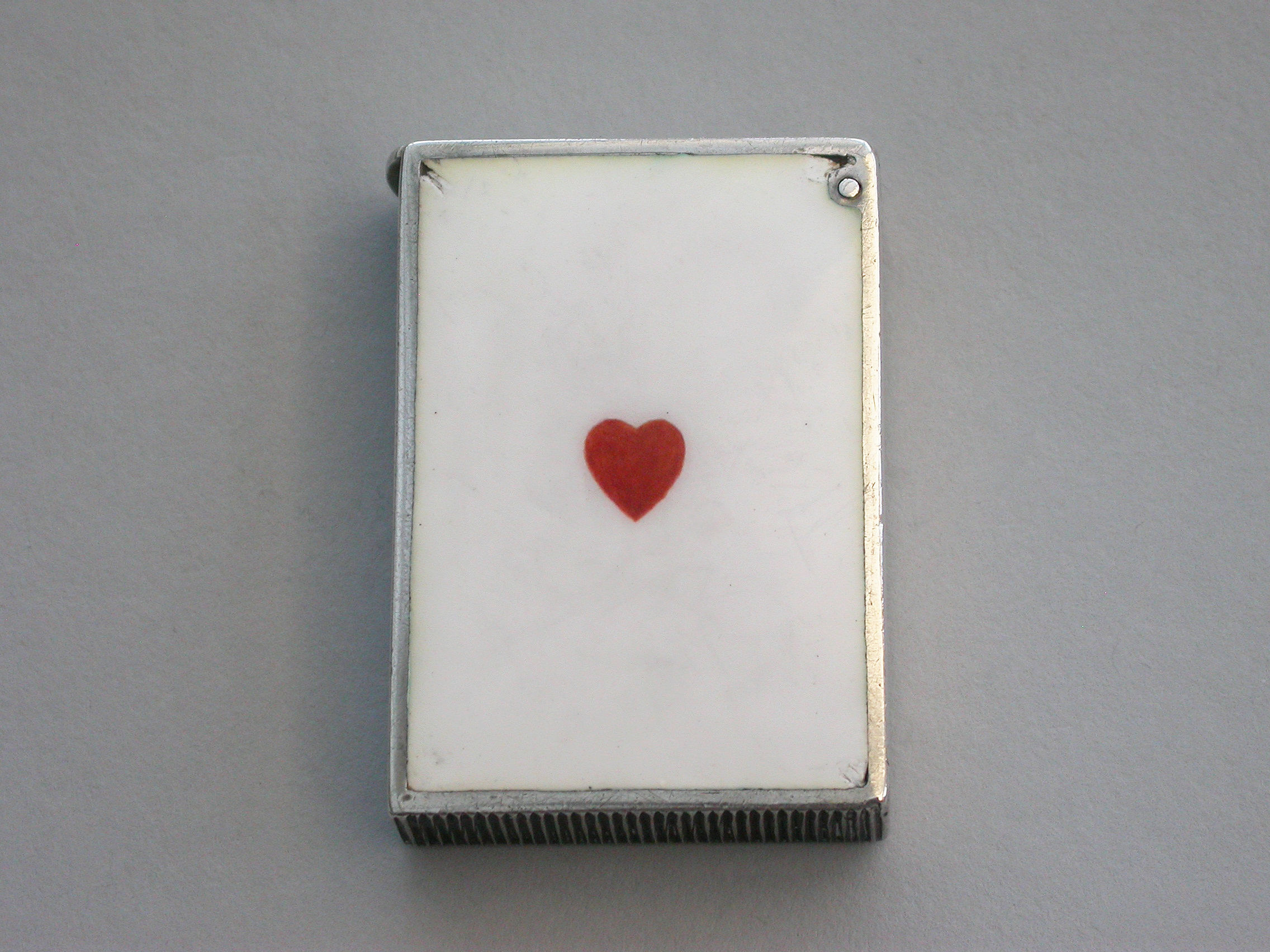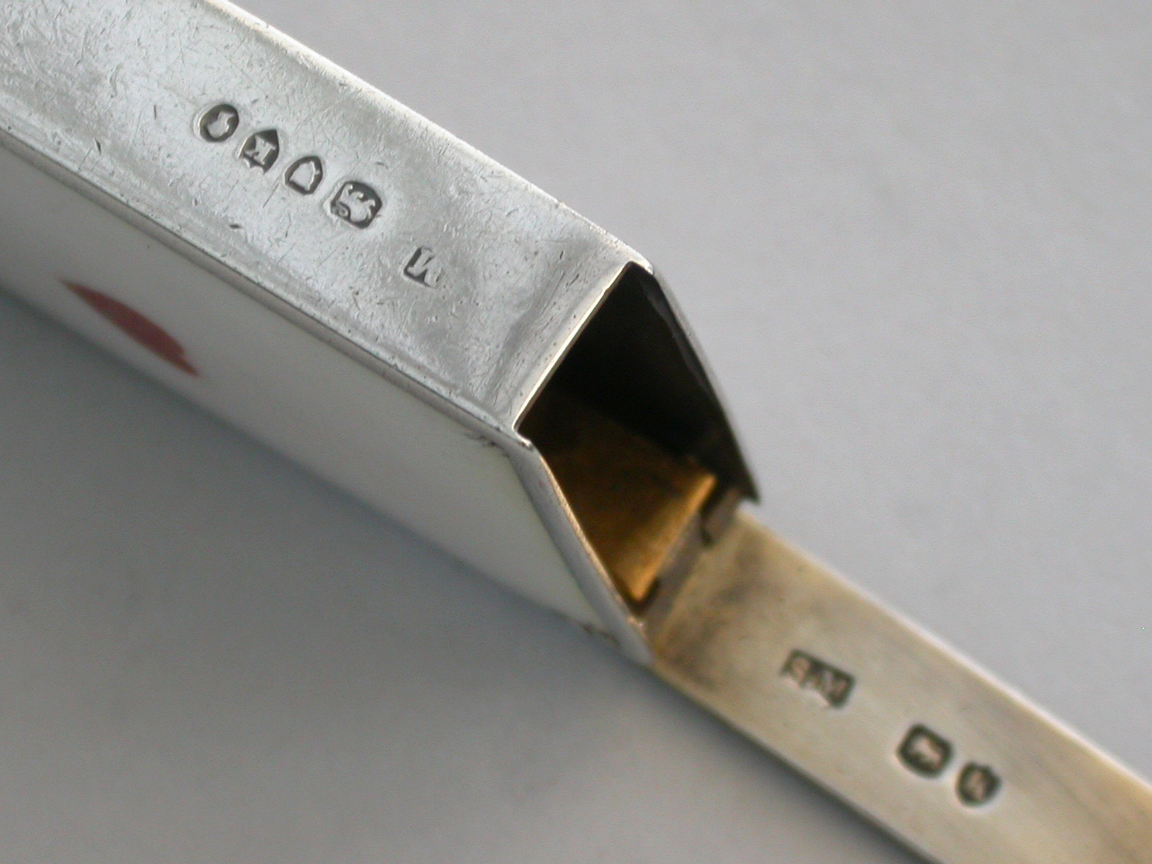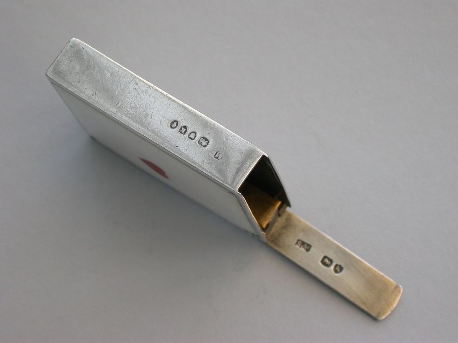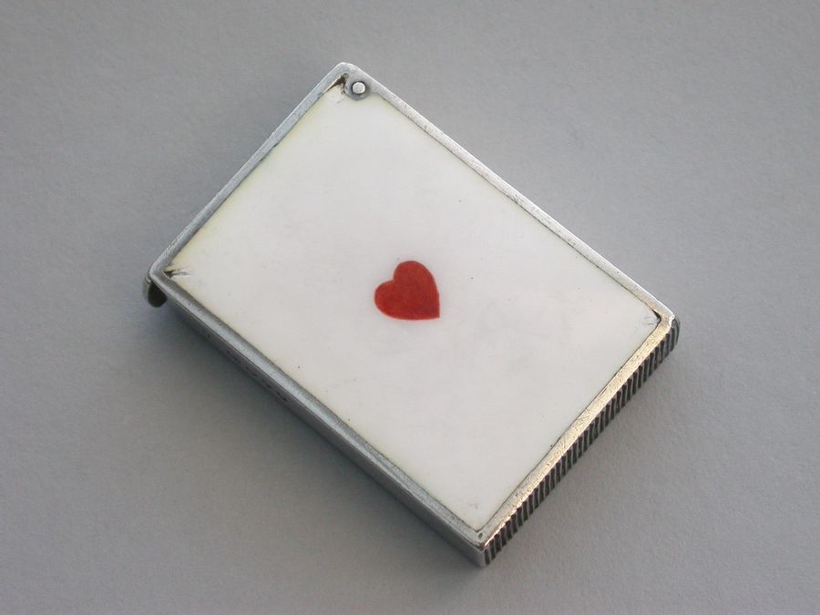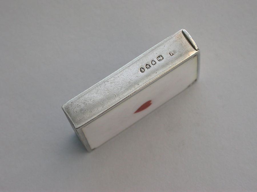 A rare Victorian silver and enamel Vesta Case of rectangular form with sprung hinged flat-top lid, one side enamelled with the King of Hearts, the other with the Ace of Hearts.
