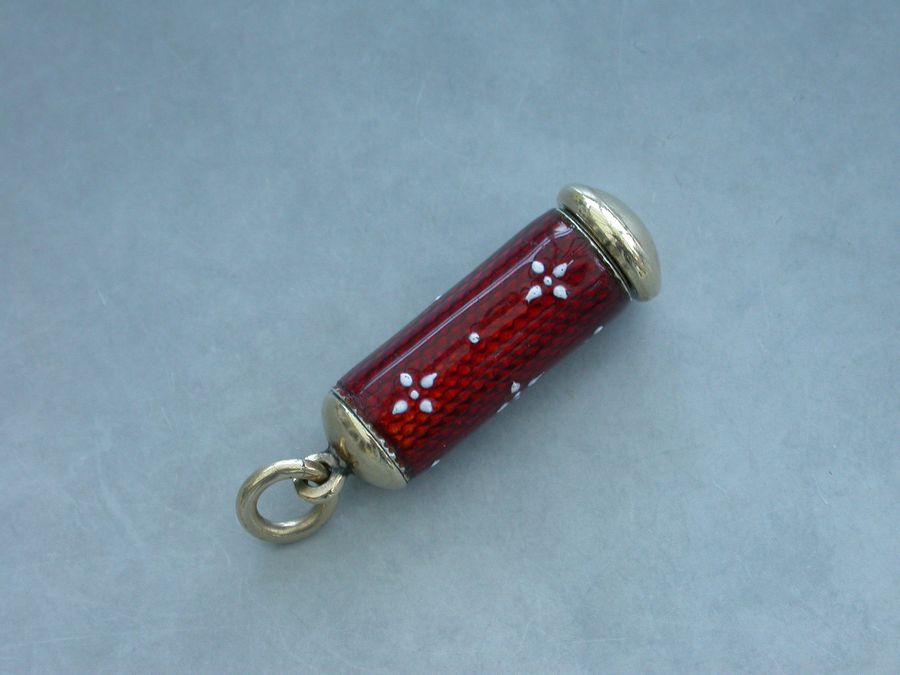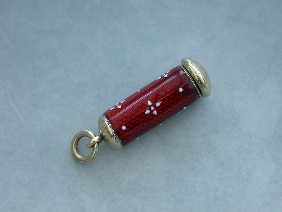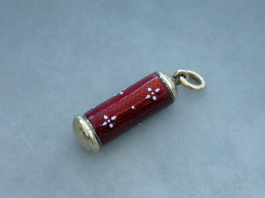 A good quality late Victorian small 10 carat gold and enamel telescopic Propelling Pencil with attached suspension ring, the dark red guilloche enamel sleeve with white enamel highlights, the bullet shaped telescopic pencil with reeded barrel.