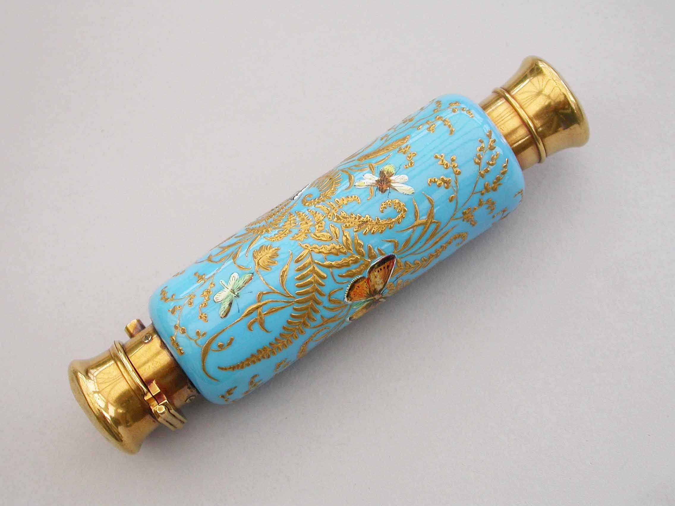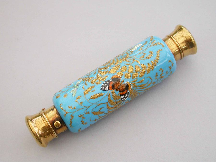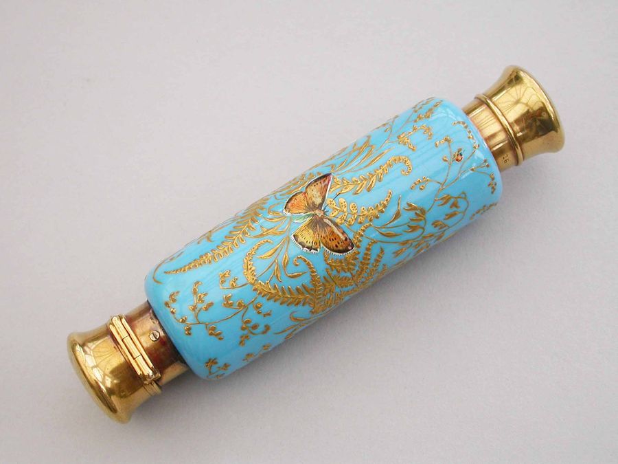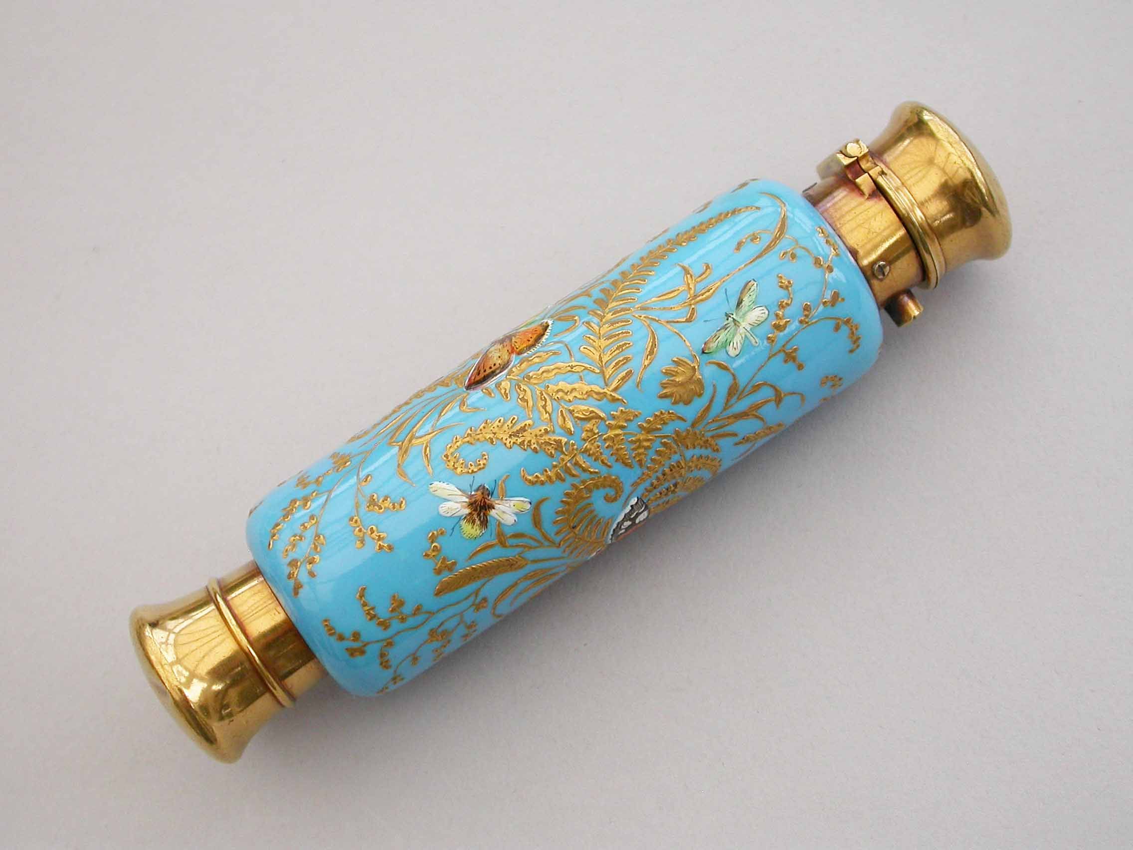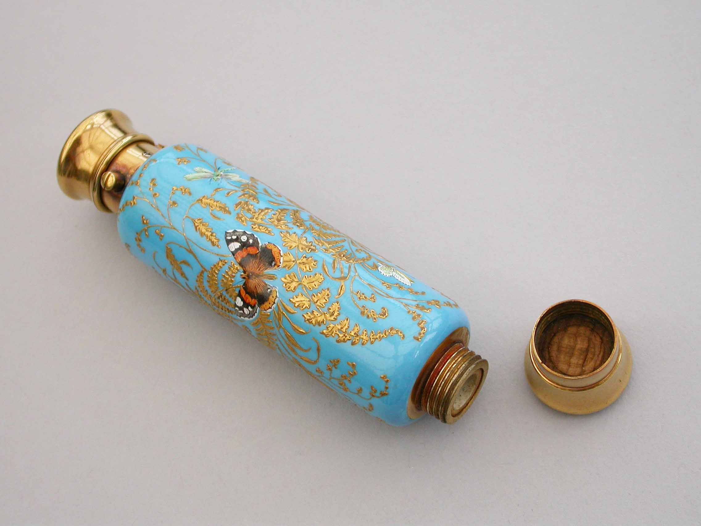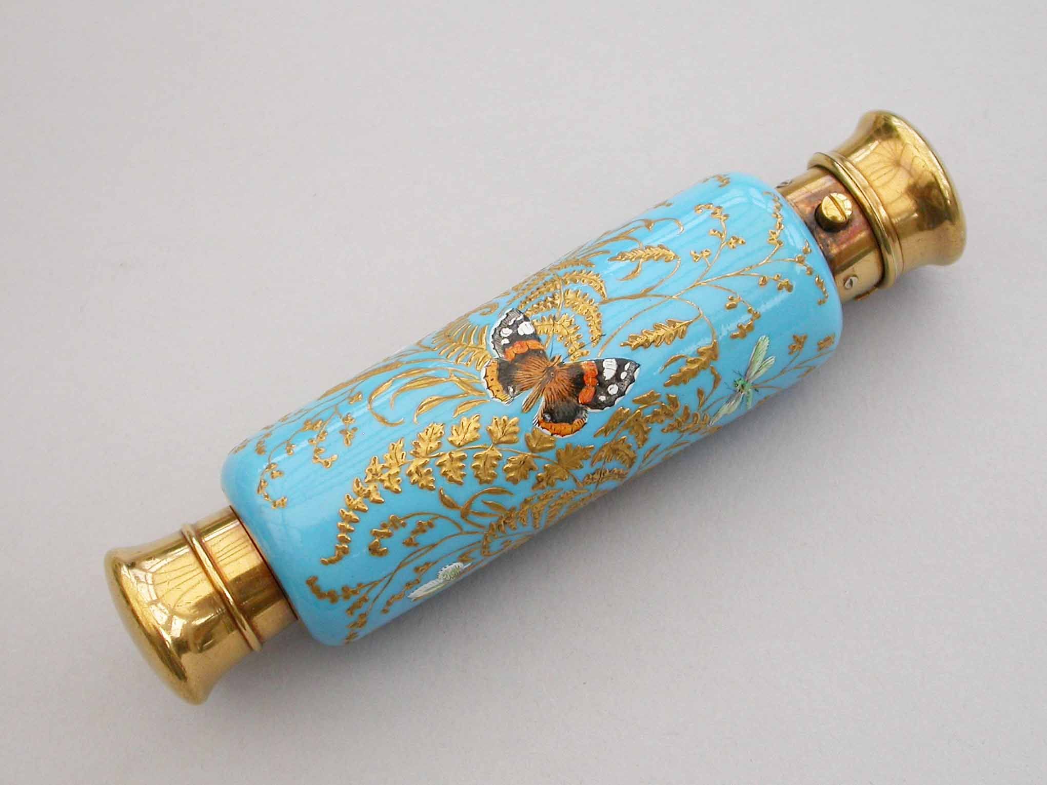A very fine quality Victorian 16 carat gold mounted double-ended porcelain Scent & Smelling Salts Bottle, the porcelain body with a turquoise ground and raised gilded highlights, superbly painted in polychrome enamels with Butterflies and Insects, including a Red Admiral and Large Copper Butterfly and even a minute Ladybird. One end with a sprung hinged lid with internal sprung glass plate to retain the Salts, the other end with screw-off lid with internal cork for the Scent.