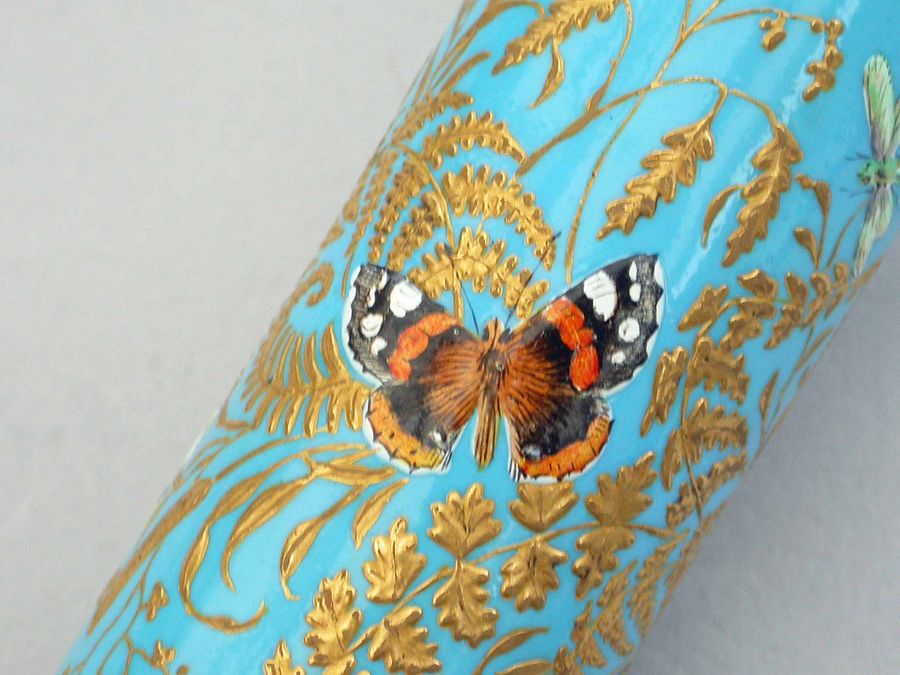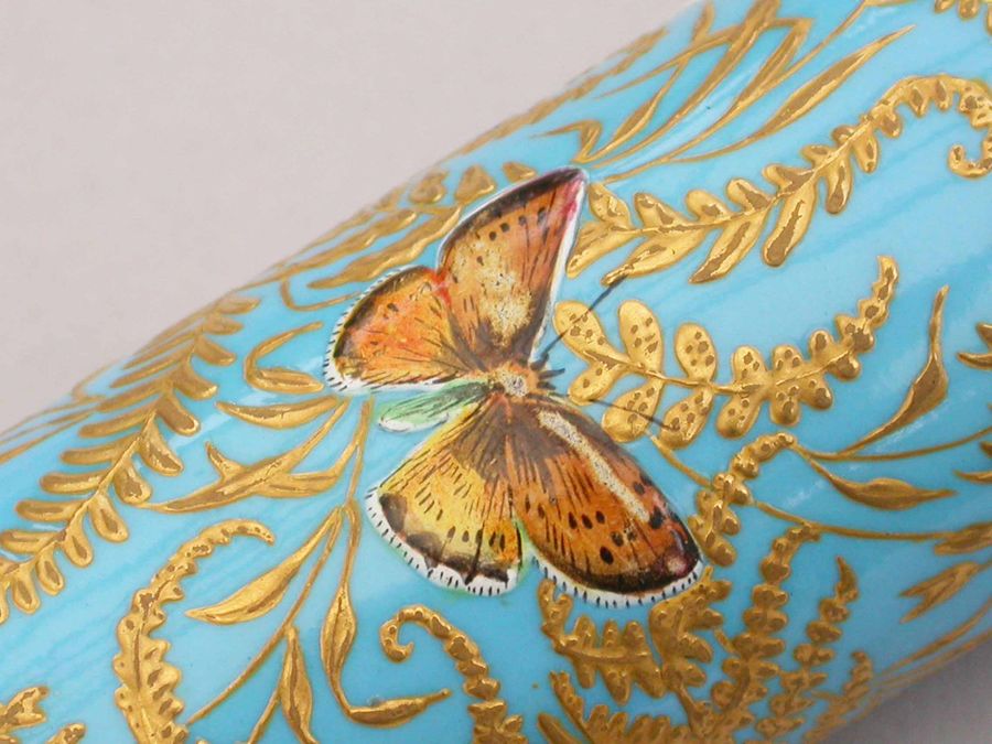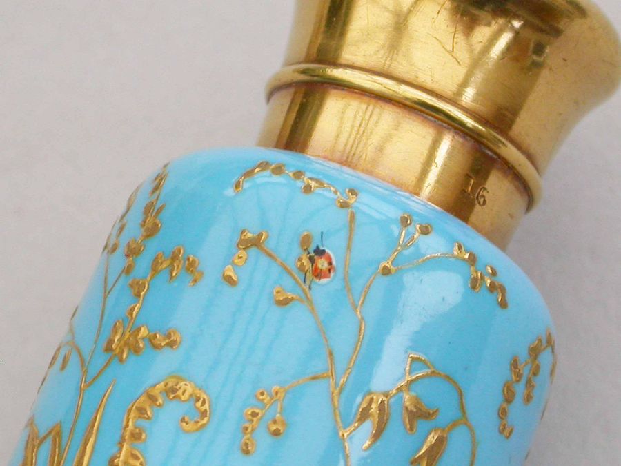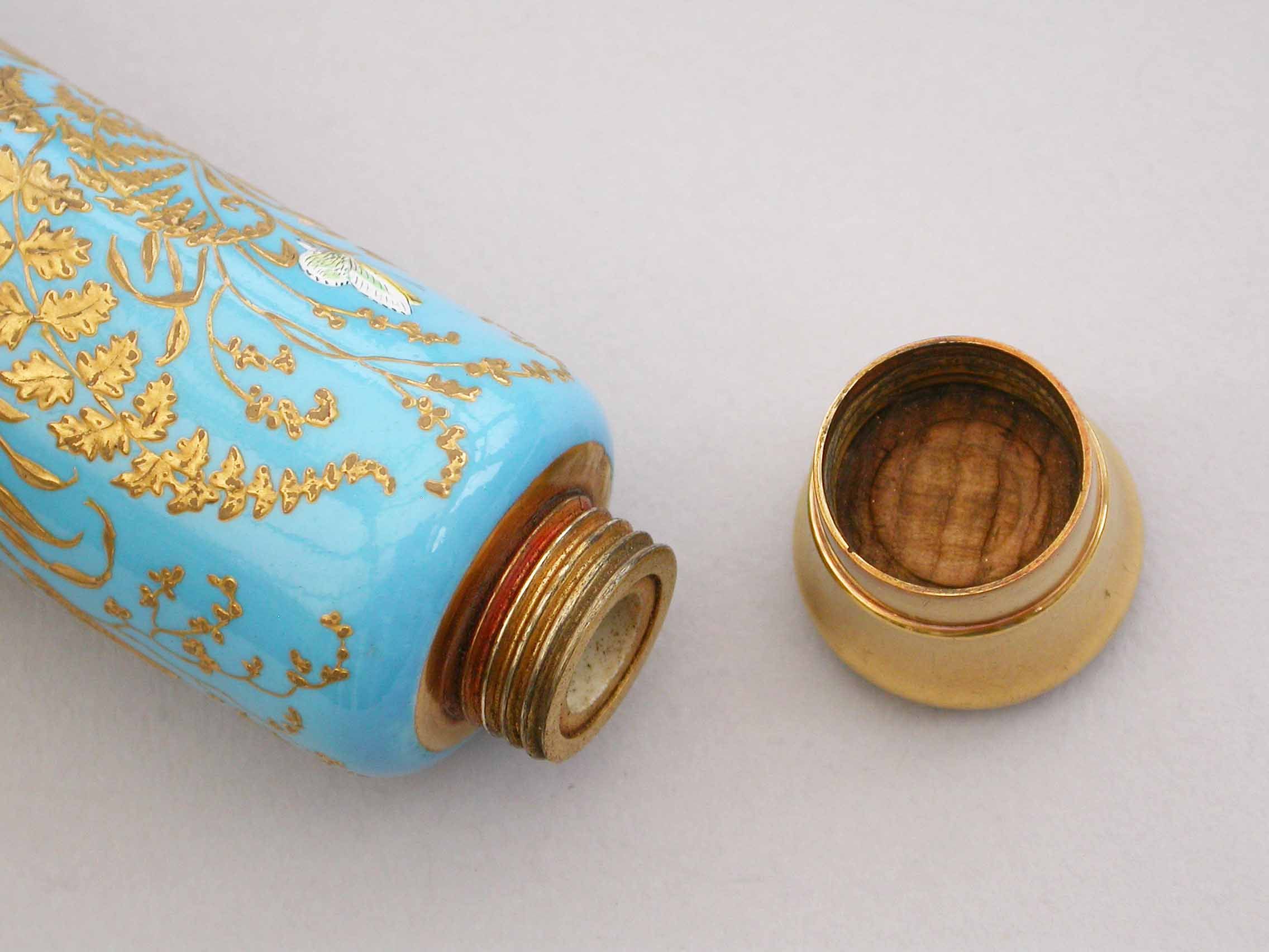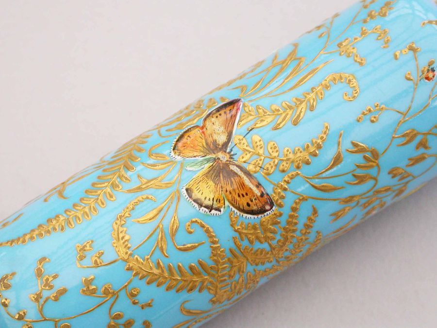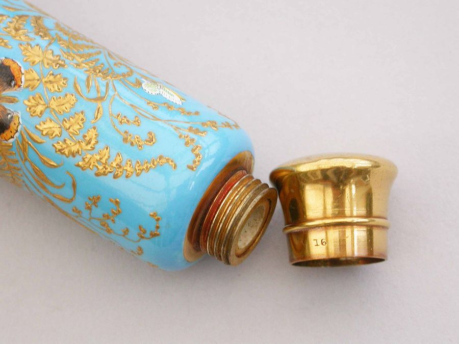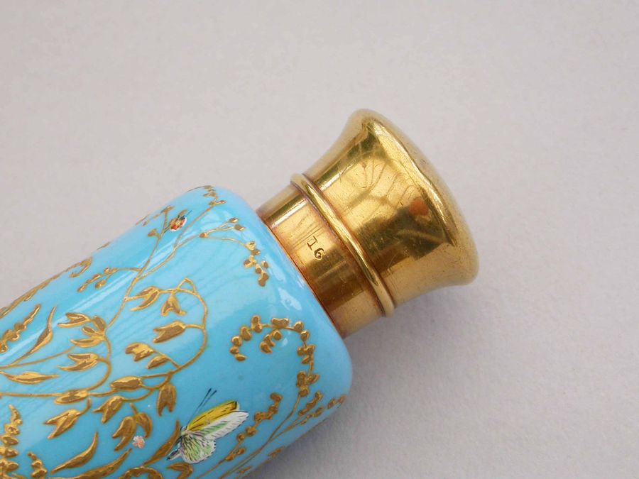 A very fine quality Victorian 16 carat gold mounted double-ended porcelain Scent & Smelling Salts Bottle, the porcelain body with a turquoise ground and raised gilded highlights, superbly painted in polychrome enamels with Butterflies and Insects, including a Red Admiral and Large Copper Butterfly and even a minute Ladybird. One end with a sprung hinged lid with internal sprung glass plate to retain the Salts, the other end with screw-off lid with internal cork for the Scent.