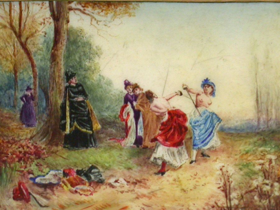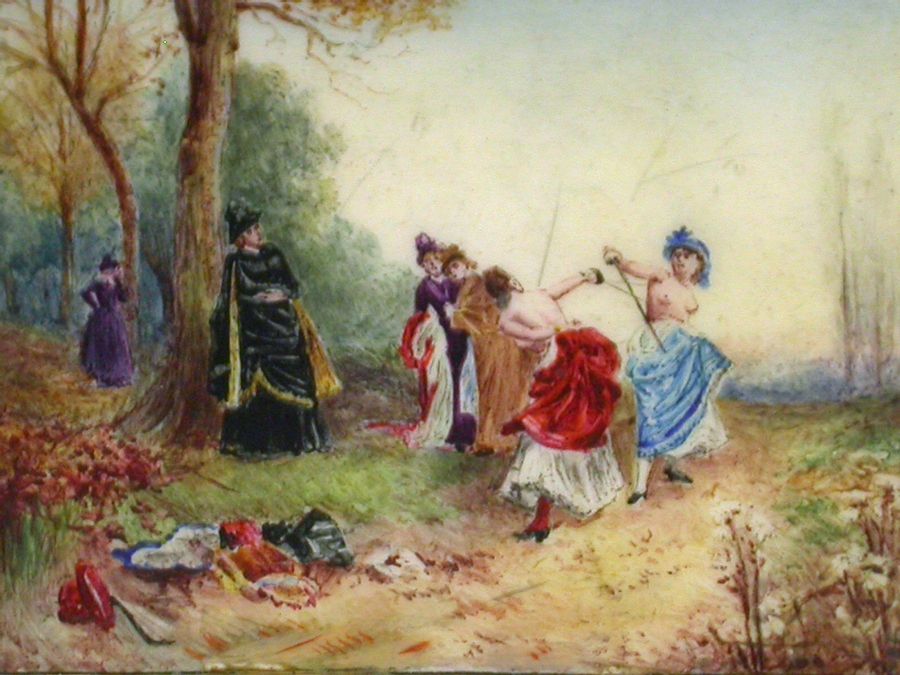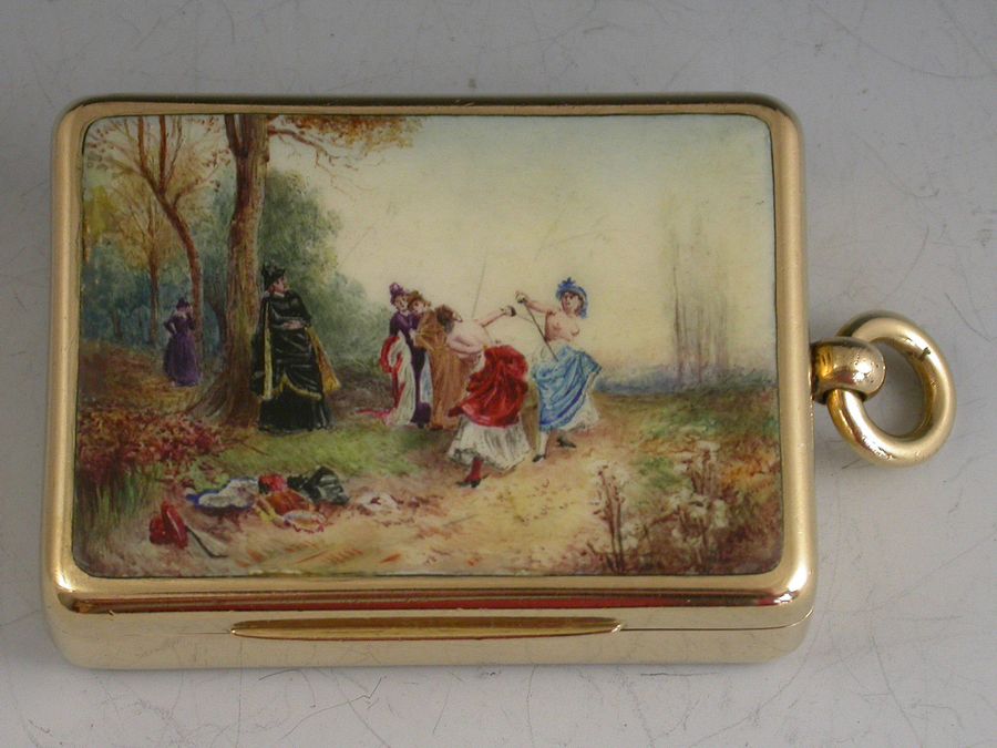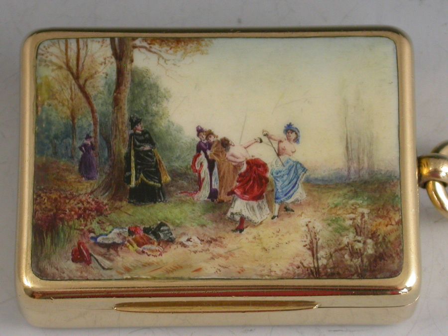 An exceptional Victorian 18 carat gold and enamel Vesta Case, after the famous French oil painting by Emile Bayard - ""An Affair of Honor"", depicting two topless women fighting a dual. The plain rounded rectangular hinged case with striker to the back and attached suspension ring.