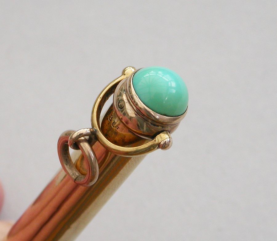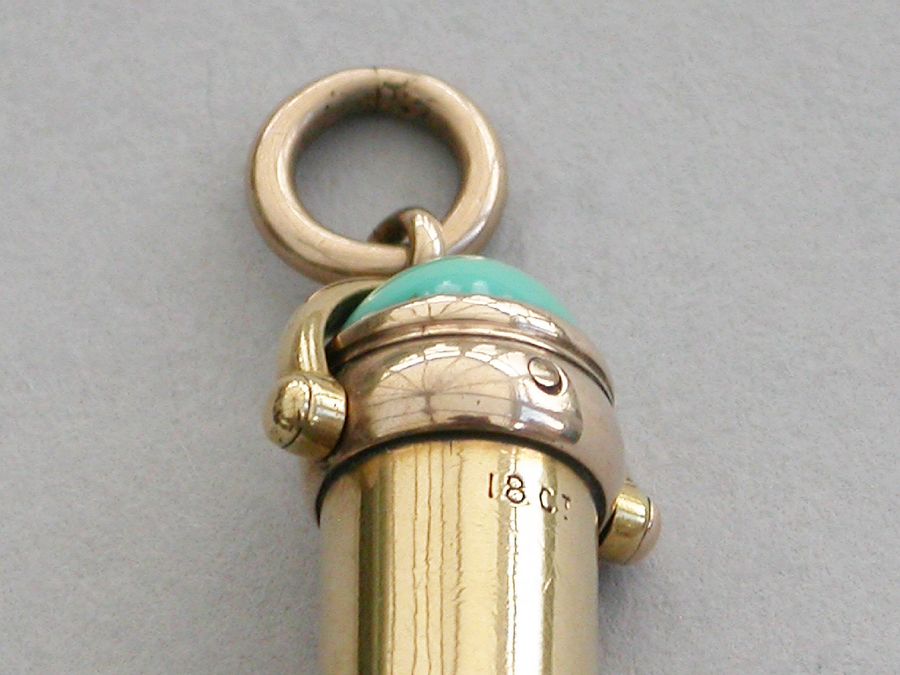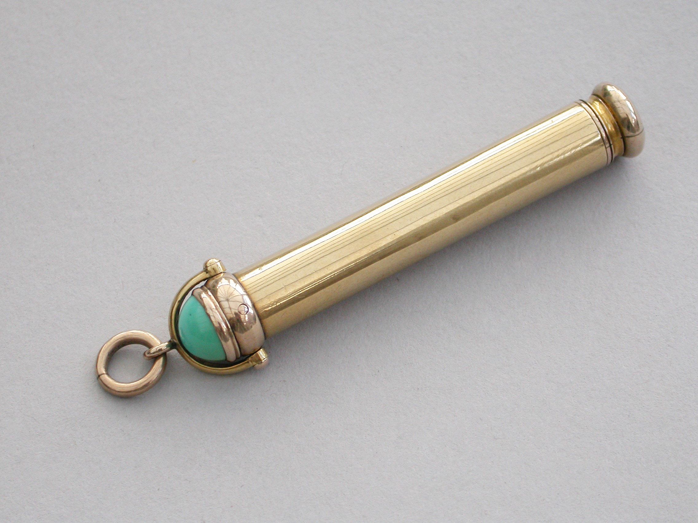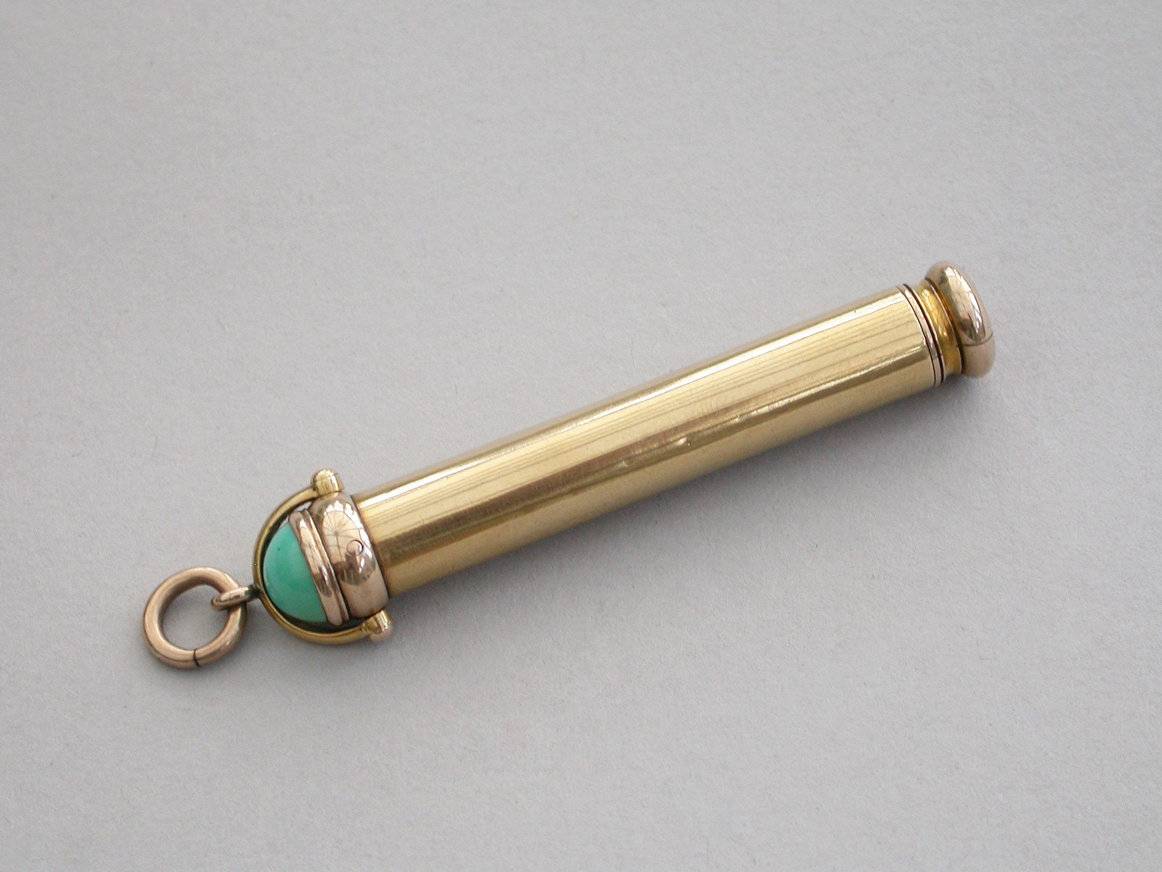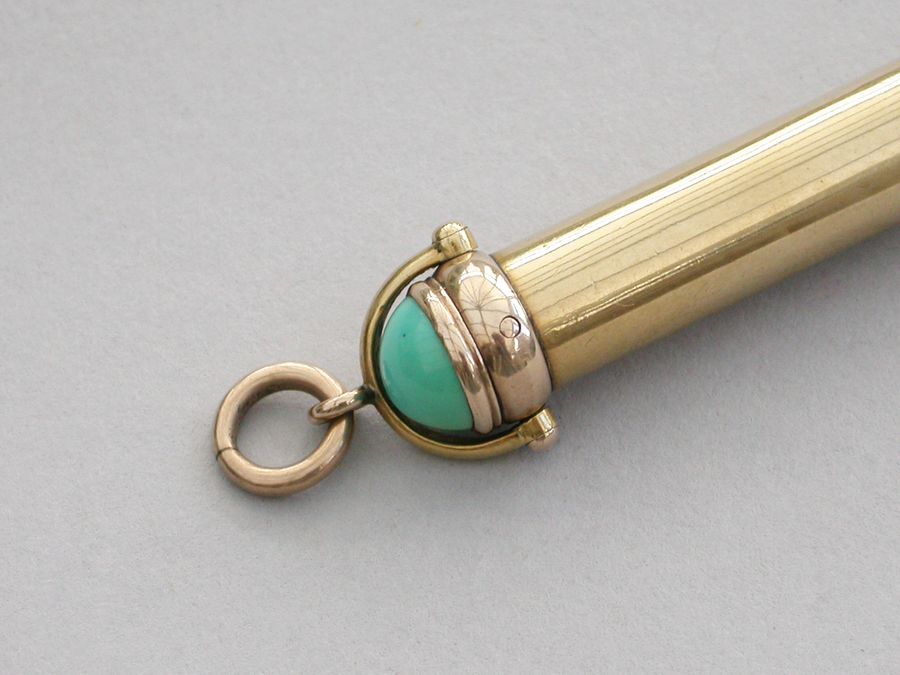 A good quality late Victorian 18 carat gold combined telescopic sliding Propelling Pencil and Pen Holder, of plain cylindrical form with attached stirrup shaped loop and suspension ring, the terminal set with a cabichone turquoise stone.