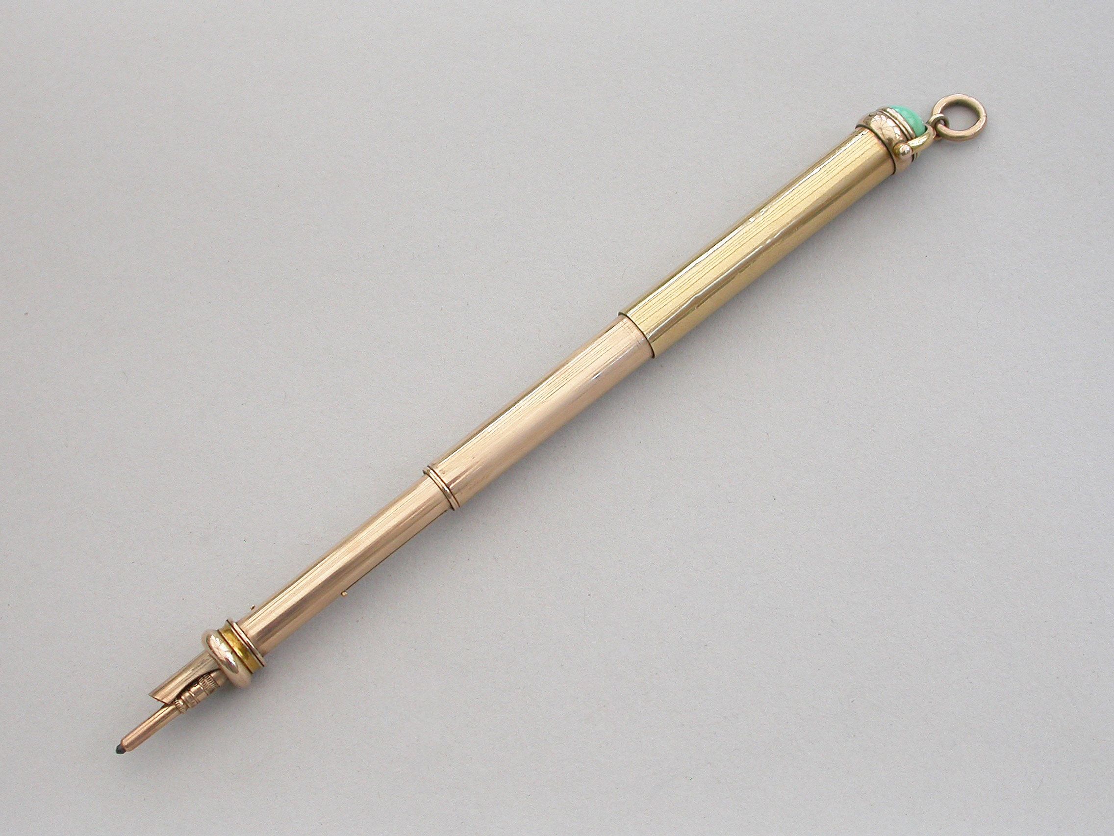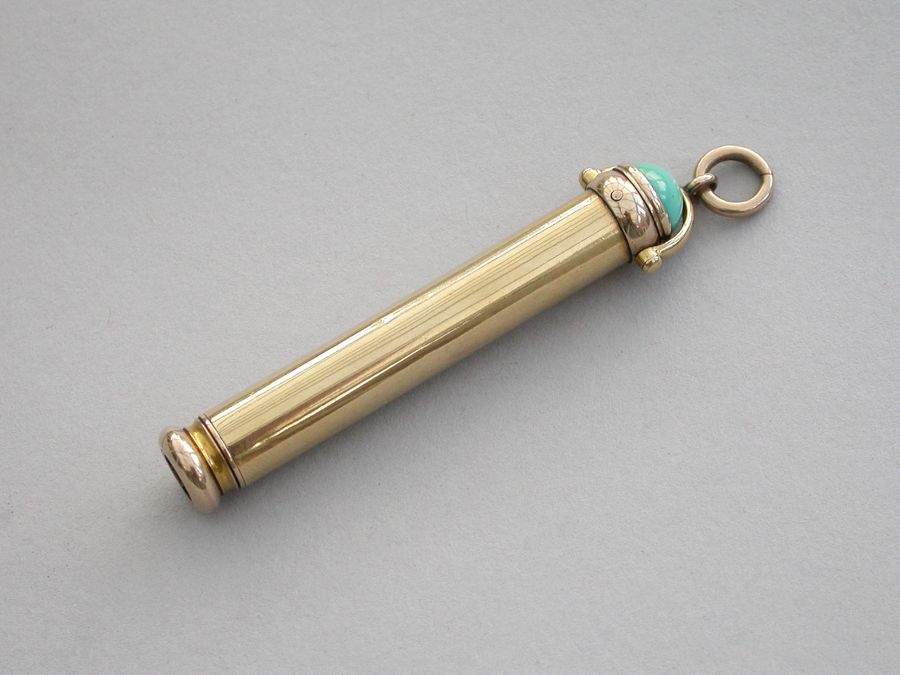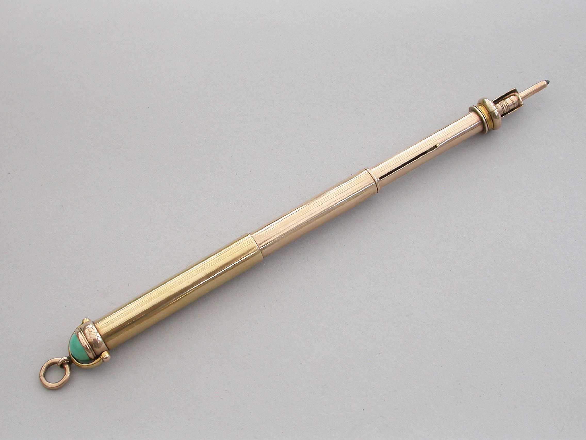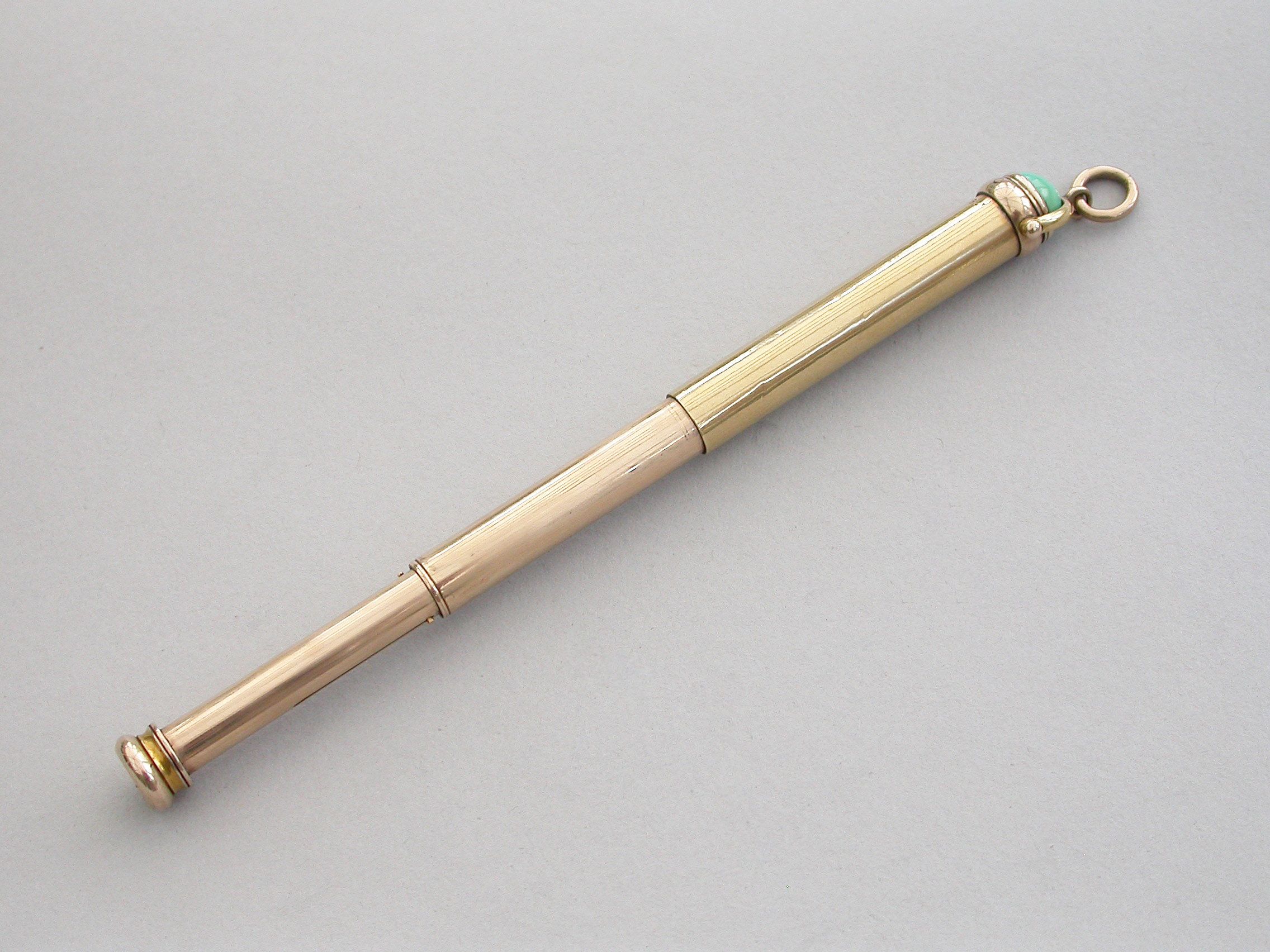 A good quality late Victorian 18 carat gold combined telescopic sliding Propelling Pencil and Pen Holder, of plain cylindrical form with attached stirrup shaped loop and suspension ring, the terminal set with a cabichone turquoise stone.