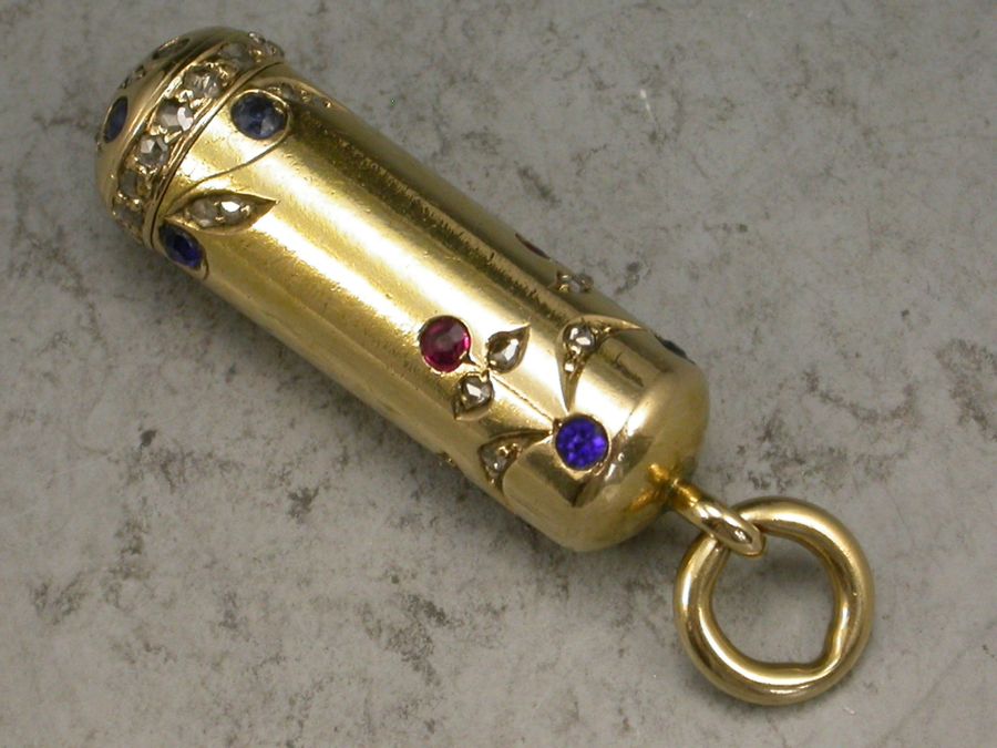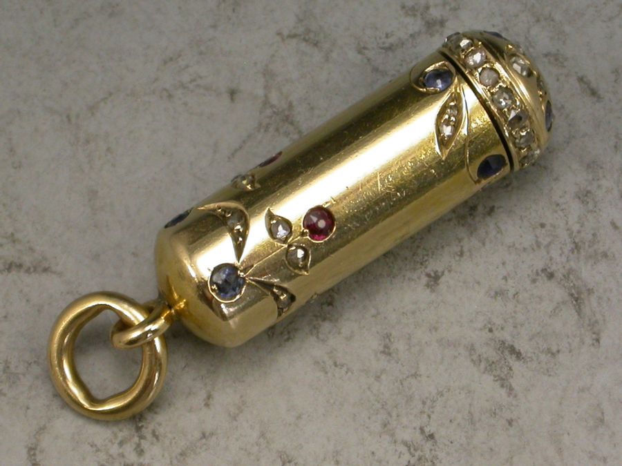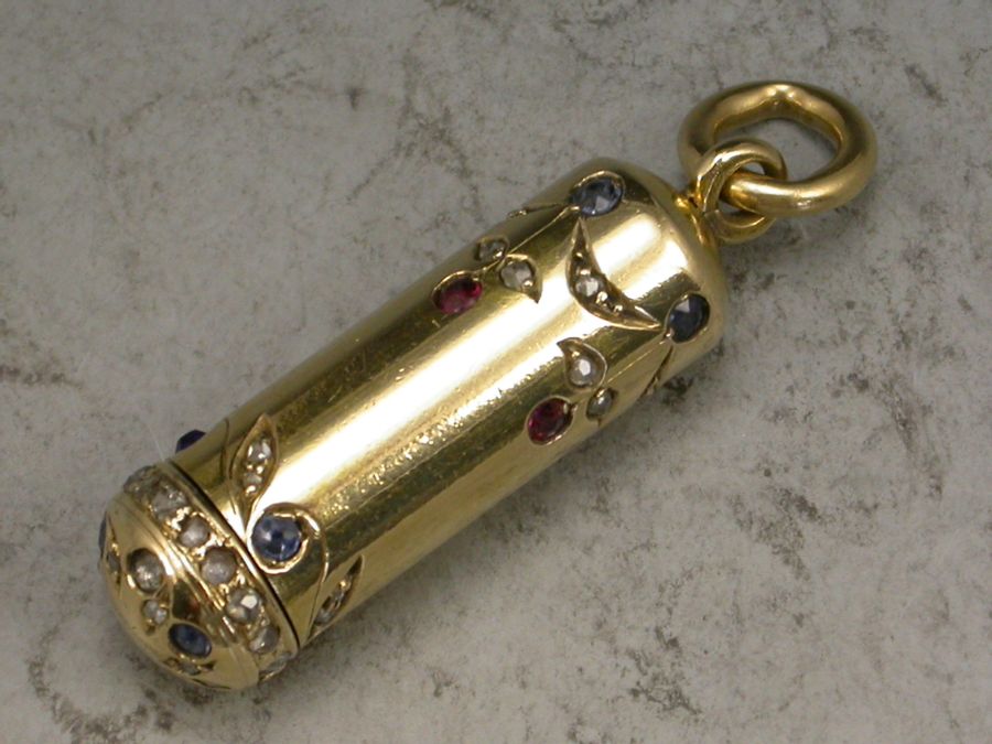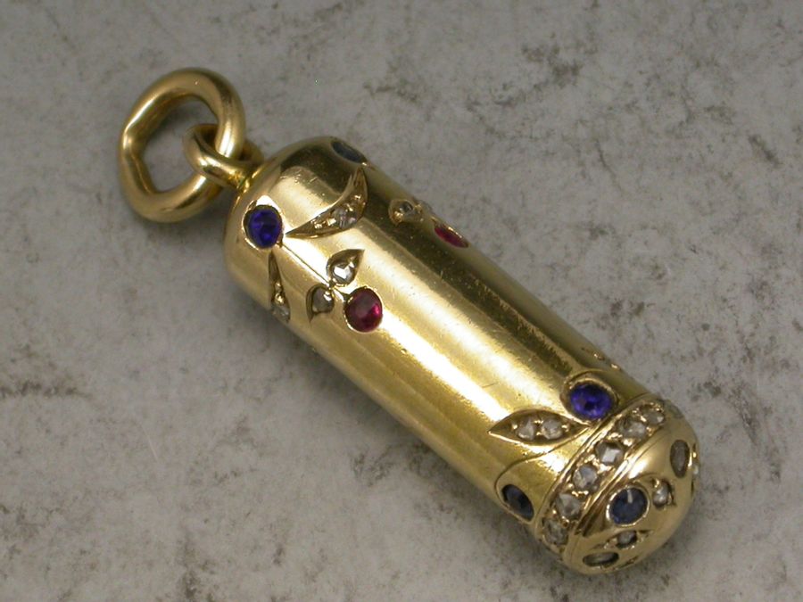 A fine quality Victorian 18 carat gold miniature cased Propelling Pencil, the case set with diamonds, rubies and sapphires. The pencil extends as it is removed from the sheath and is stamped - 'PAT APPd FOR' and 18CT. The pencil when returned inside the sheath can be twisted to lock it in place. With attached suspension ring.