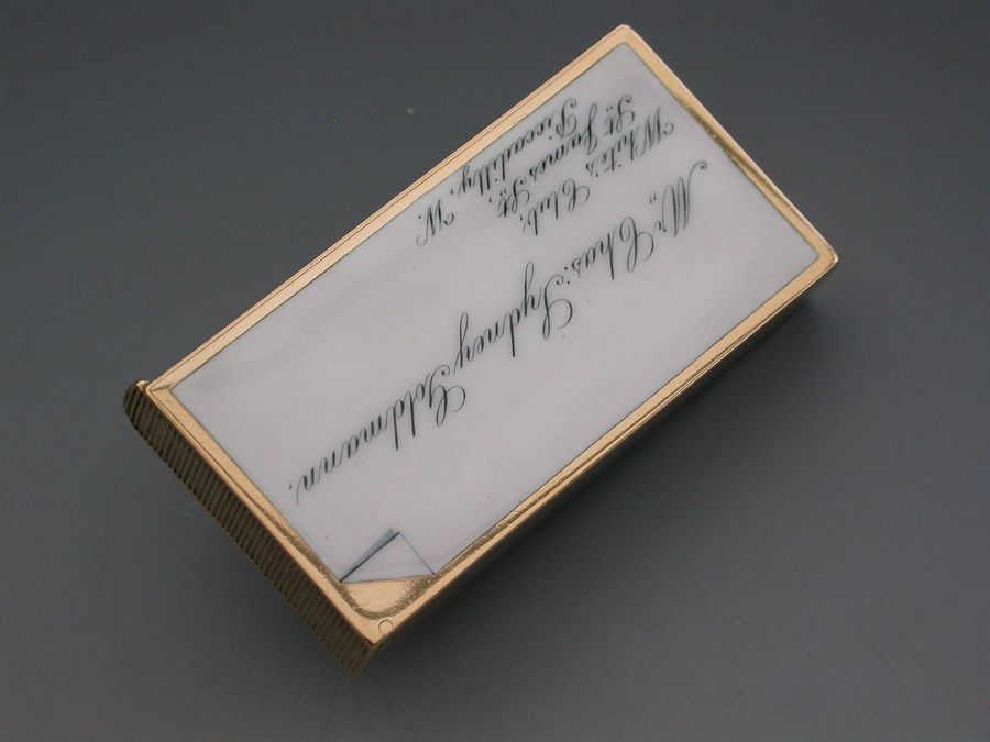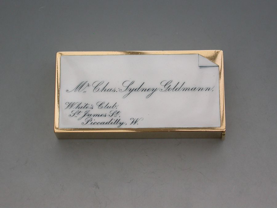A very fine quality Victorian 18 carat gold and enamel Vesta Case of rectangular form with flat hinged flip-top lid forming the striker, he face with monochrome enamel panel in the form of a ""Calling Card"" for Mr Charles Sydney Goldmann, White's Club, St James's St, Piccadilly, W.