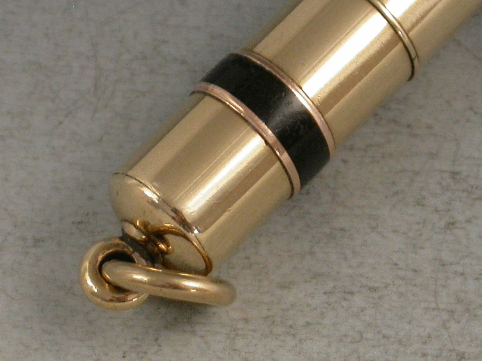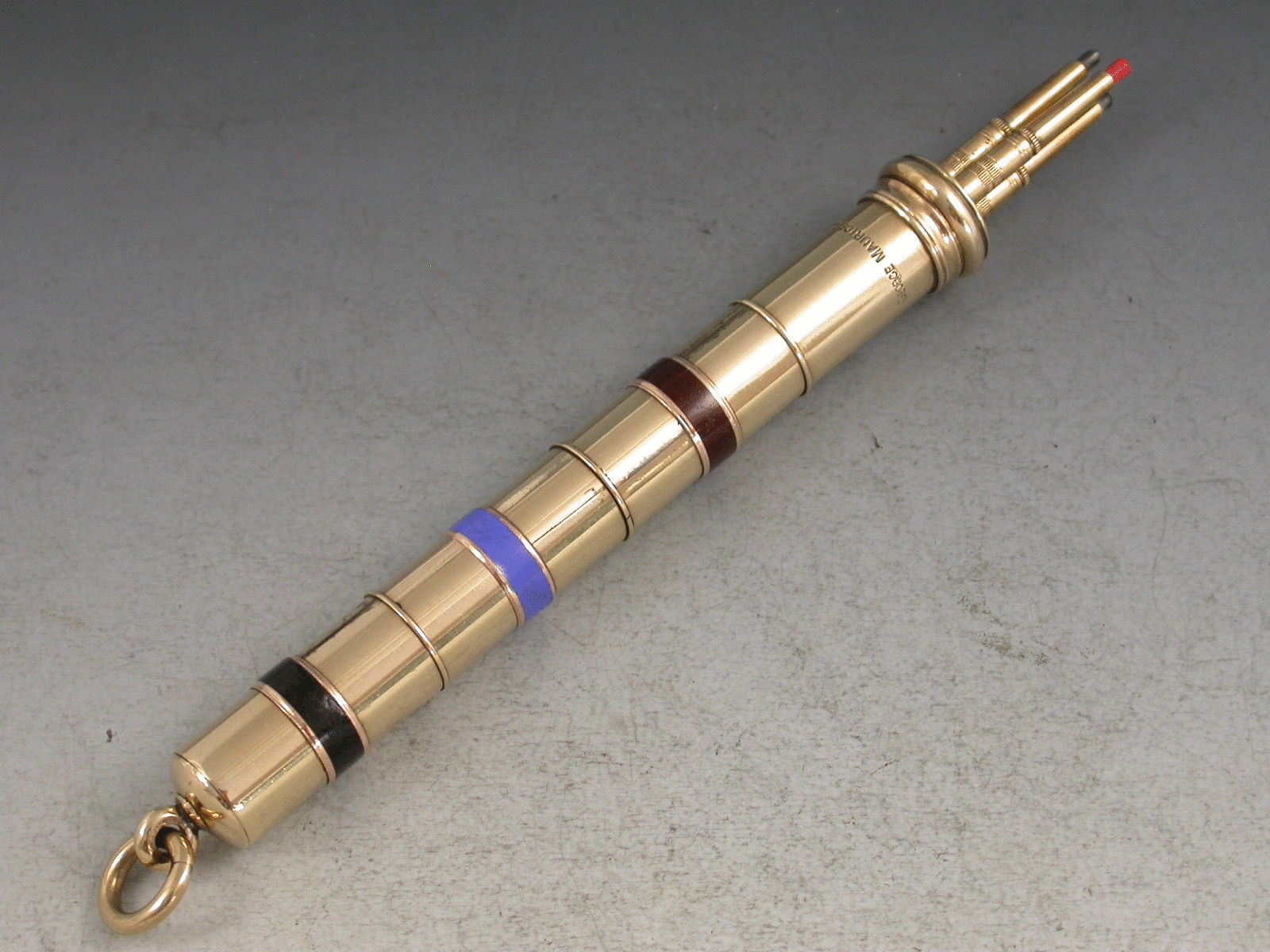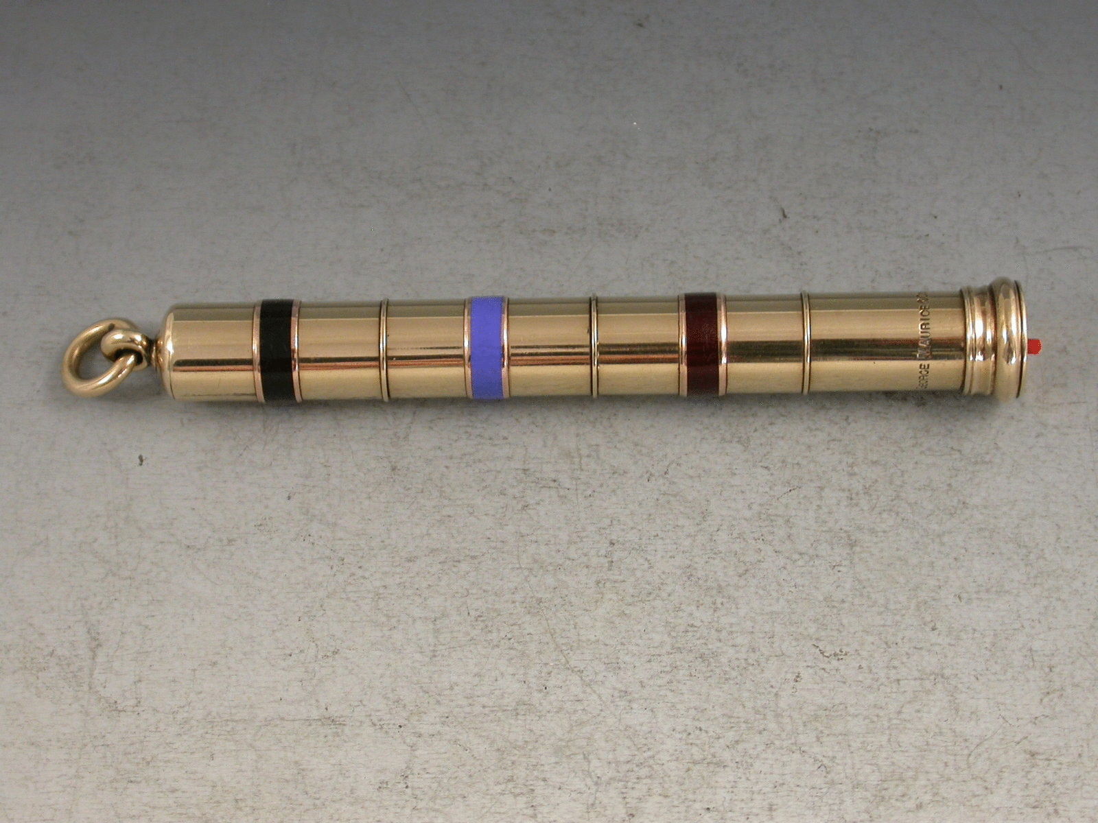 A very fine quality Victorian 9 carat gold (tested) and enamel three colour Propelling Pencil with mechanical twist action to propel the pencils, attached suspension loop.