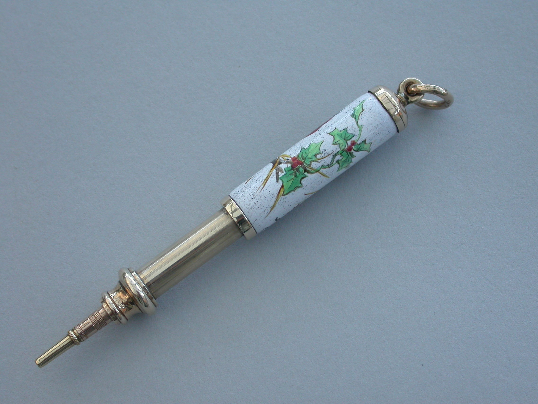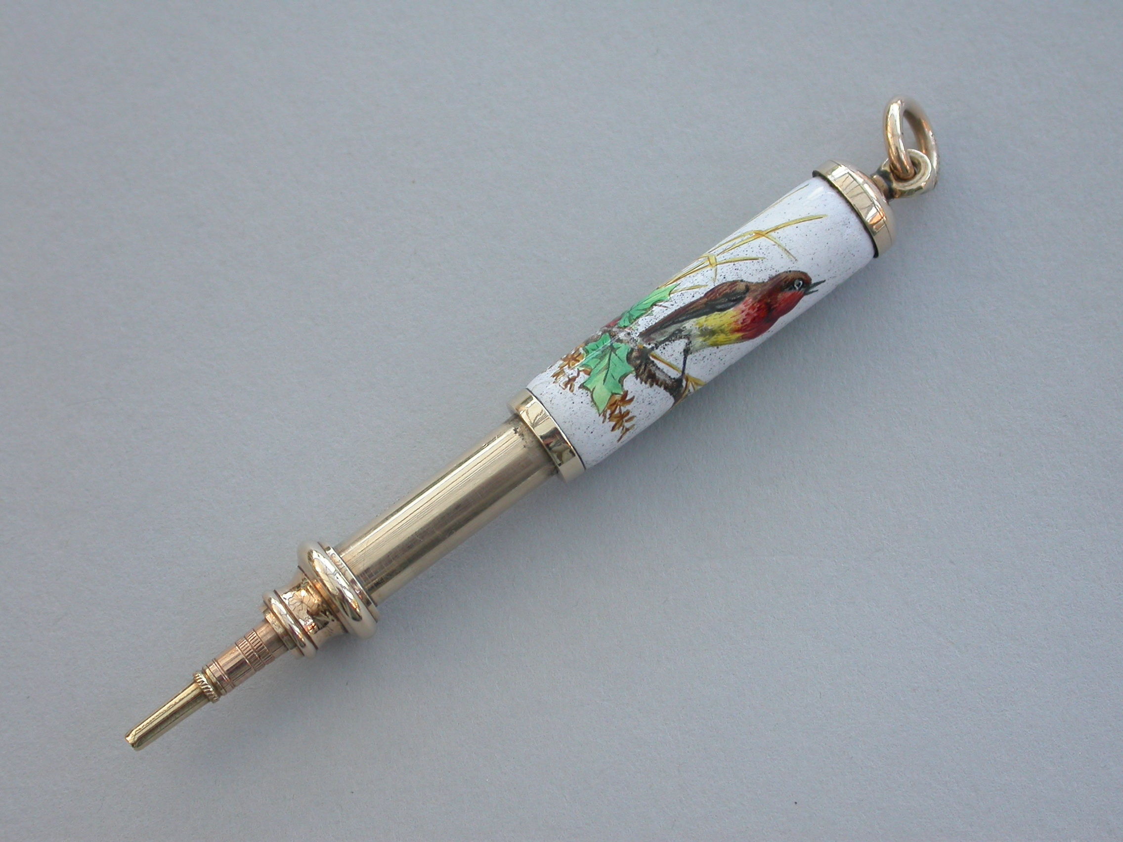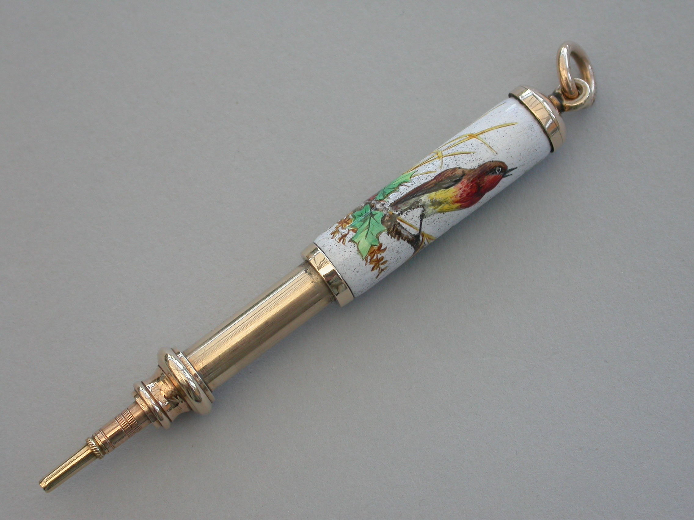A fine quality Victorian 9 carat gold (tested) and enamel telescopic Propelling Pencil with attached suspension ring, the body enamelled with a scene depicting a Christmas Robin perched on a holly branch.