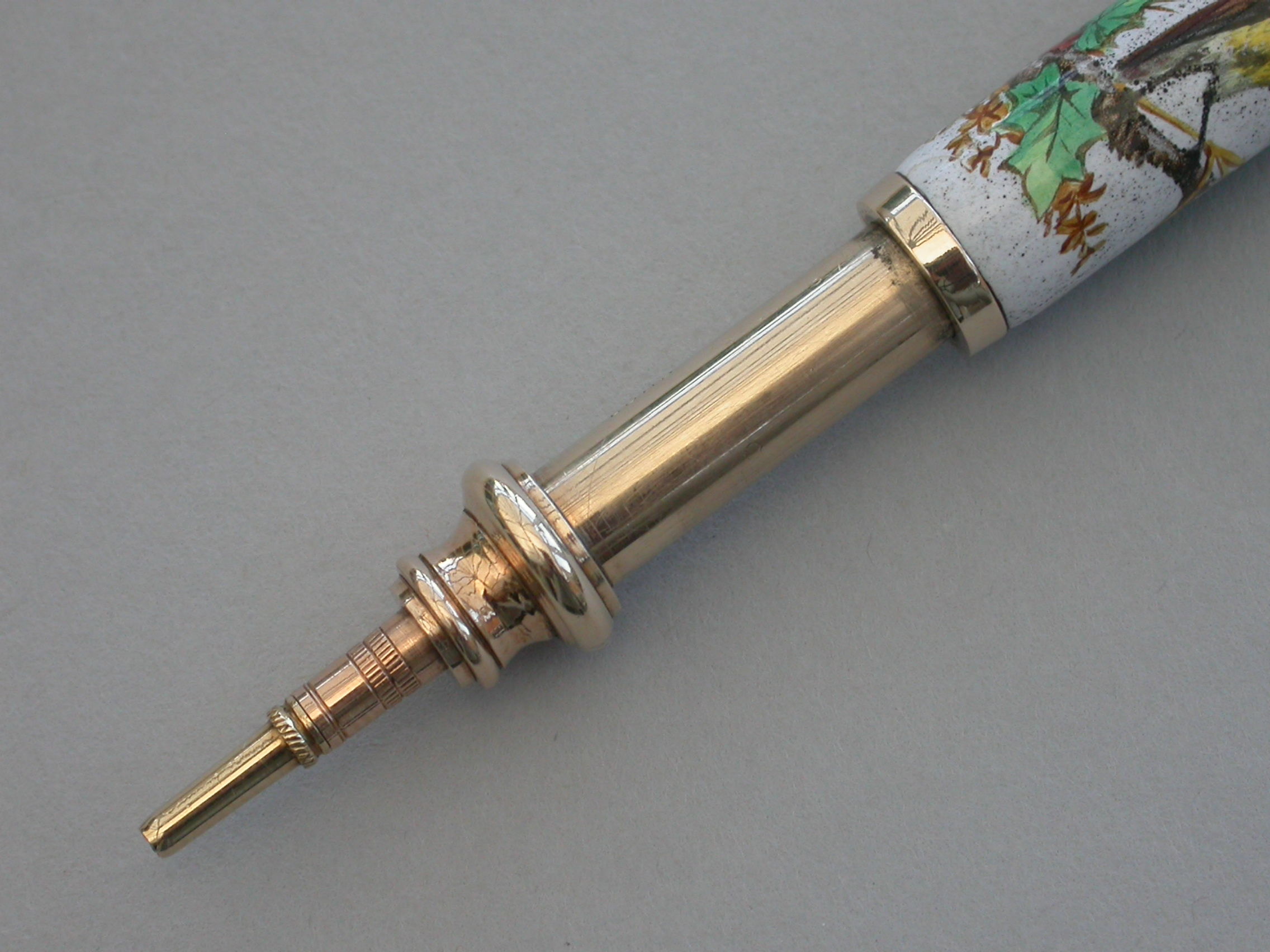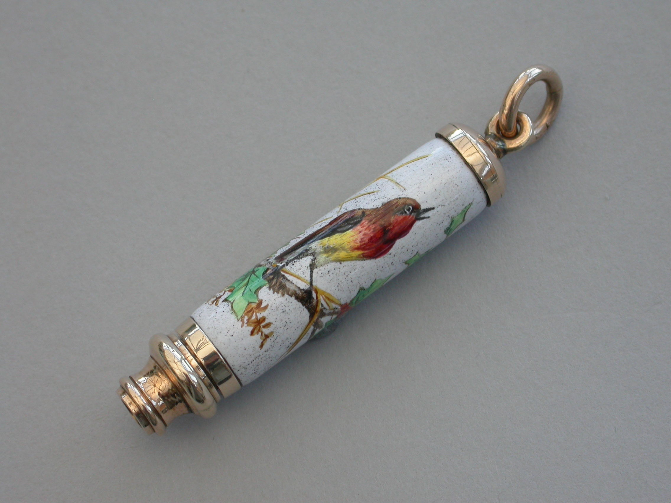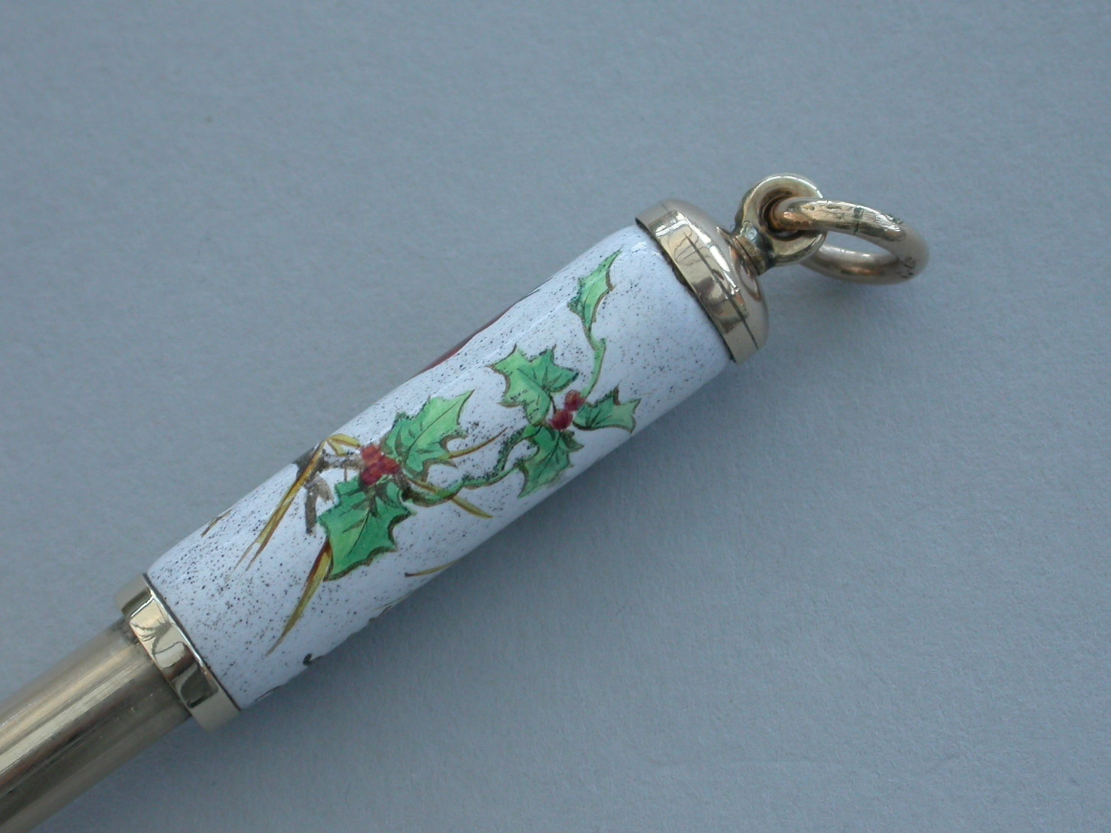 A fine quality Victorian 9 carat gold (tested) and enamel telescopic Propelling Pencil with attached suspension ring, the body enamelled with a scene depicting a Christmas Robin perched on a holly branch.