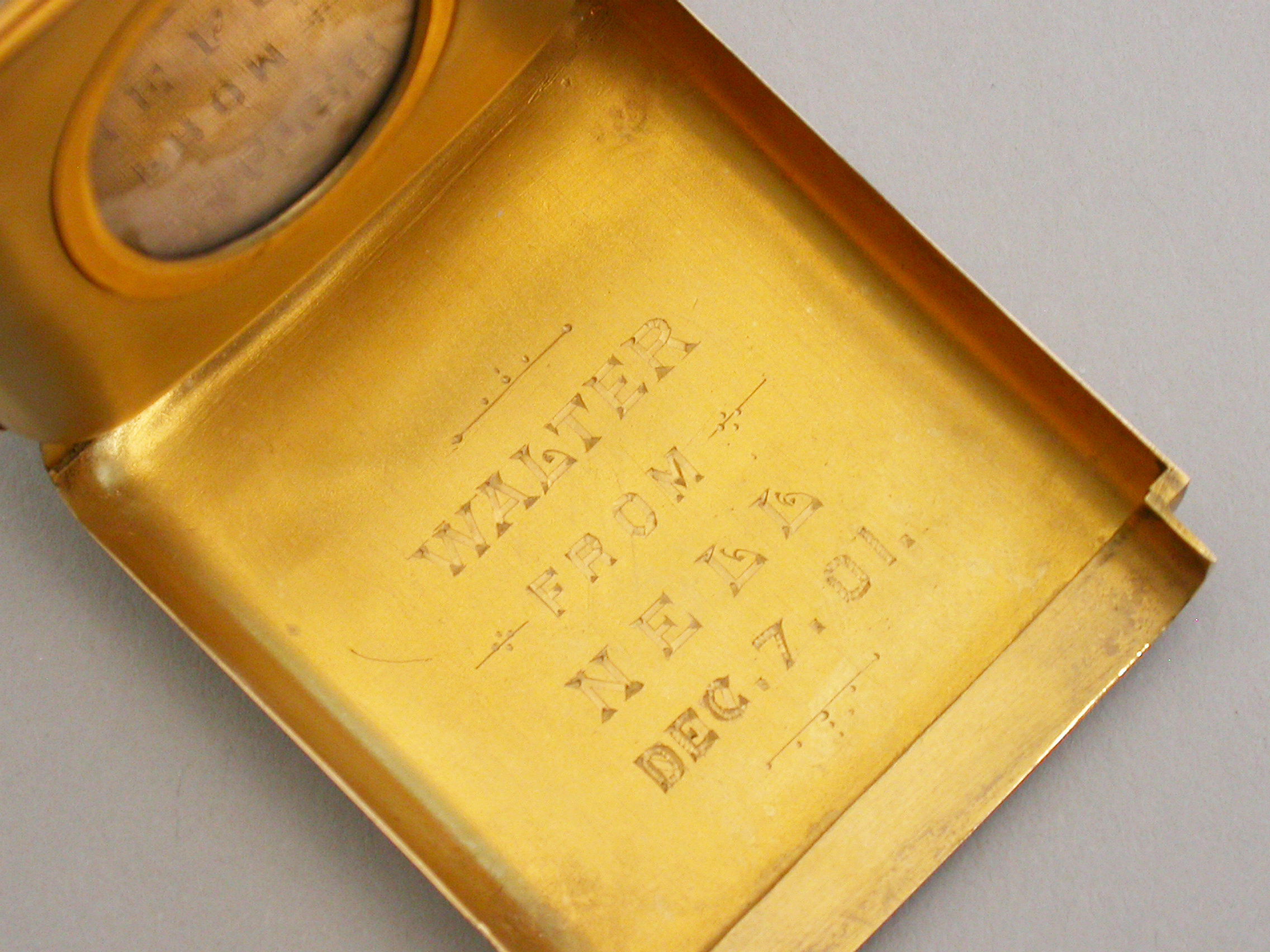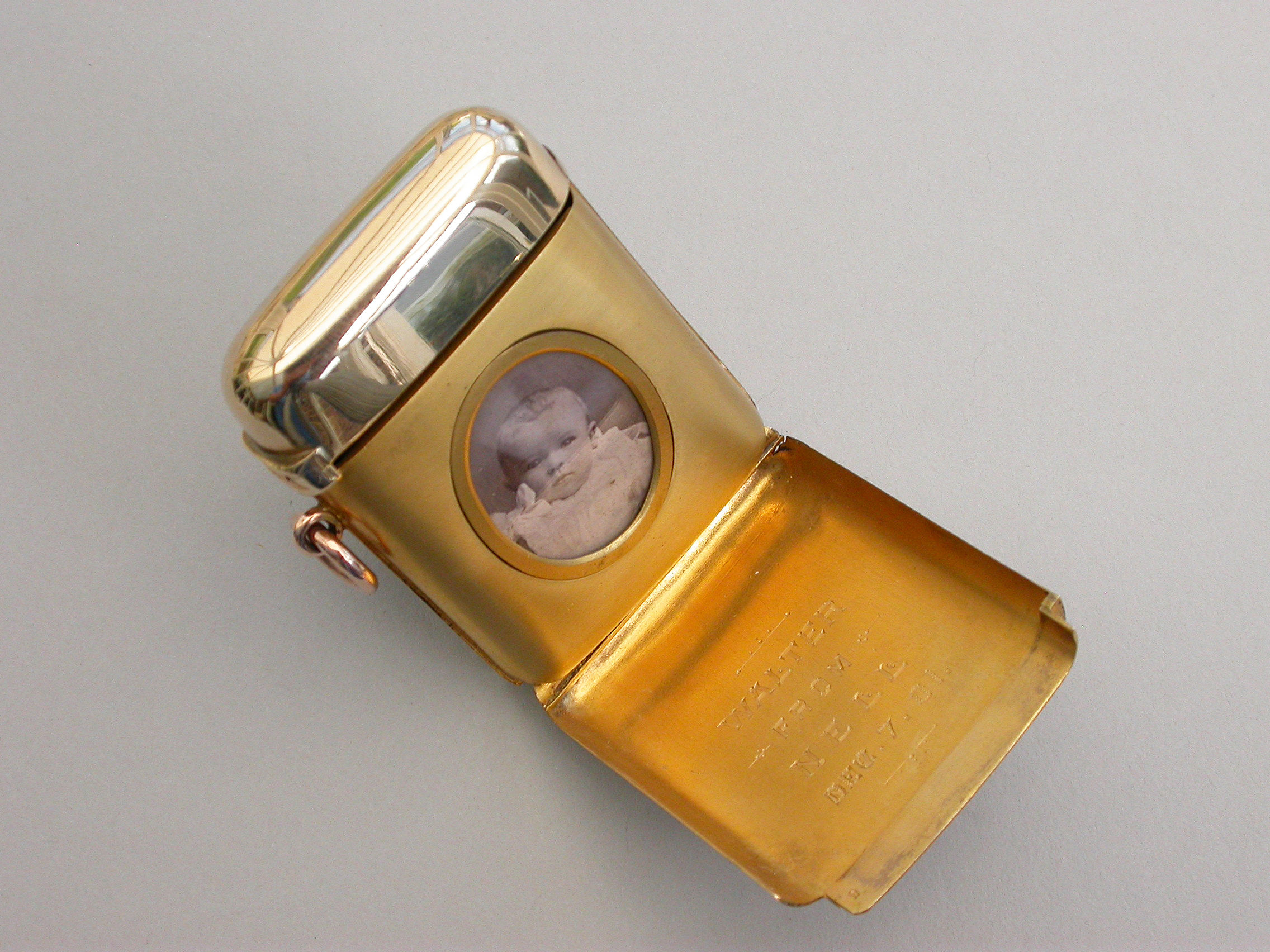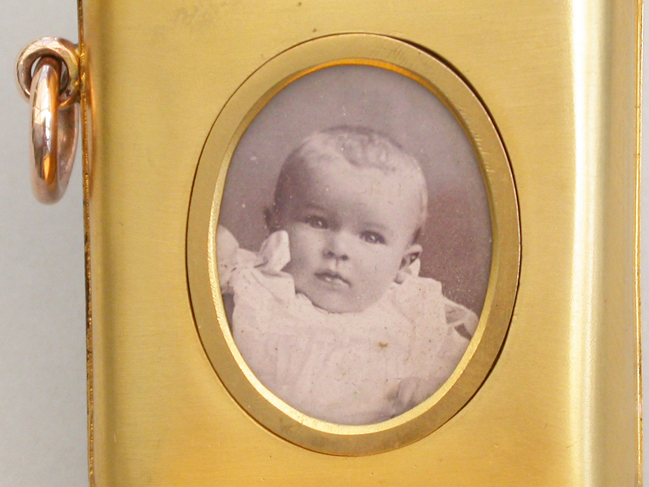 A very fine quality Victorian 9 carat gold Vesta Case of plain rounded rectangular form with sprung hinged lid and attached suspension ring. A second concealed hinge opens a hidden compartment set with a photo frame containing an original sepia photograph of a baby, the interior lid with contemporary presentation inscription.