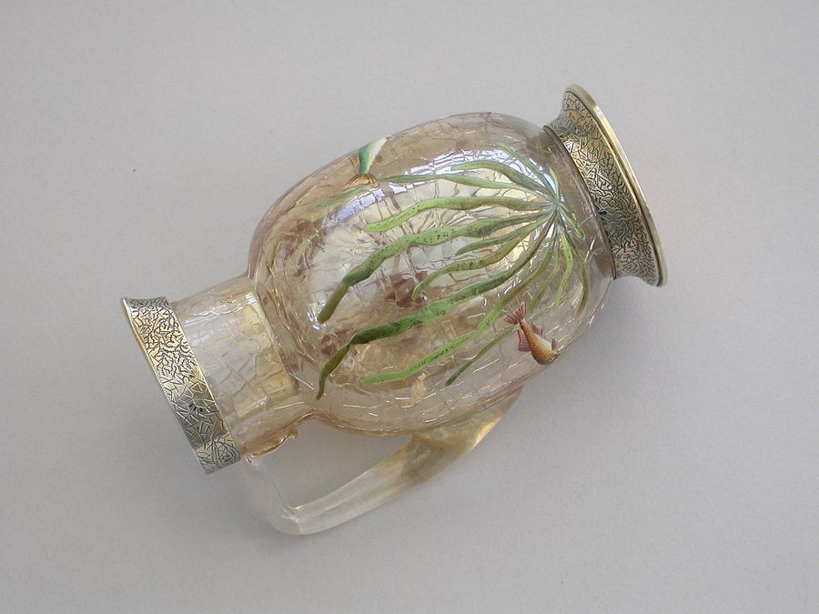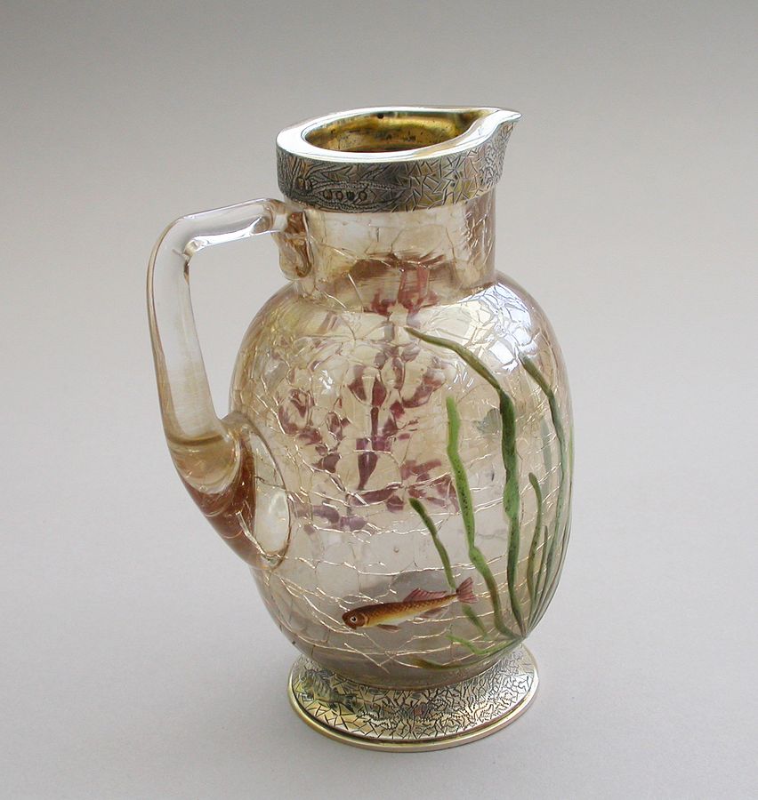 Victorian Aesthetic Movement Silver Gilt Mounted Crackle-Glass & Enamel Cream Jug Fish