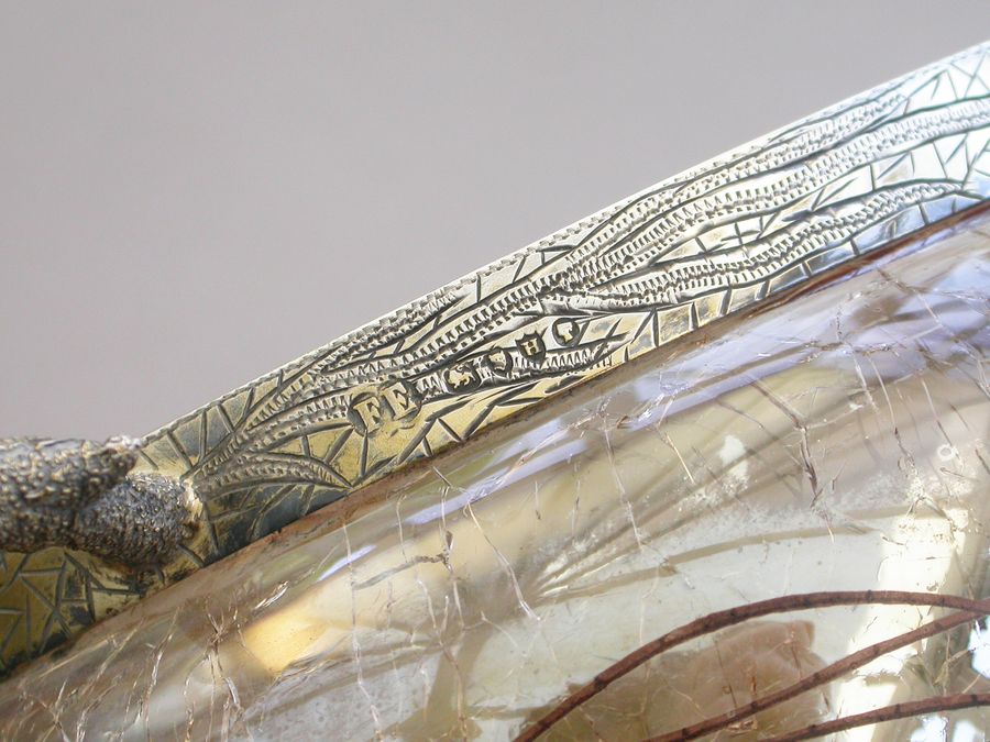 Victorian Aesthetic Movement Silver Gilt Mounted Crackle-Glass & Enamel Sugar Bowl & Sifter Ladle Fish