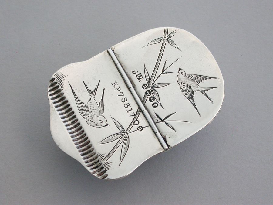 A rare Victorian figural silver Vesta Case made in the form of a Japanese Noh Mask, the reverse decorated in the aesthetic style with birds and foliage, flat hinged lid.
