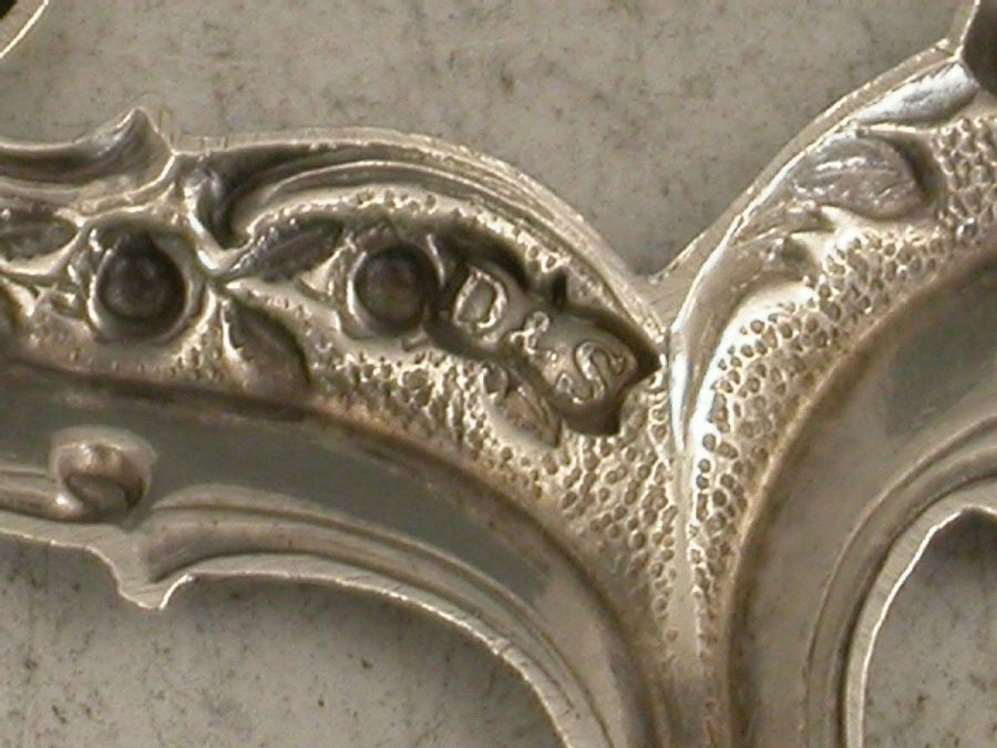 A Victorian die-stamped Provincial silver wine Label in the form of a gothic capital letter 'R' decorated with flowers and scrolls on a matt background.