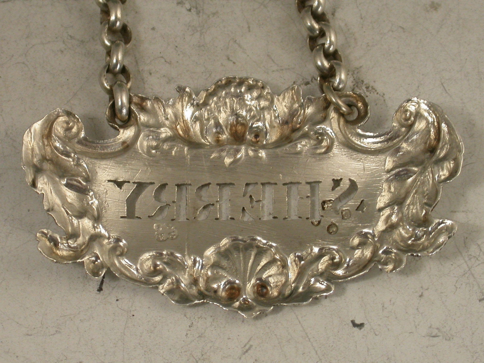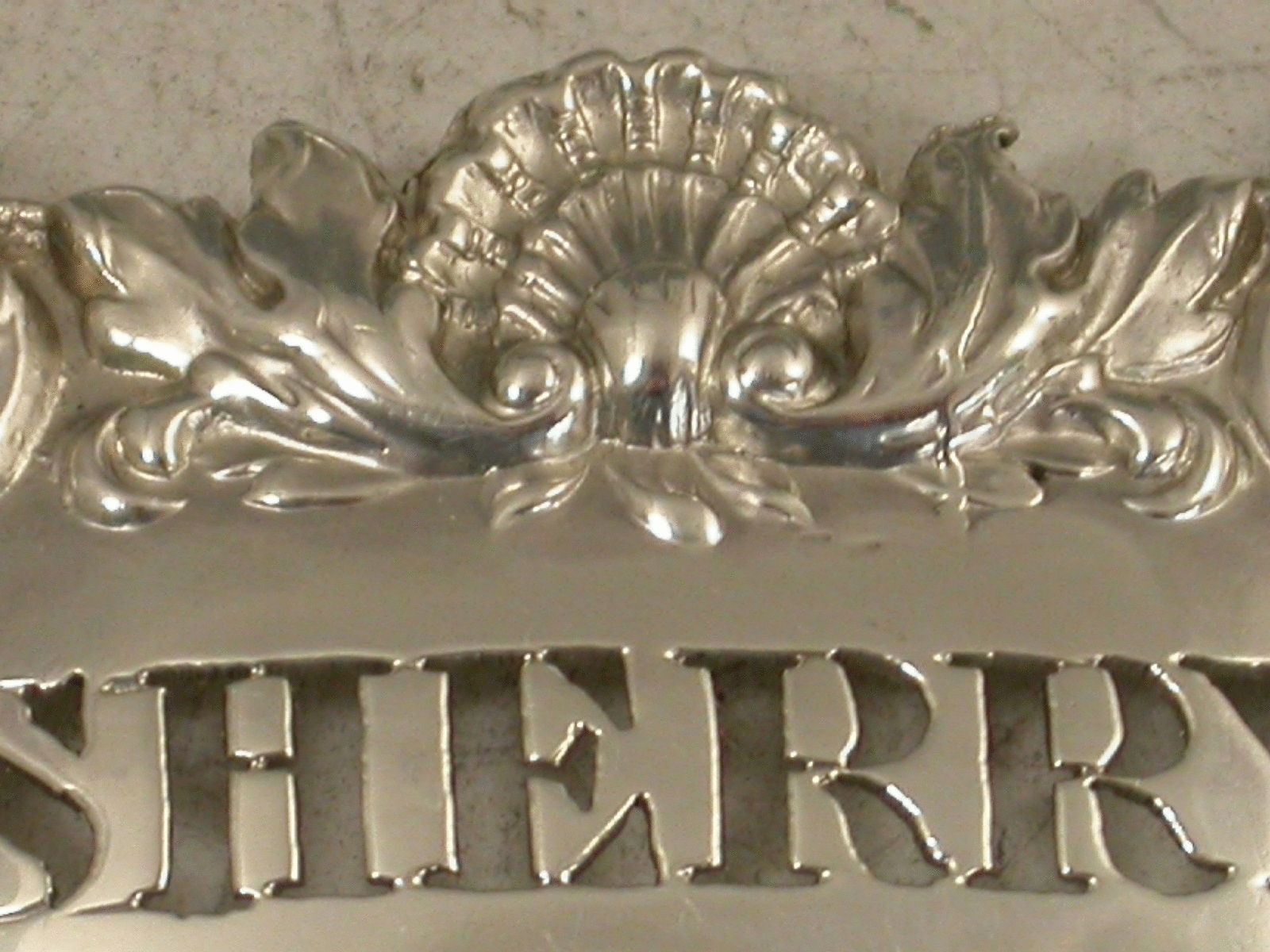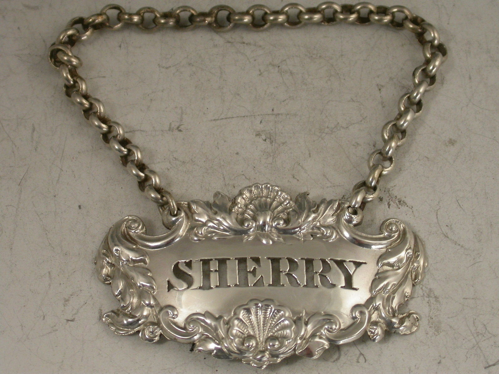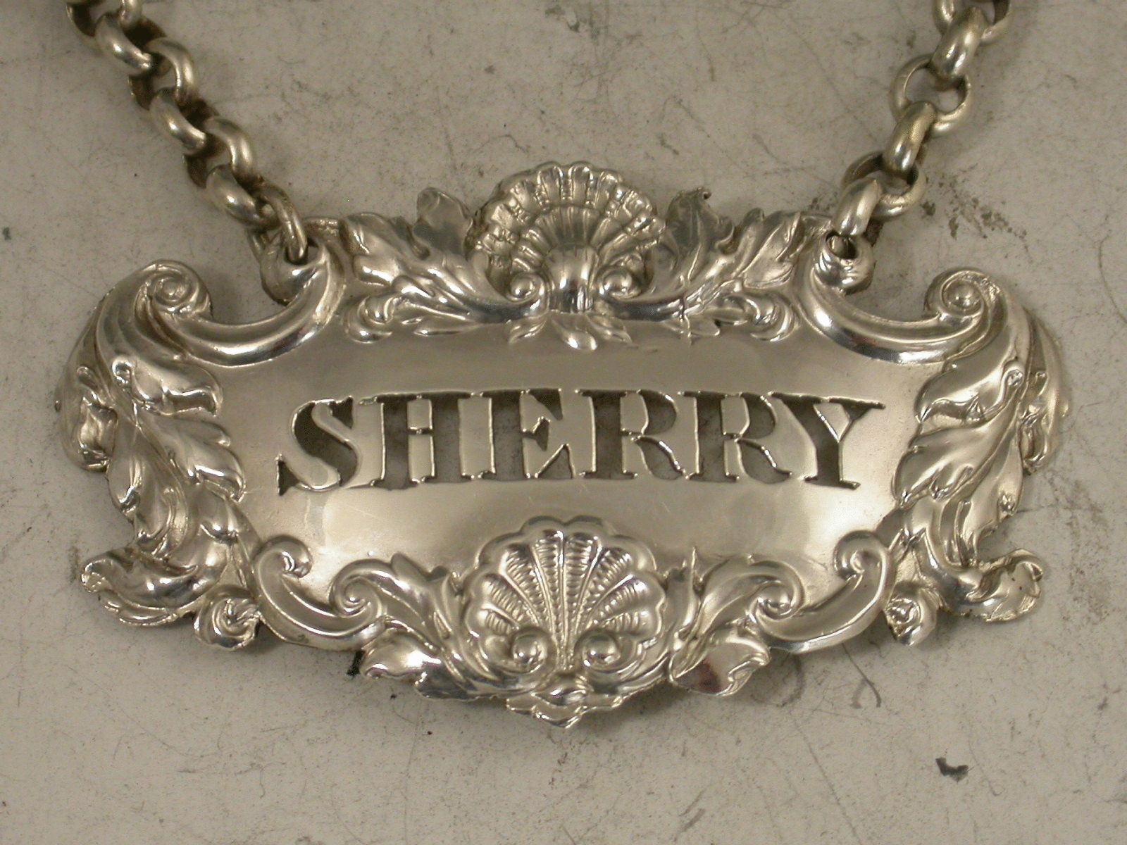 A Victorian die-stamped silver Wine Label of cartouche shape with shell, scroll and acanthus leaf border, pierced for Sherry.