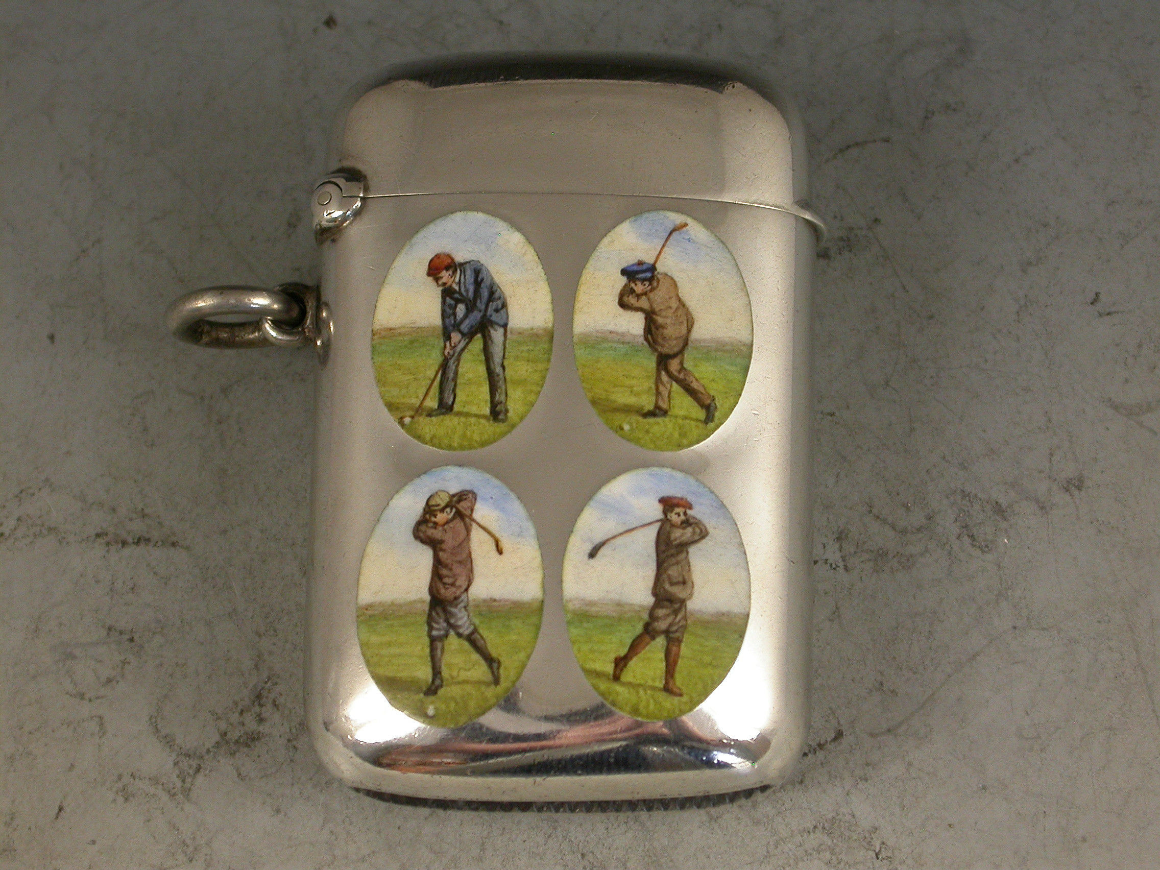 An extremely rare silver and enamel Vesta Case of rounded rectangular form with hinged flip-top lid and attached suspension ring, the face with four oval enamel vignettes depicting period golfers.