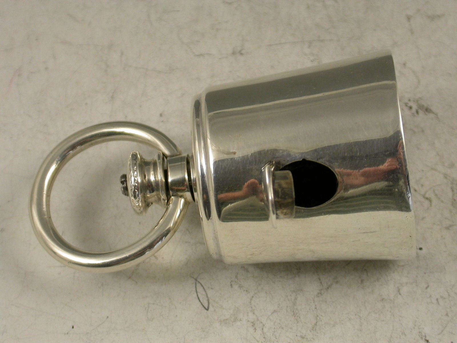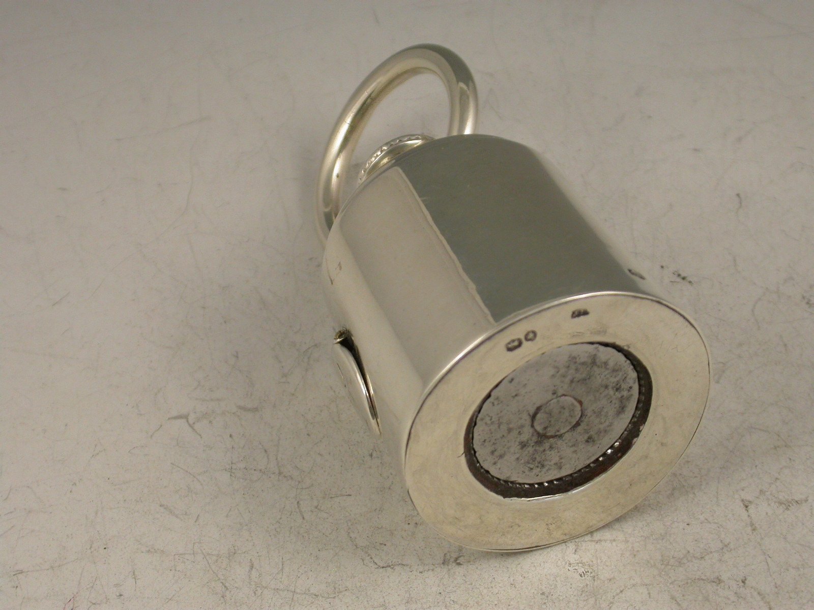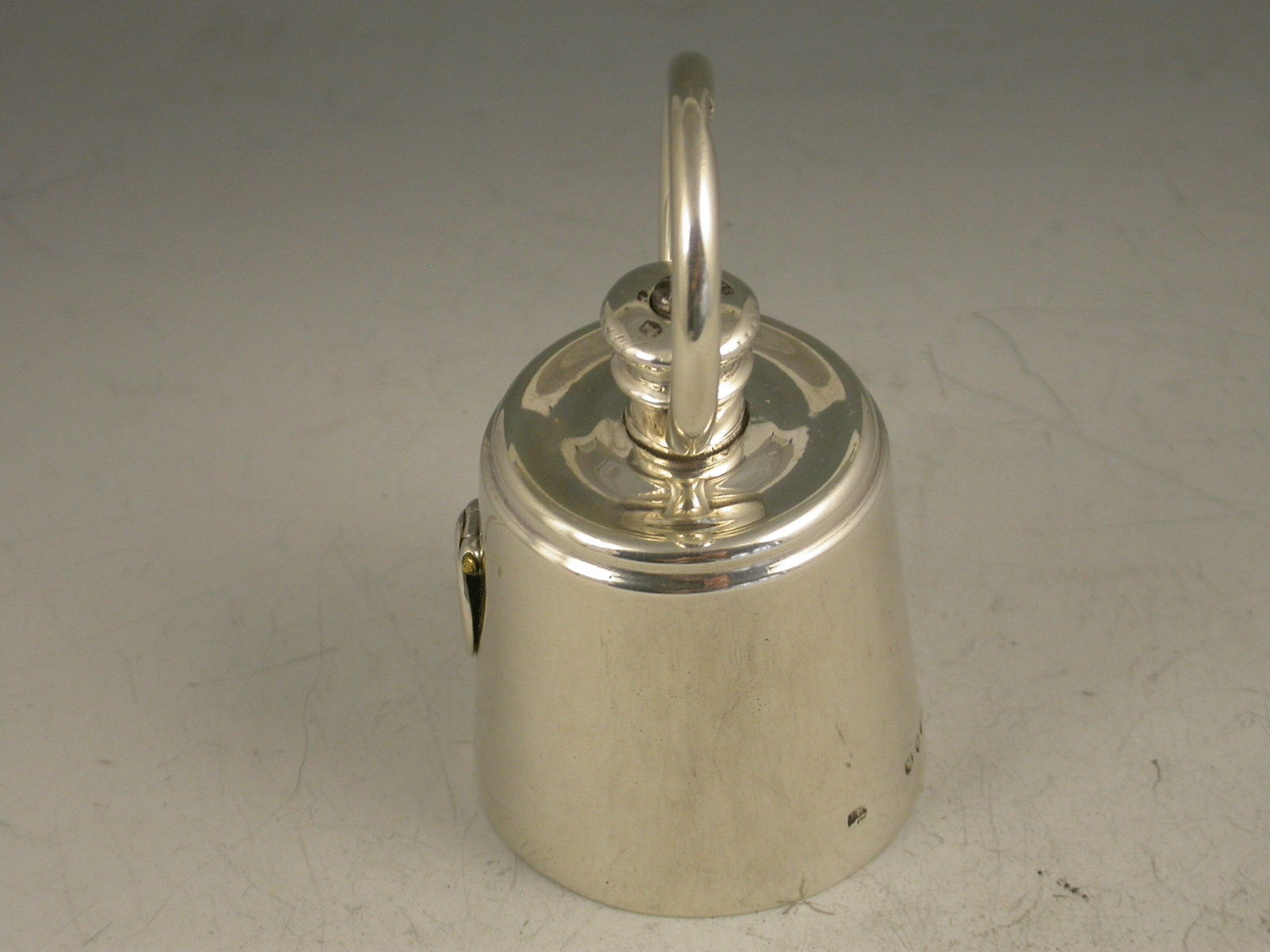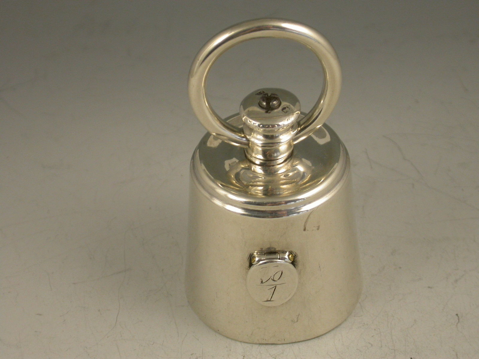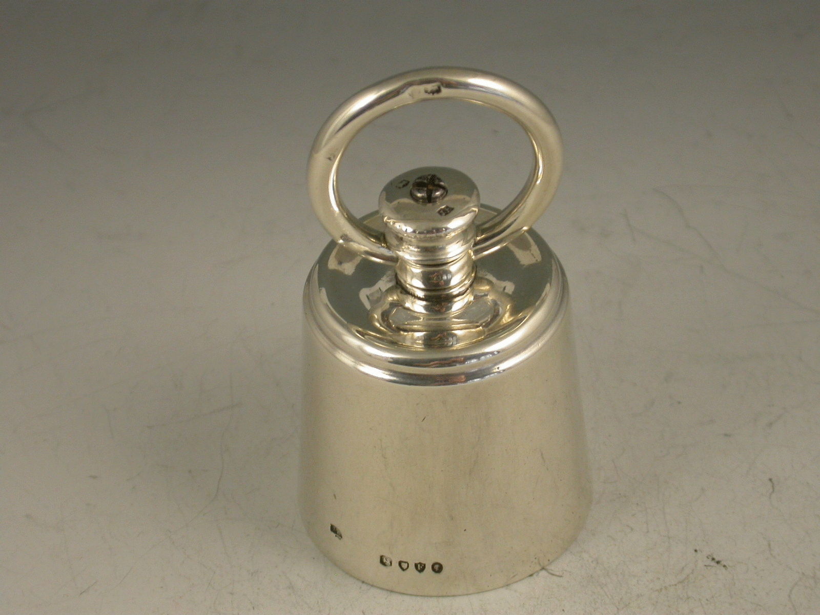 A rare Victorian novelty silver Pepper Grinder in the form of a 1lb weight, with ring handle and small hinged cover to the side for filling, screw off lid and internal steel grinder.