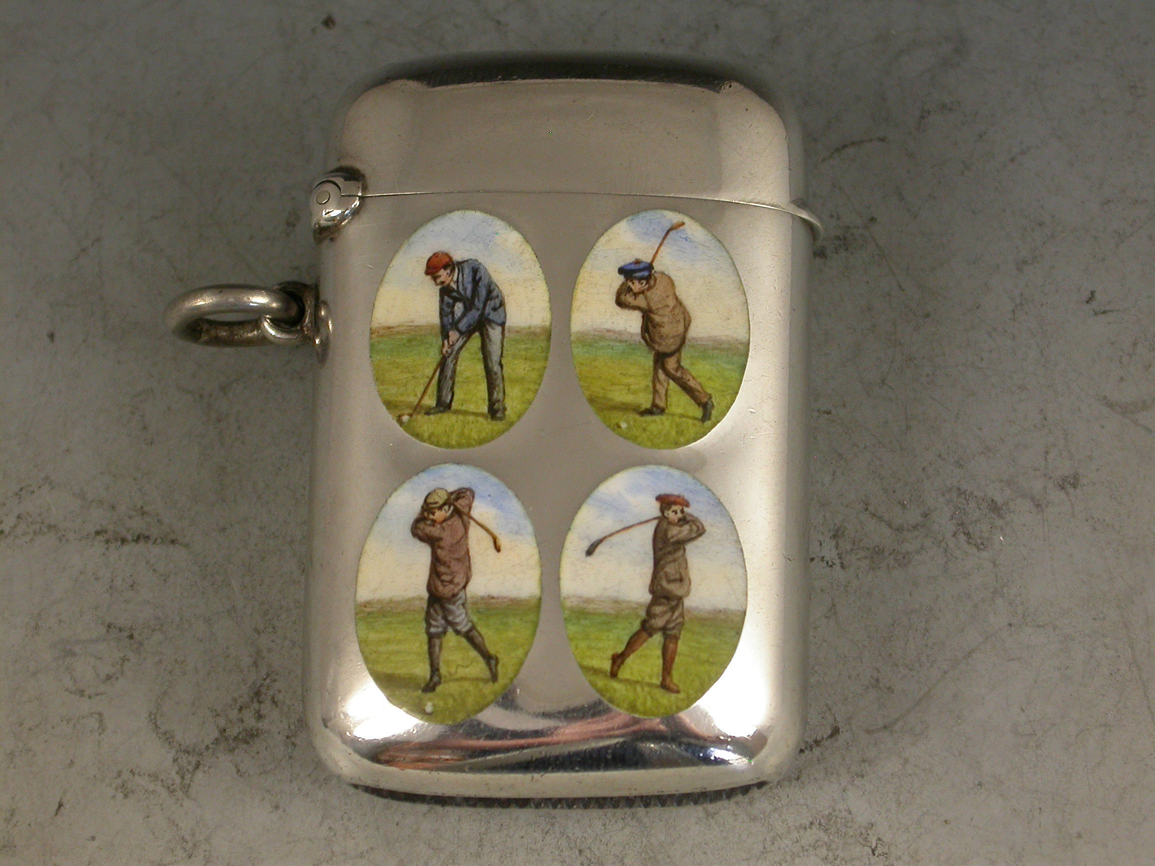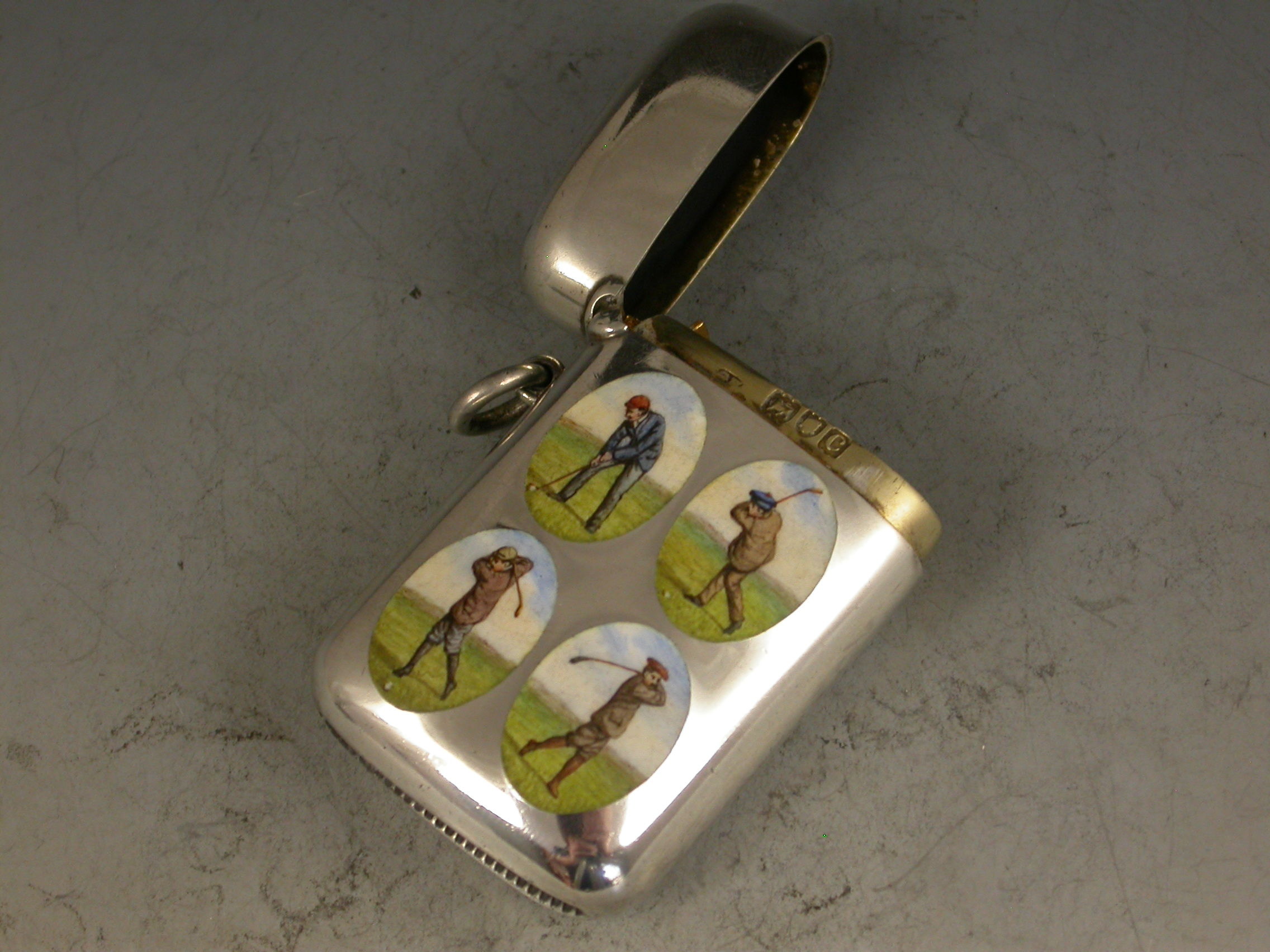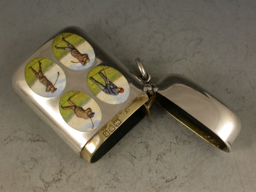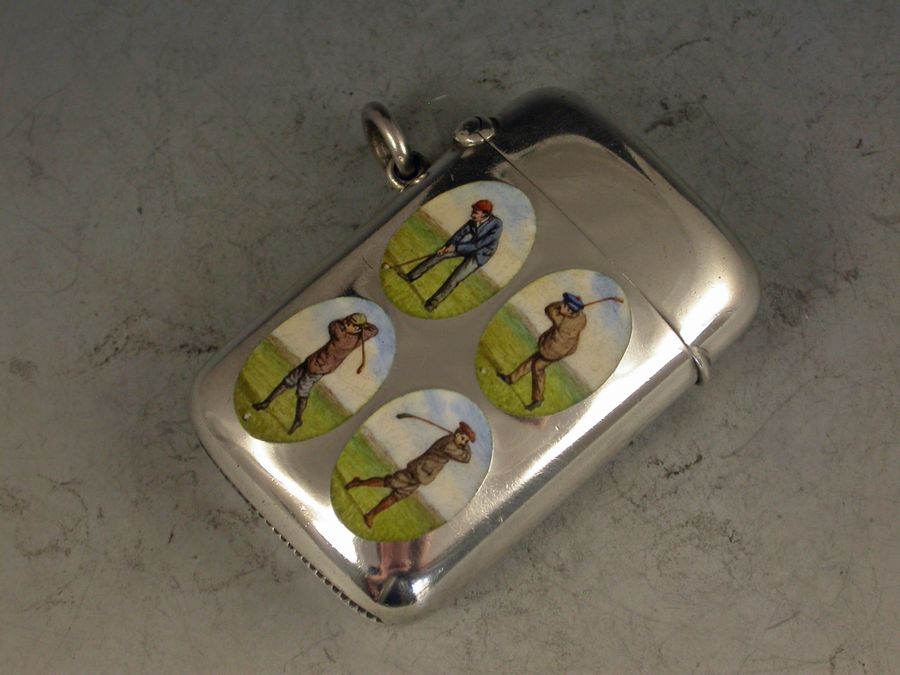 An extremely rare silver and enamel Vesta Case of rounded rectangular form with hinged flip-top lid and attached suspension ring, the face with four oval enamel vignettes depicting period golfers.
