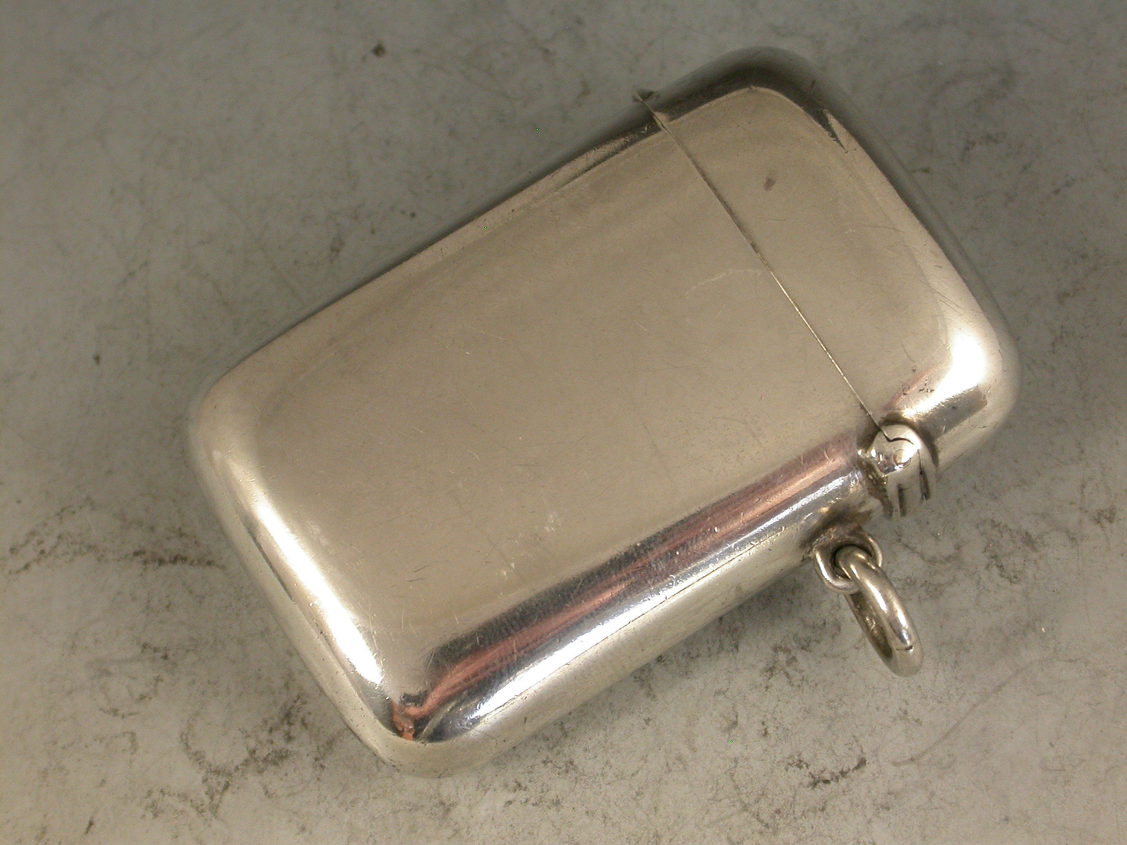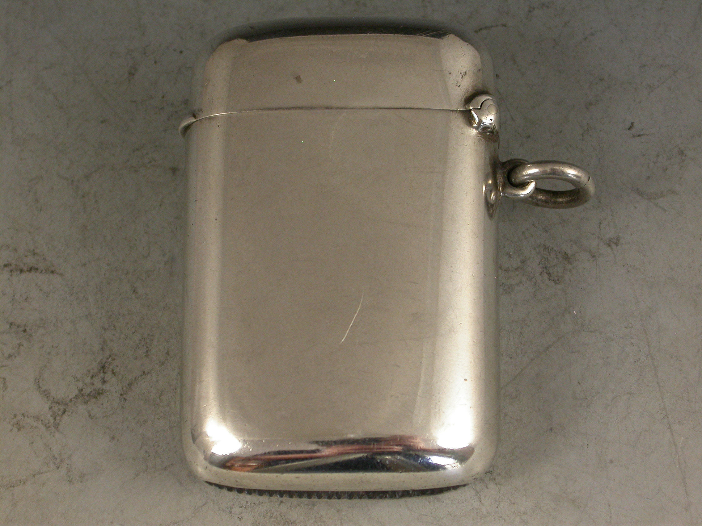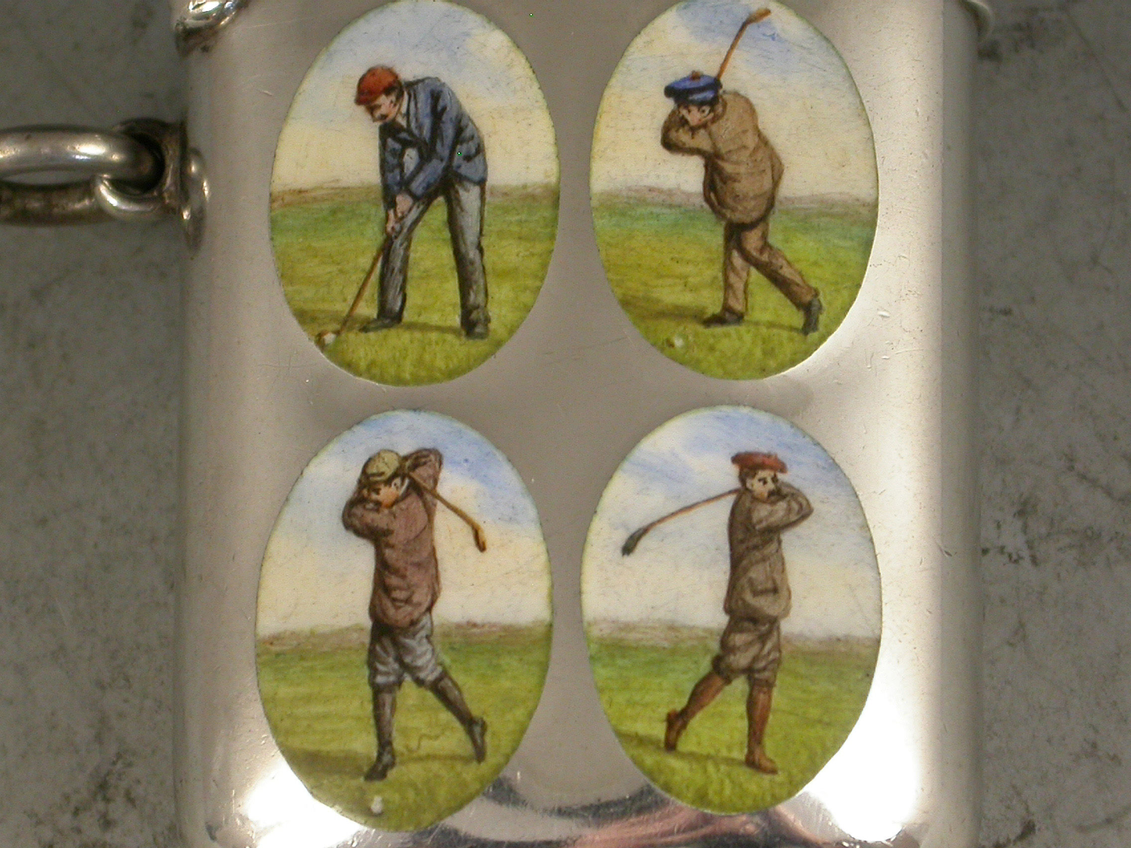 An extremely rare silver and enamel Vesta Case of rounded rectangular form with hinged flip-top lid and attached suspension ring, the face with four oval enamel vignettes depicting period golfers.
