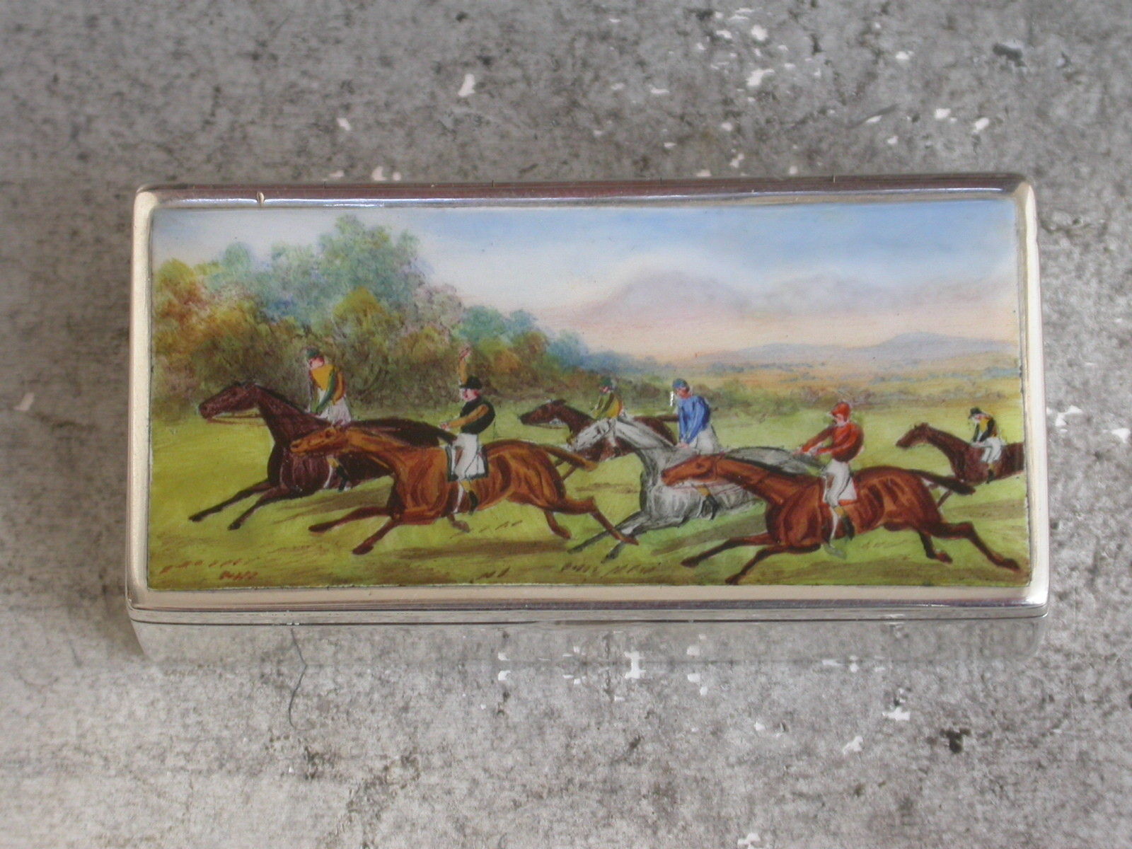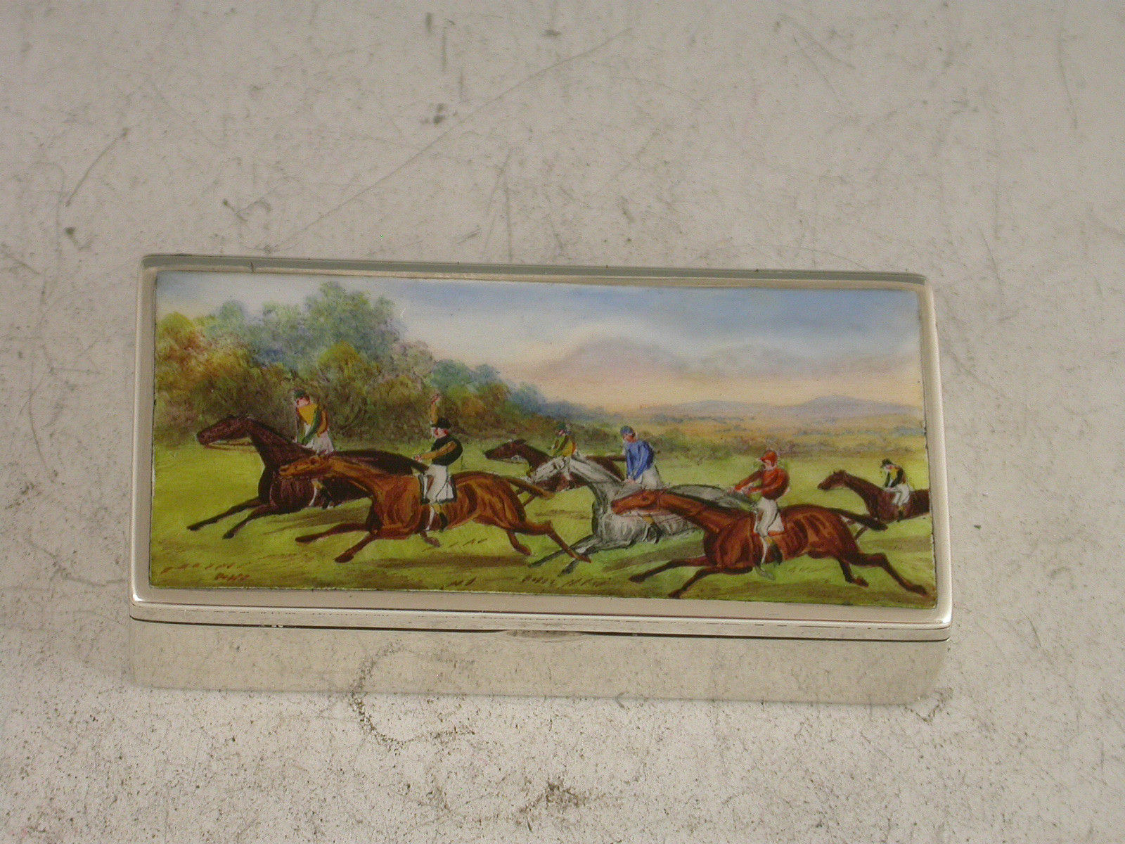 A rare and fine quality Victorian silver Vesta Case of rectangular form with hinged lid and engraved striker to the reverse, the lid inset with an enamel panel depicting a horse racing scene in landscape, silver gilt interior.