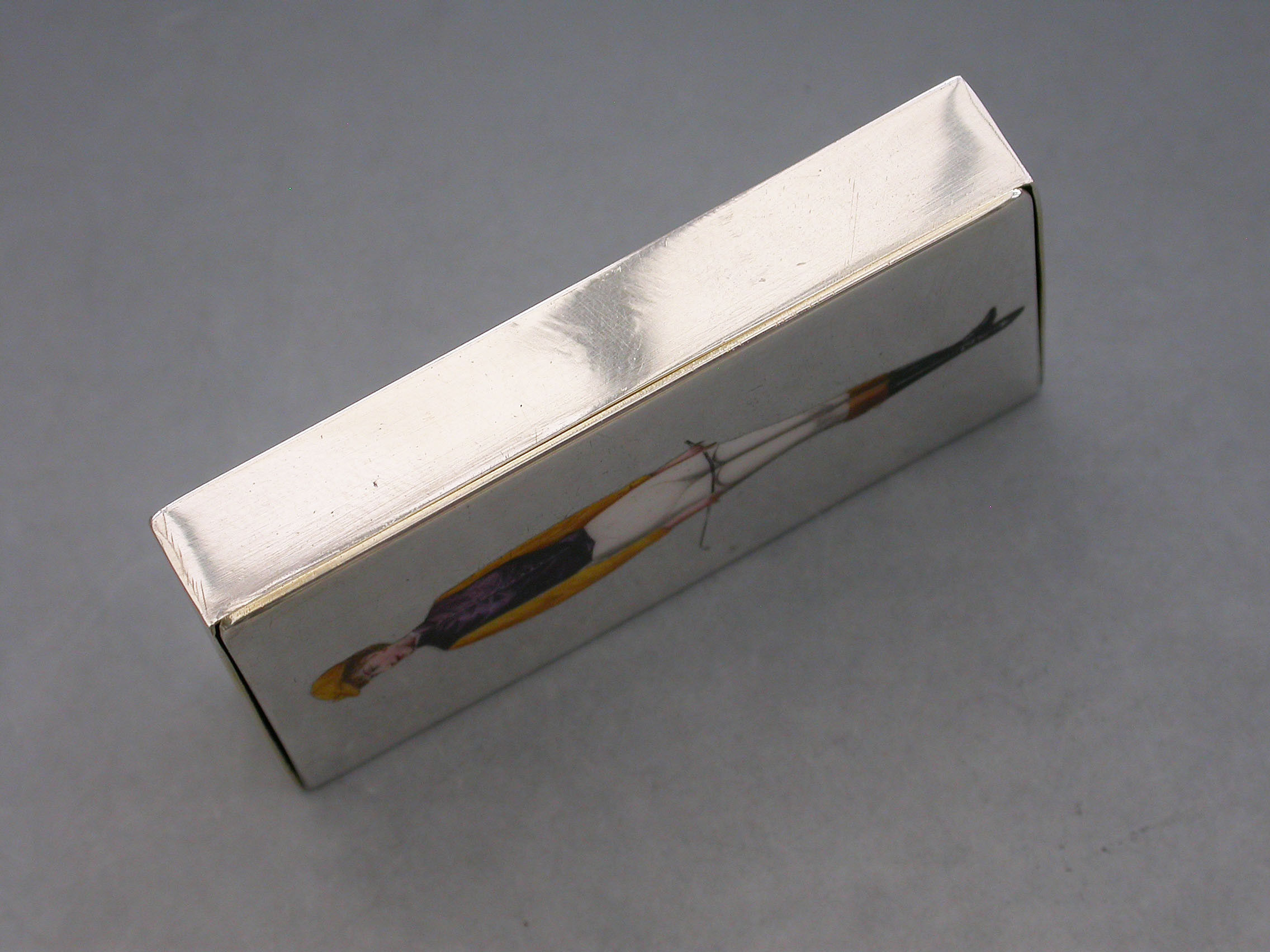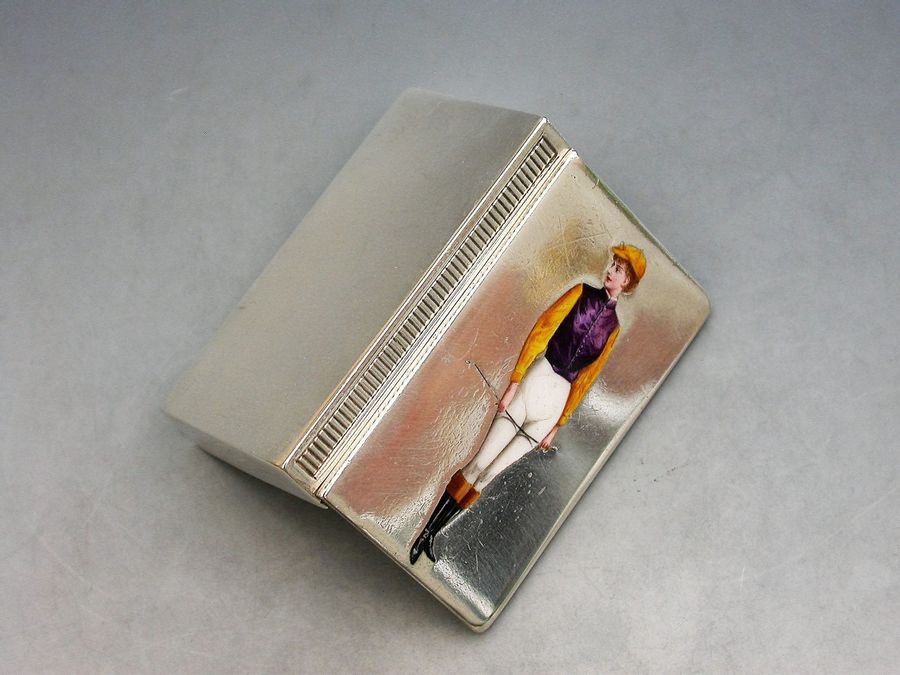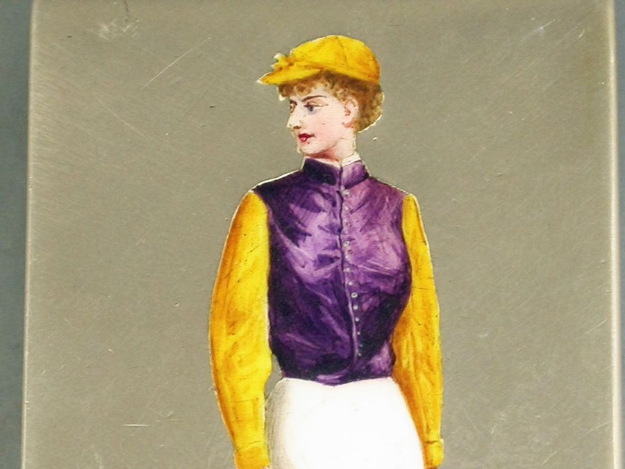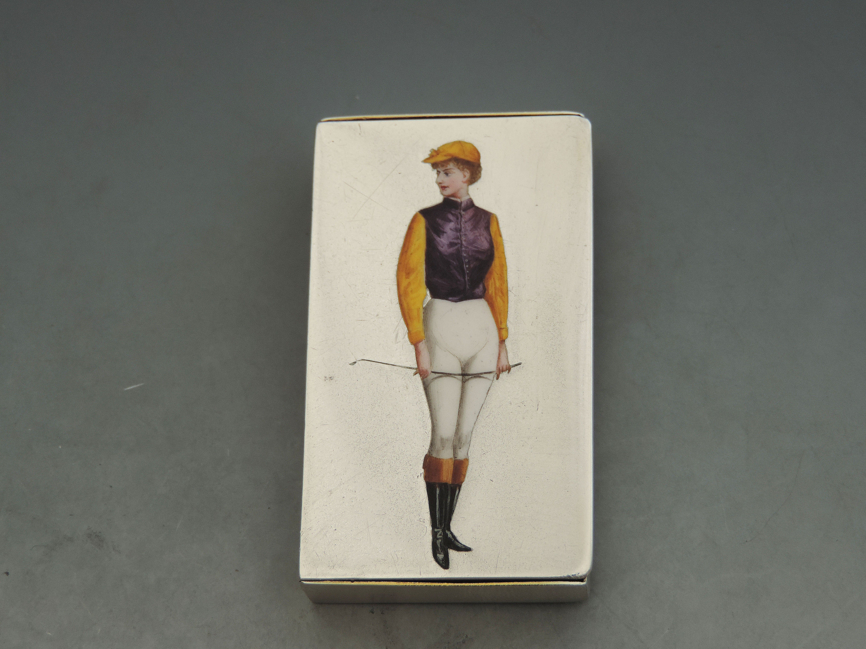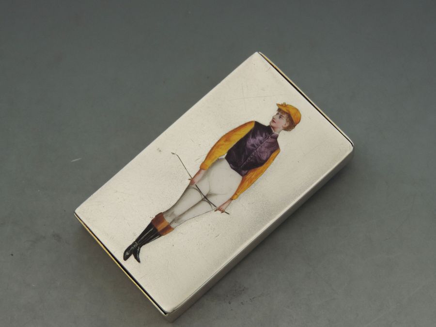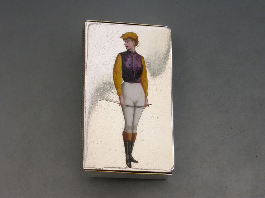 A very fine and extremely rare Victorian silver and enamel Vesta Case of plain rectangular form with hinged lid, the cover enamelled with an image of a lady jockey wearing purple and gold silks.