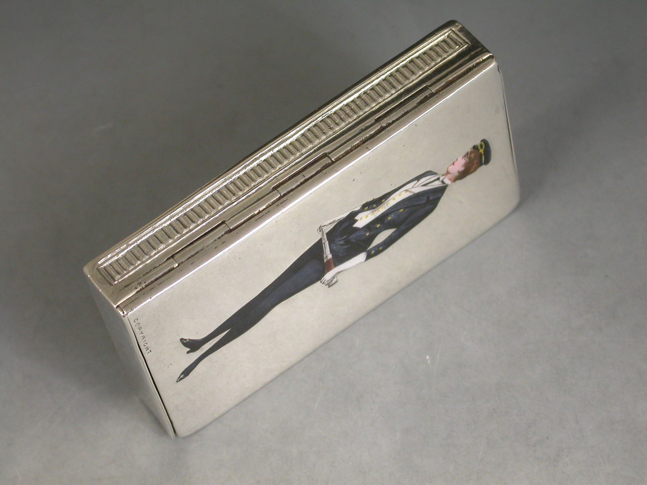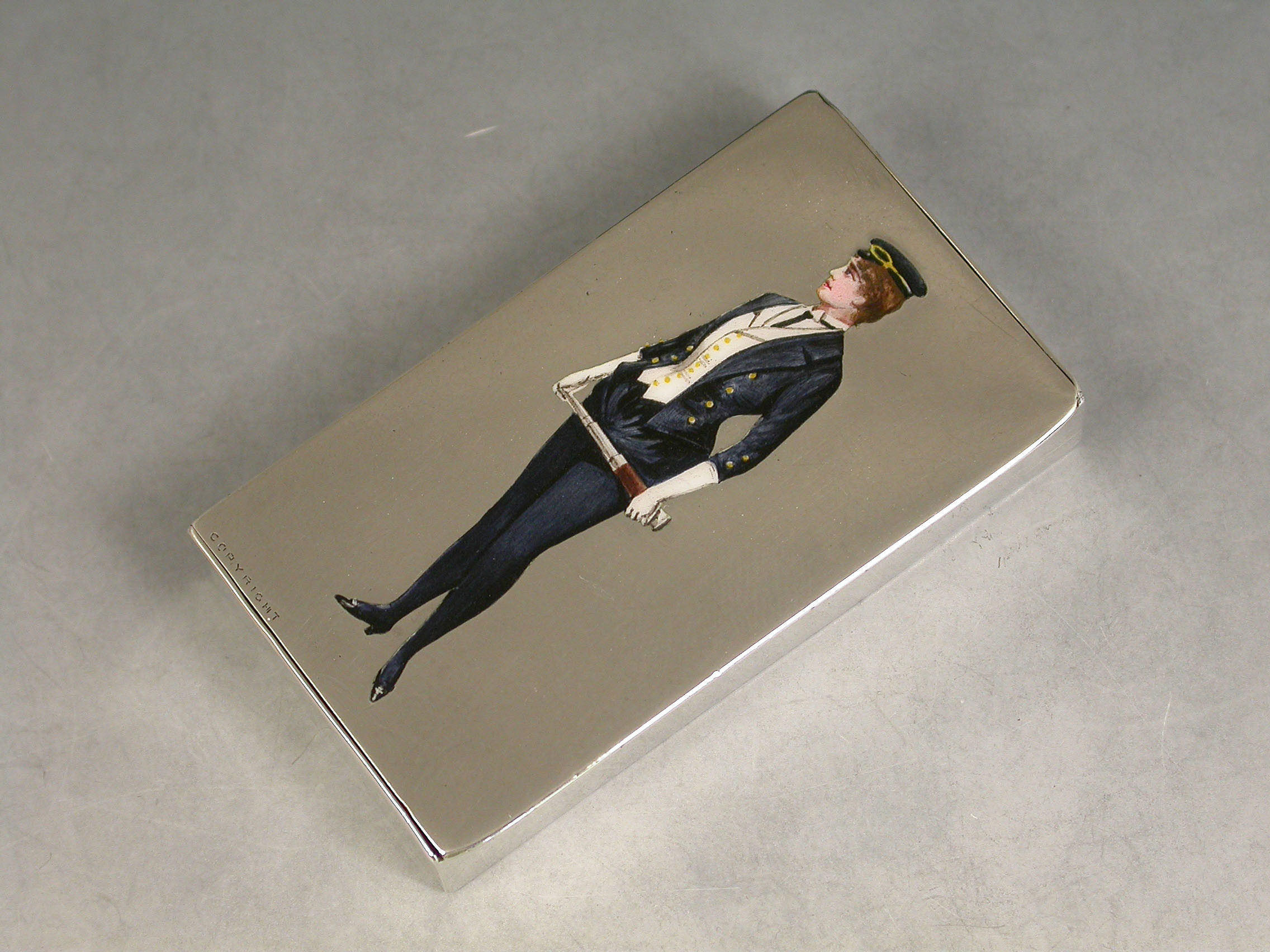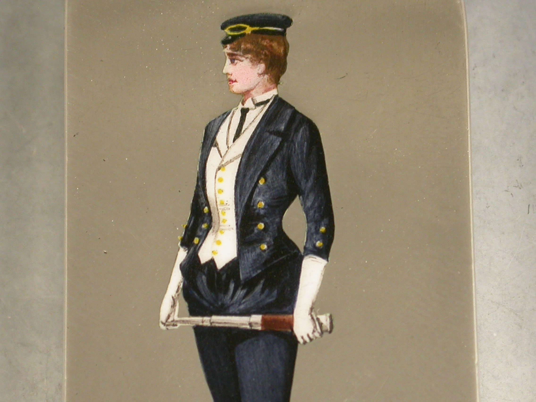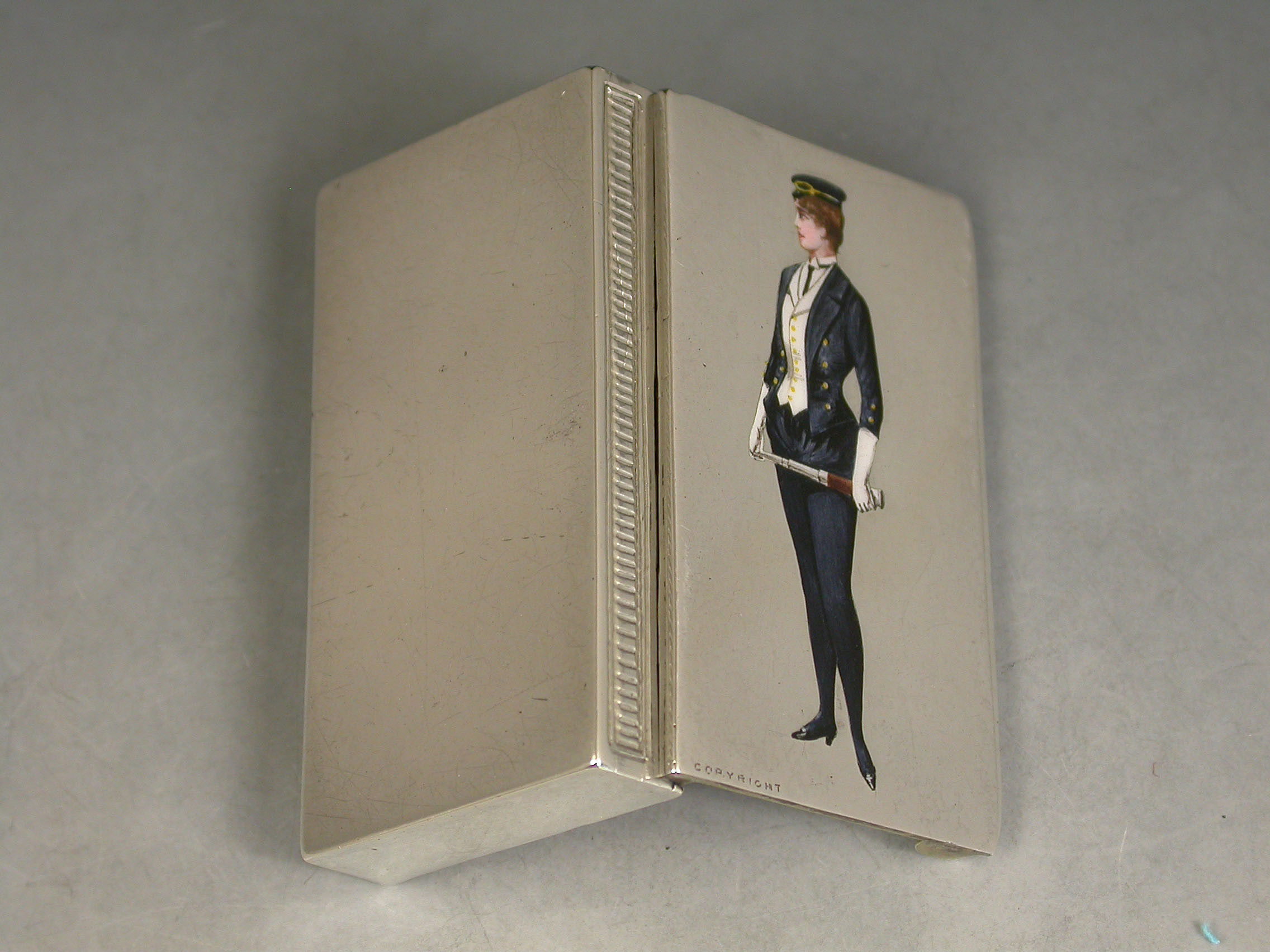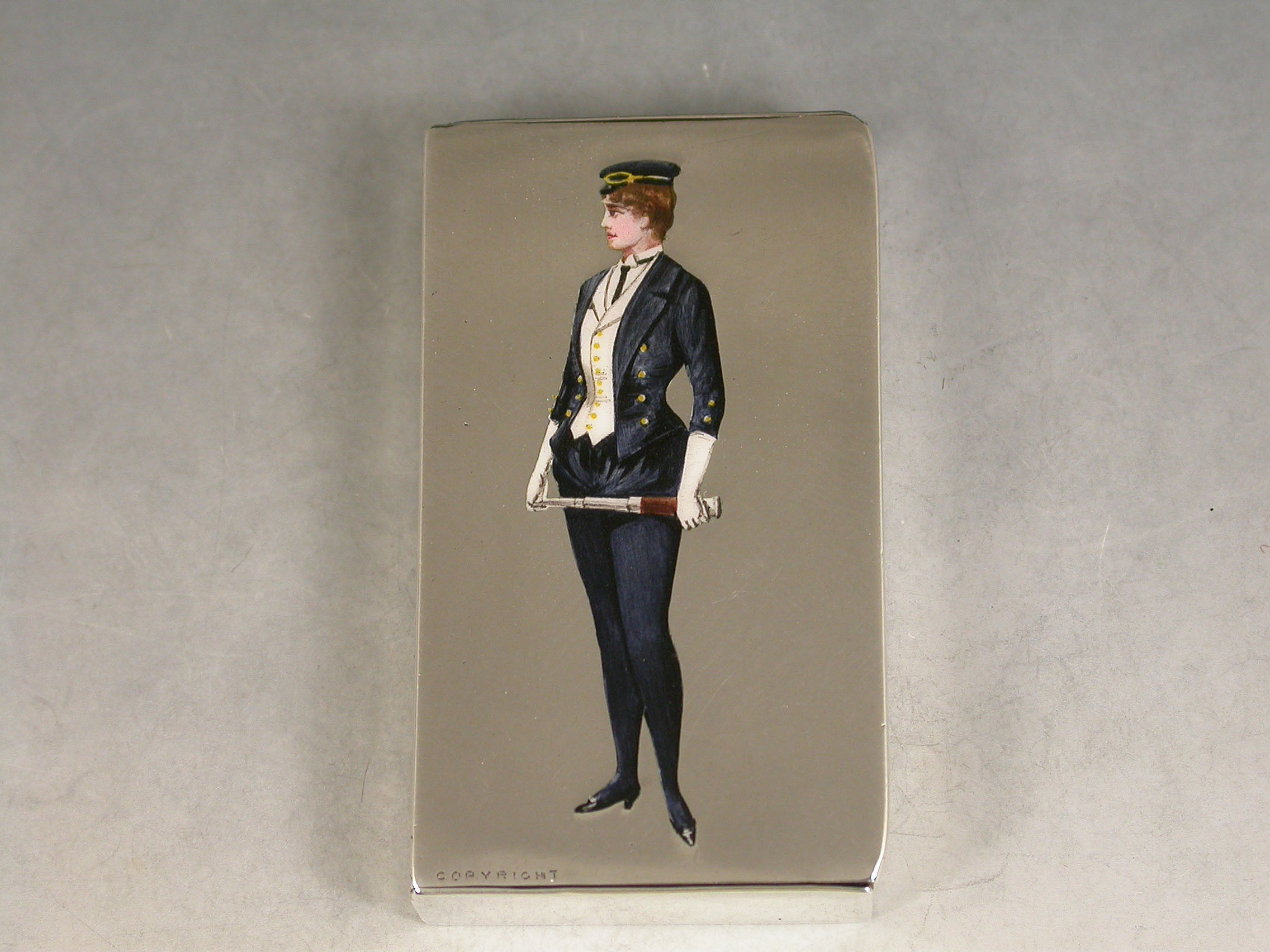 A very fine and extremely rare Victorian silver and enamel Vesta Case of plain rectangular form with hinged lid, the cover enamelled with an image of a lady sailor holding a telescope.