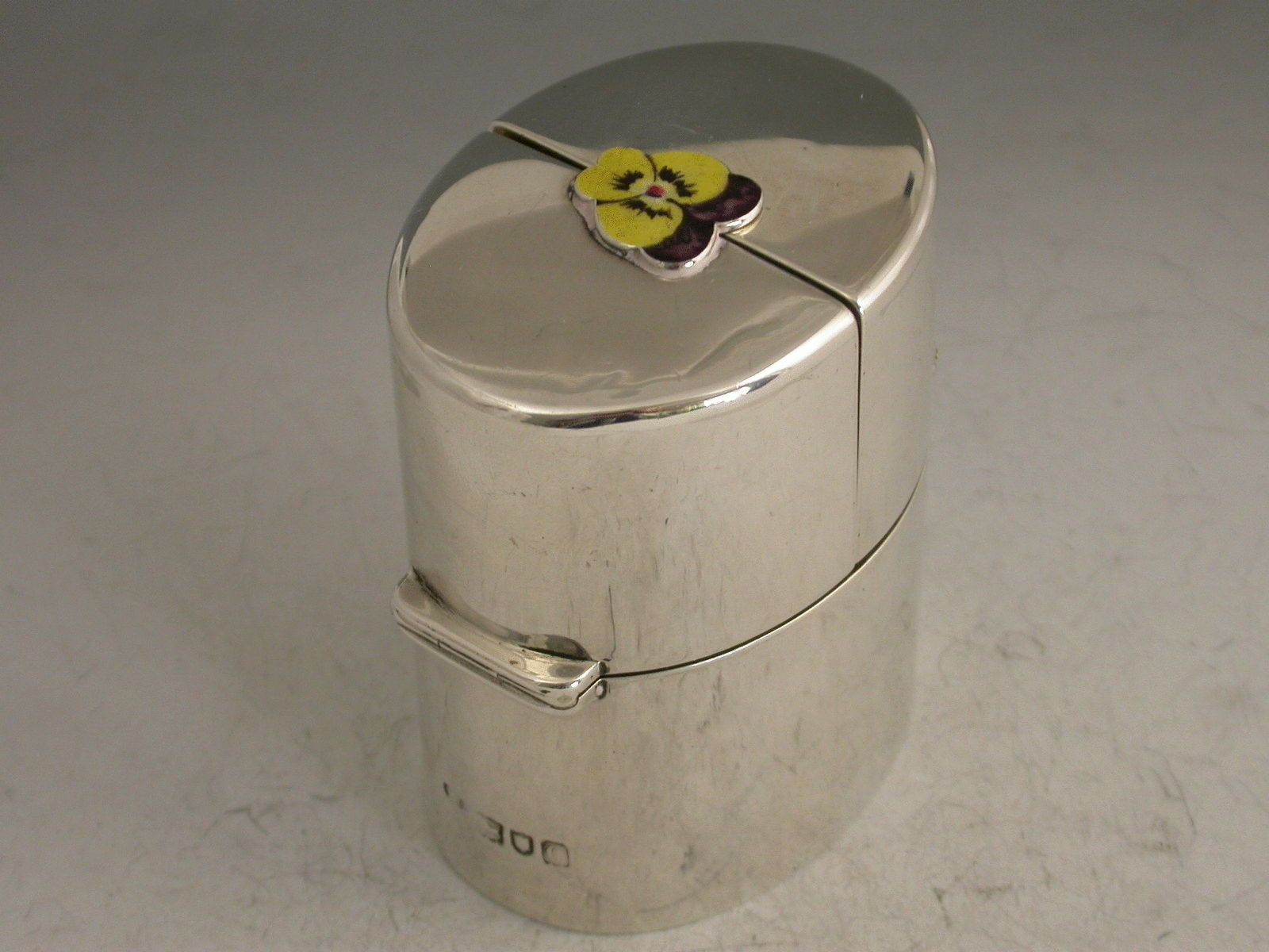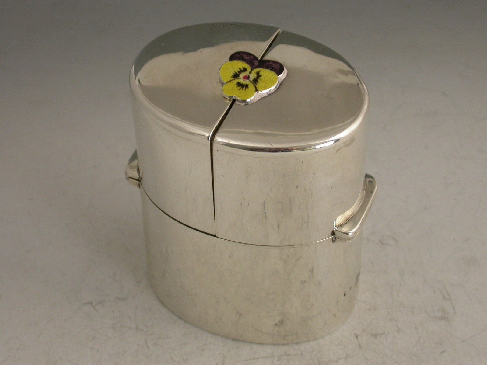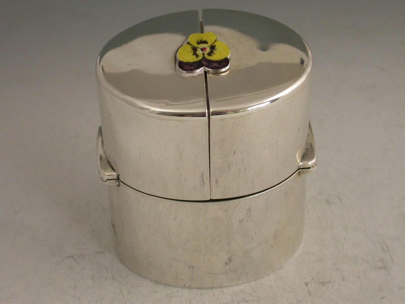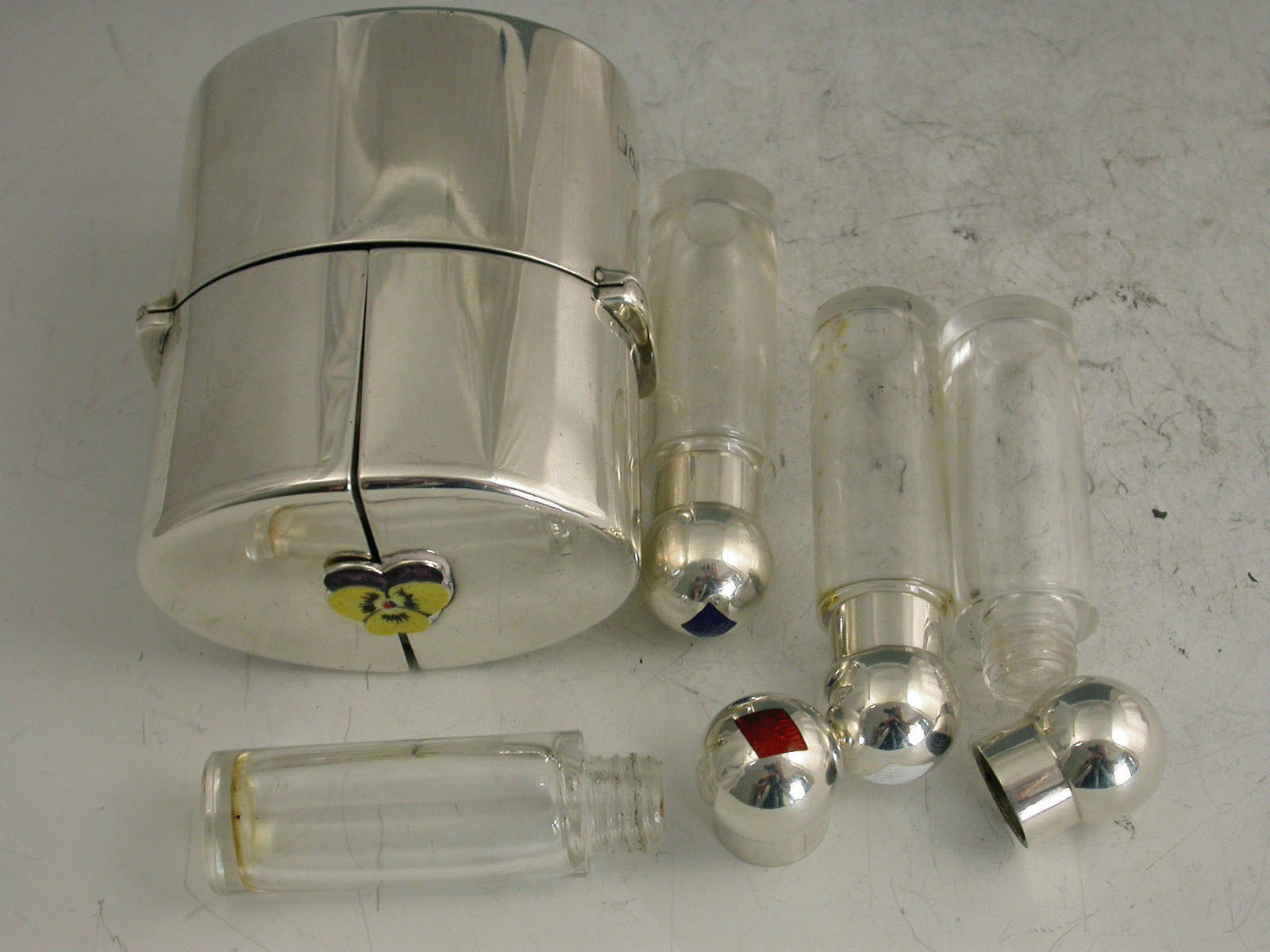 A good quality Victorian silver Scent Bottle Compendium, of oval form with double hinged lid set with an enamelled Pansy clasp, opening to reveal four glass scent bottles, each with a silver screw top enamelled with a coloured diamond for distinction.