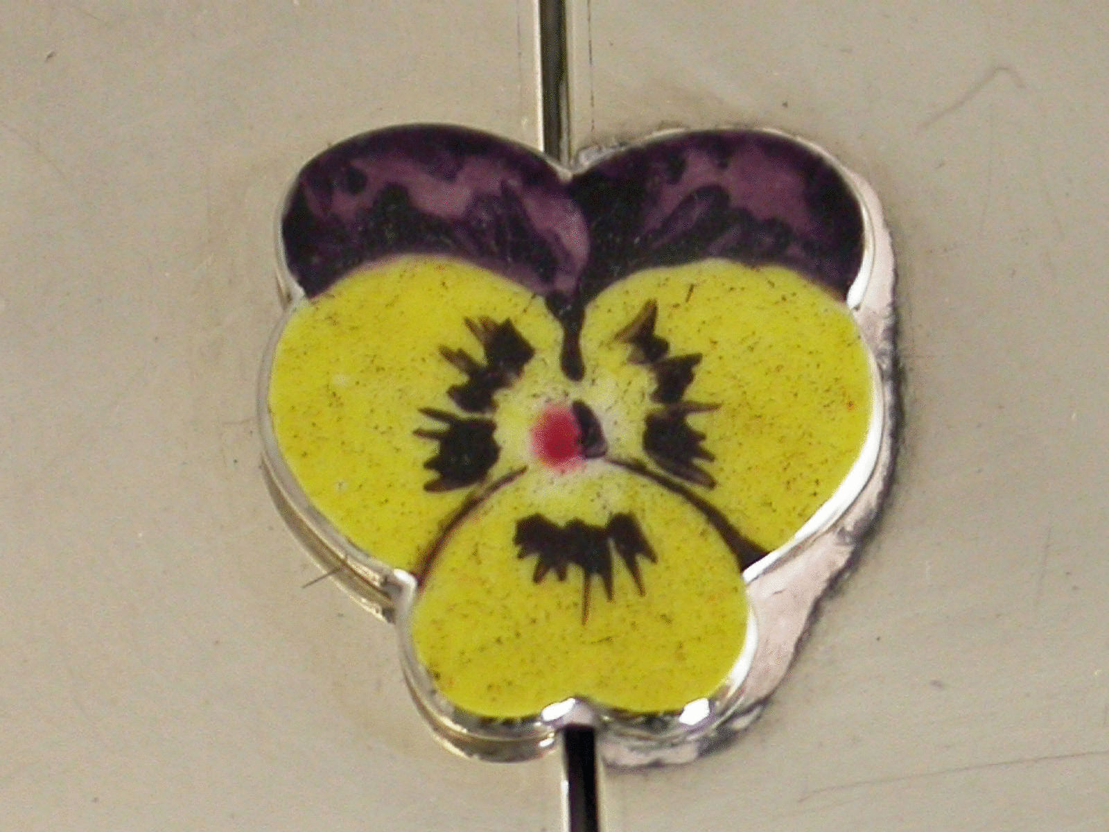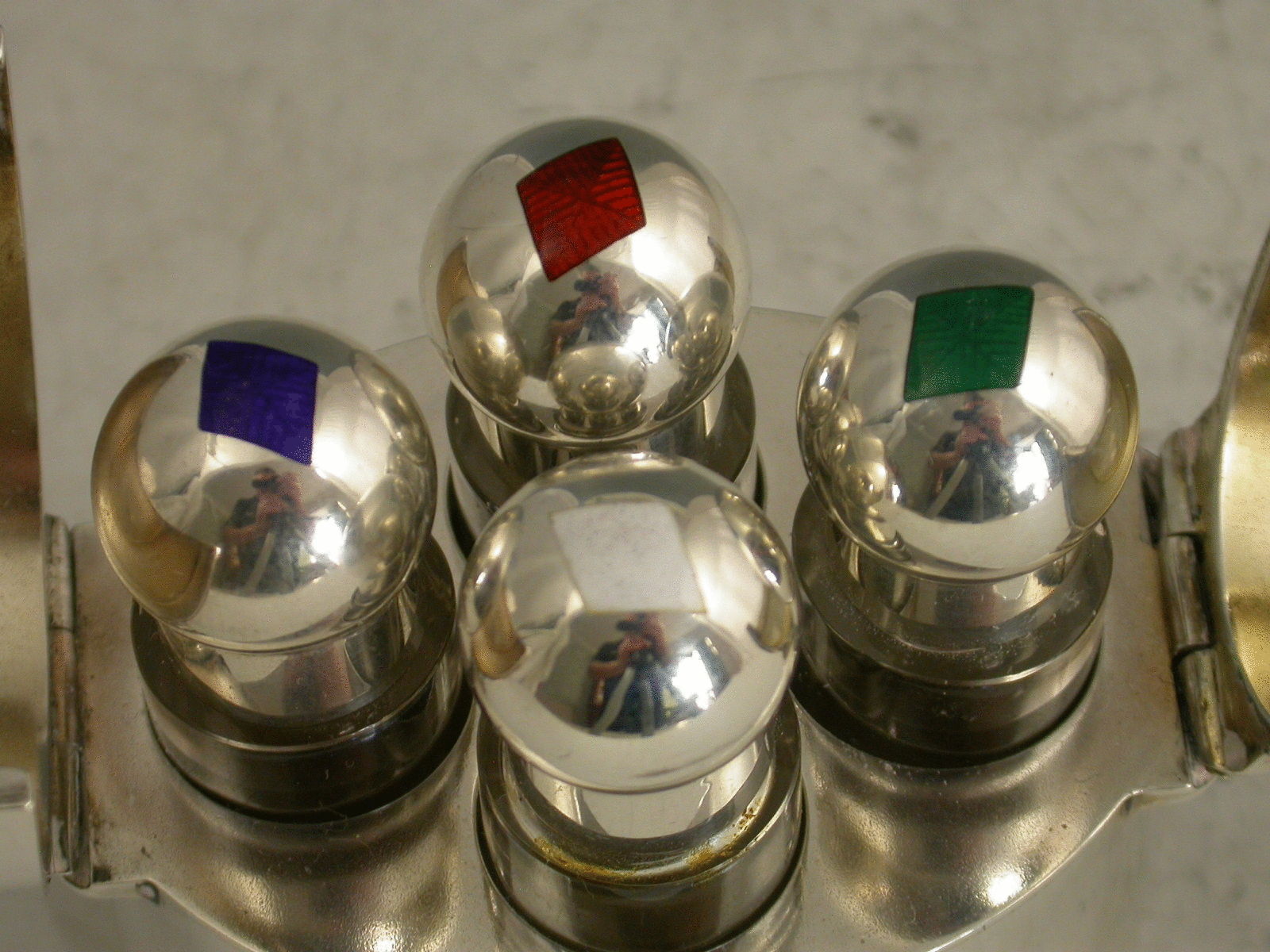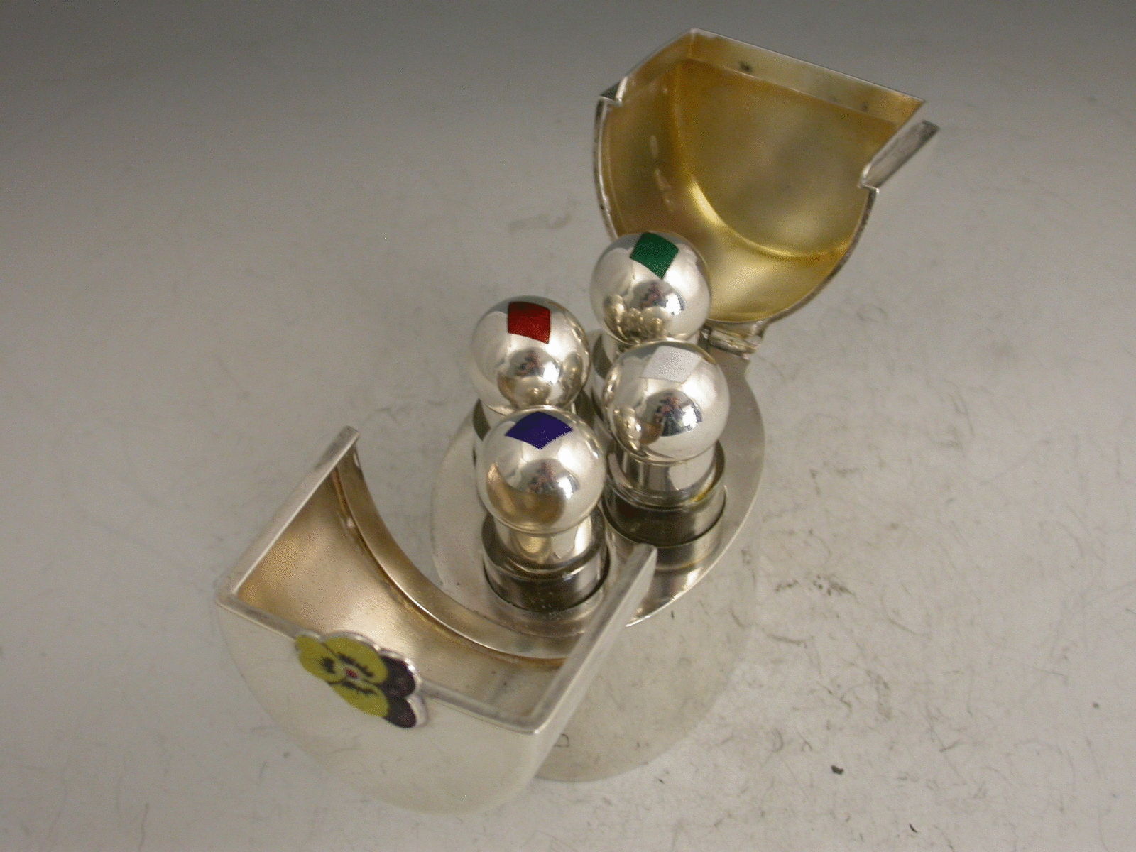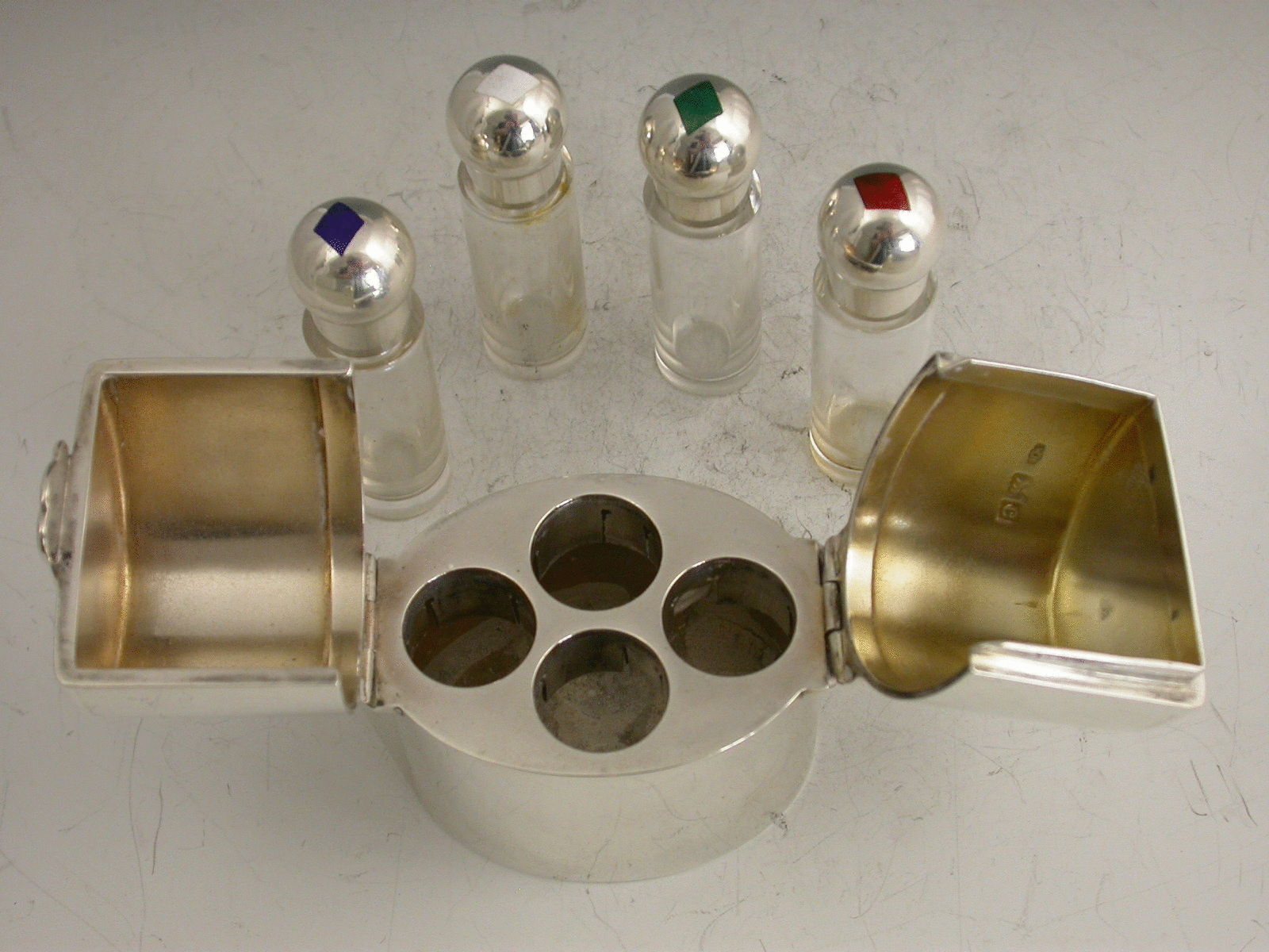 A good quality Victorian silver Scent Bottle Compendium, of oval form with double hinged lid set with an enamelled Pansy clasp, opening to reveal four glass scent bottles, each with a silver screw top enamelled with a coloured diamond for distinction.