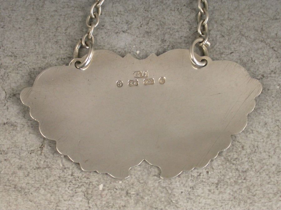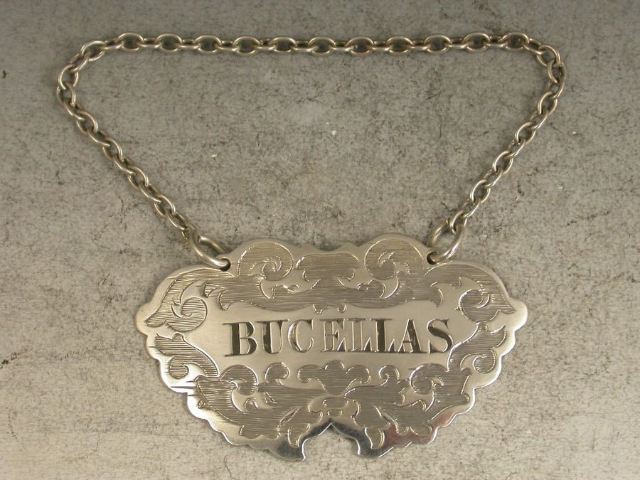 An unusual Victorian silver Wine Label of butterfly or shaped escutcheon form with chased scroll decoration surrounding the title for Bucellas.