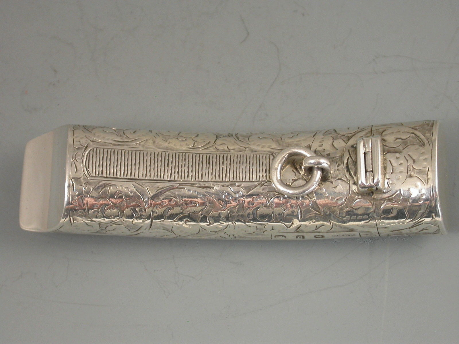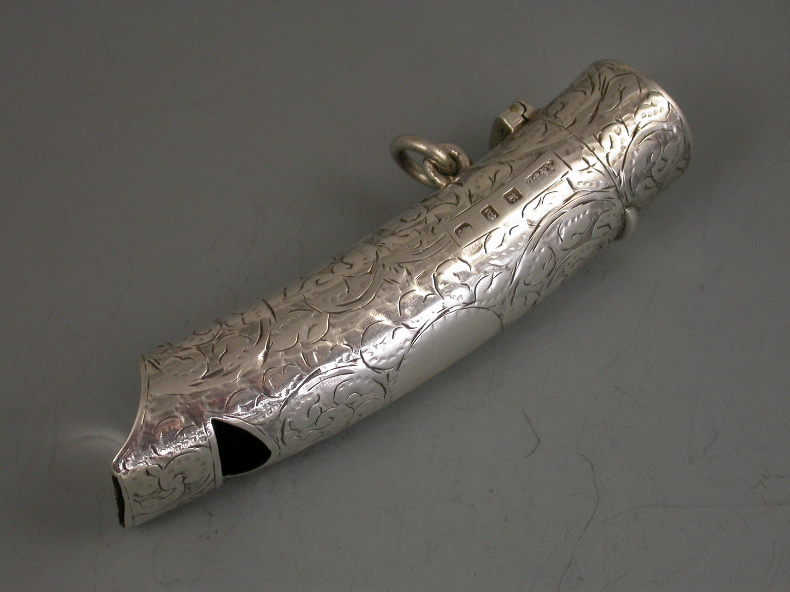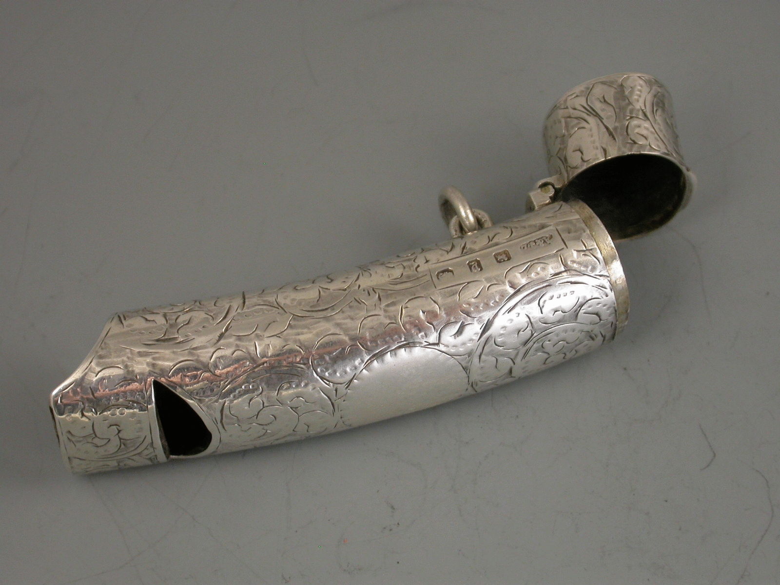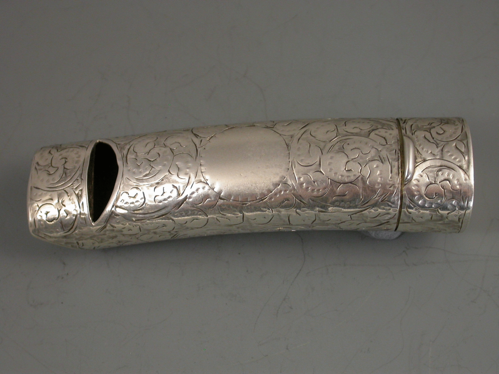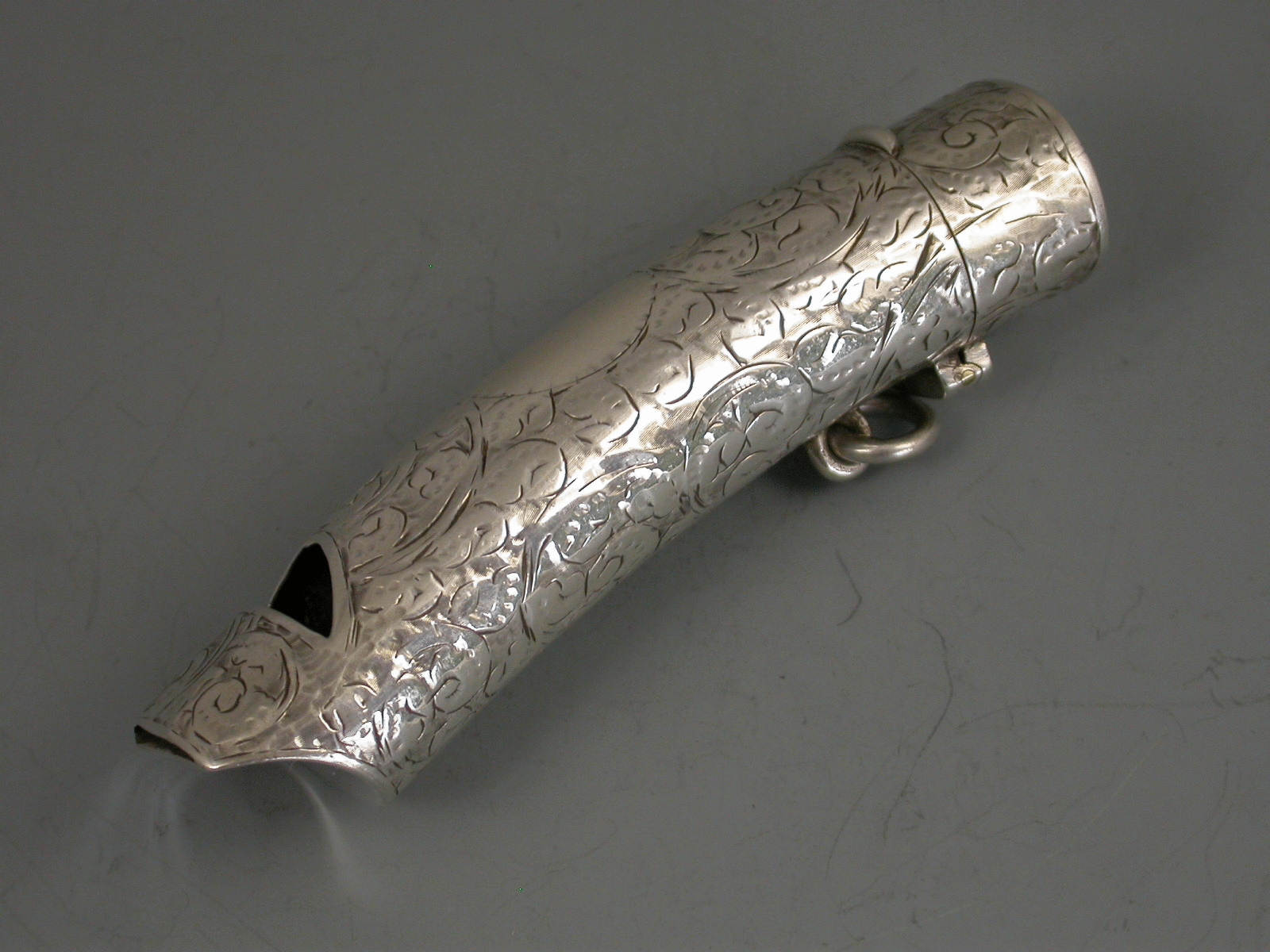 A good Victorian silver combination Vesta Case and Whistle of curved tubular form with hinged flip top lid, the body engraved with foliate scroll decoration and a vacant circular cartouche.