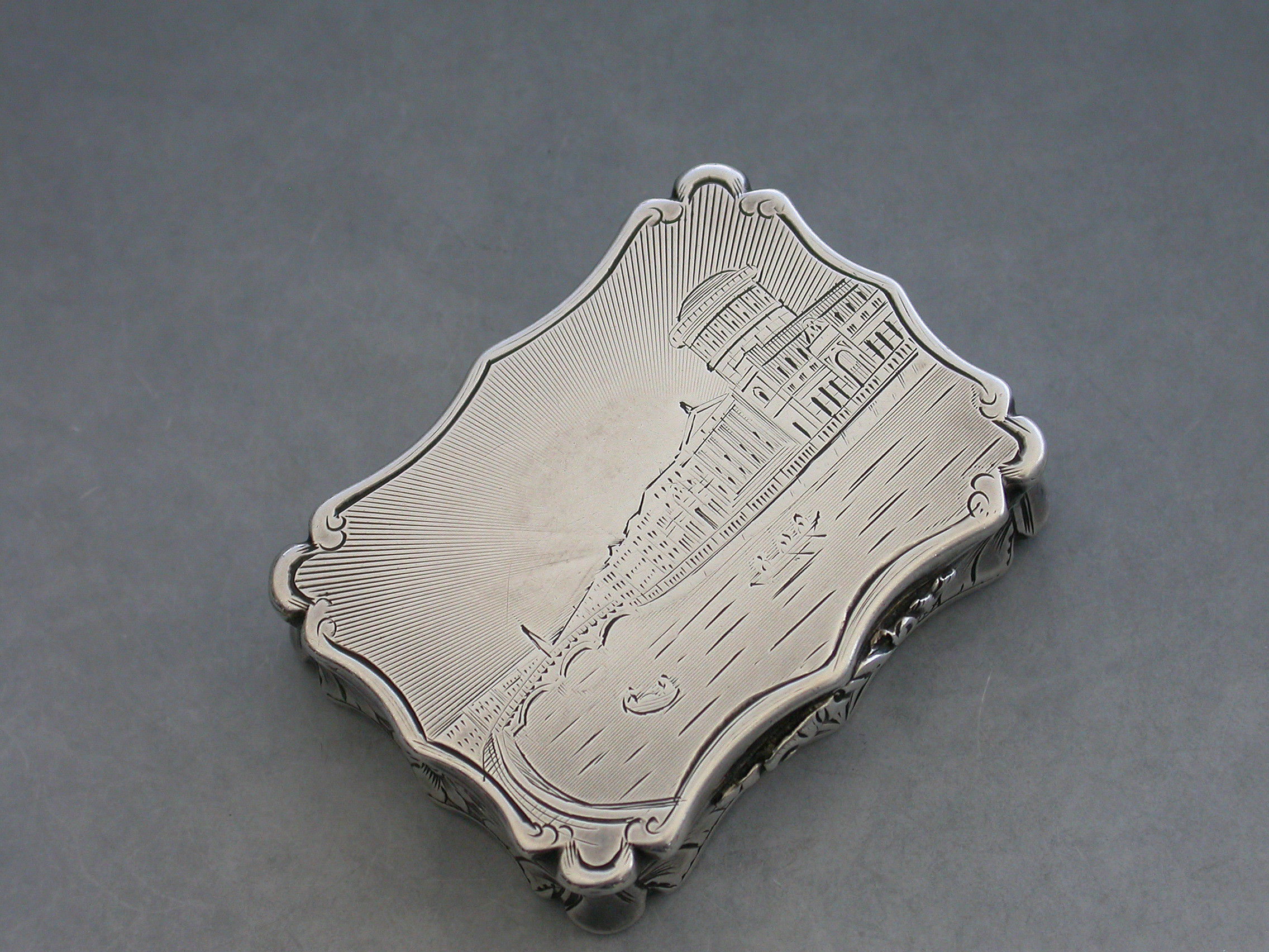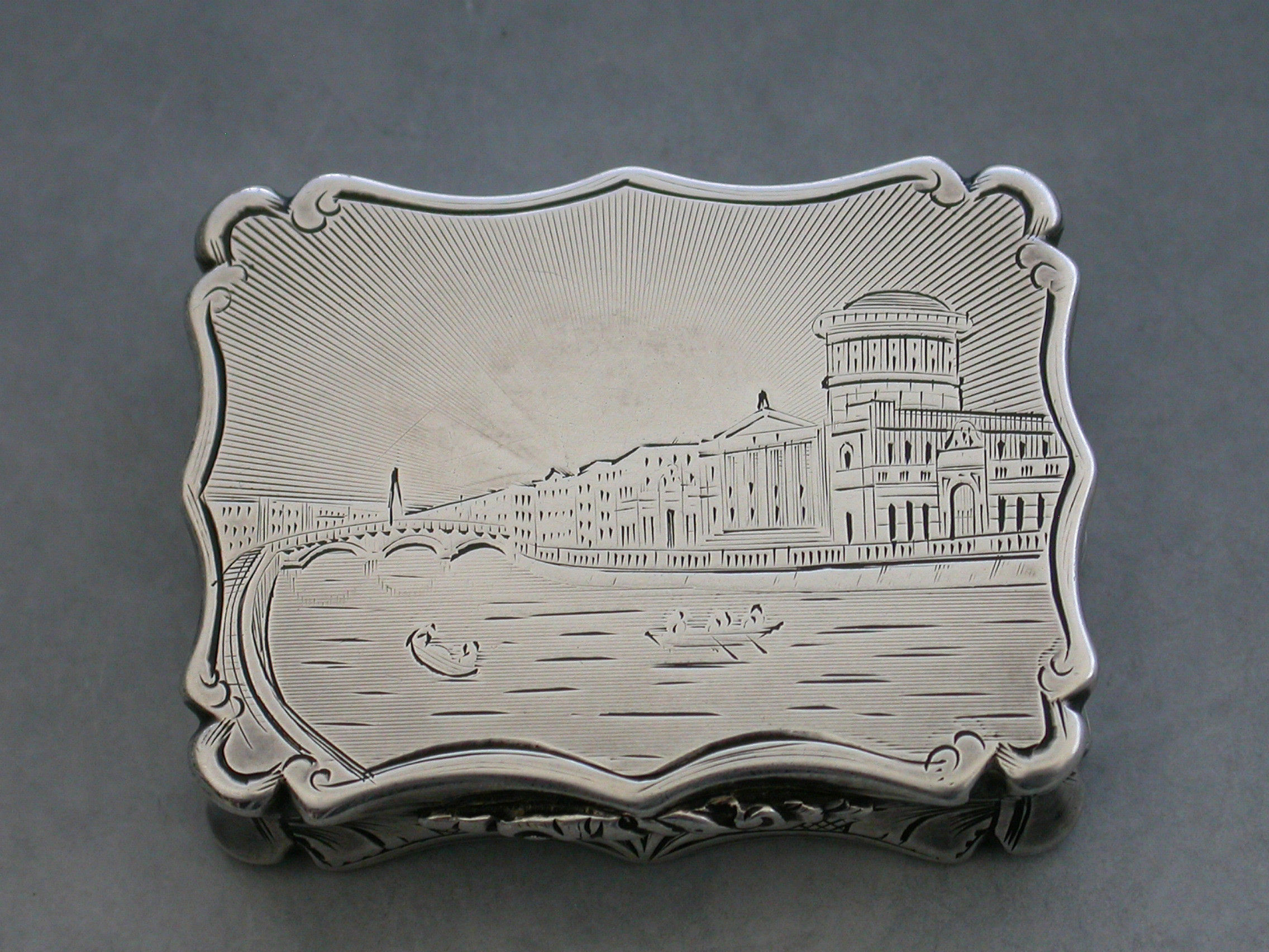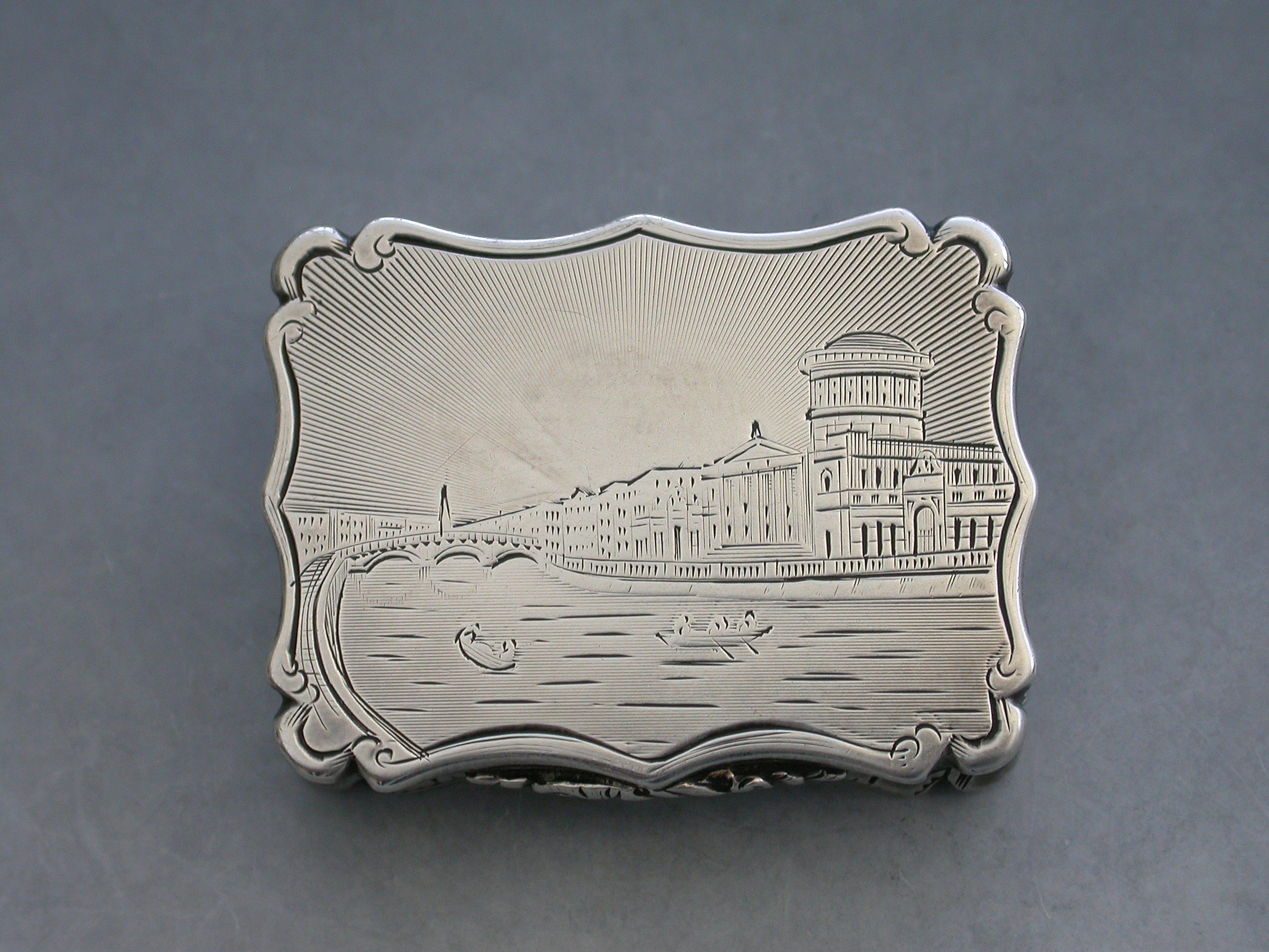 An extremely rare Victorian silver Vinaigrette of shaped rectangular form, the base and sides with foliate scroll decoration, a cartouche to the base engraved ""Mary"". The lid engraved with a scene depicting The Law Courts in Dublin on the river Liffey. Silver gilt interior with a foliate scroll pierced grille including a cornucopia.