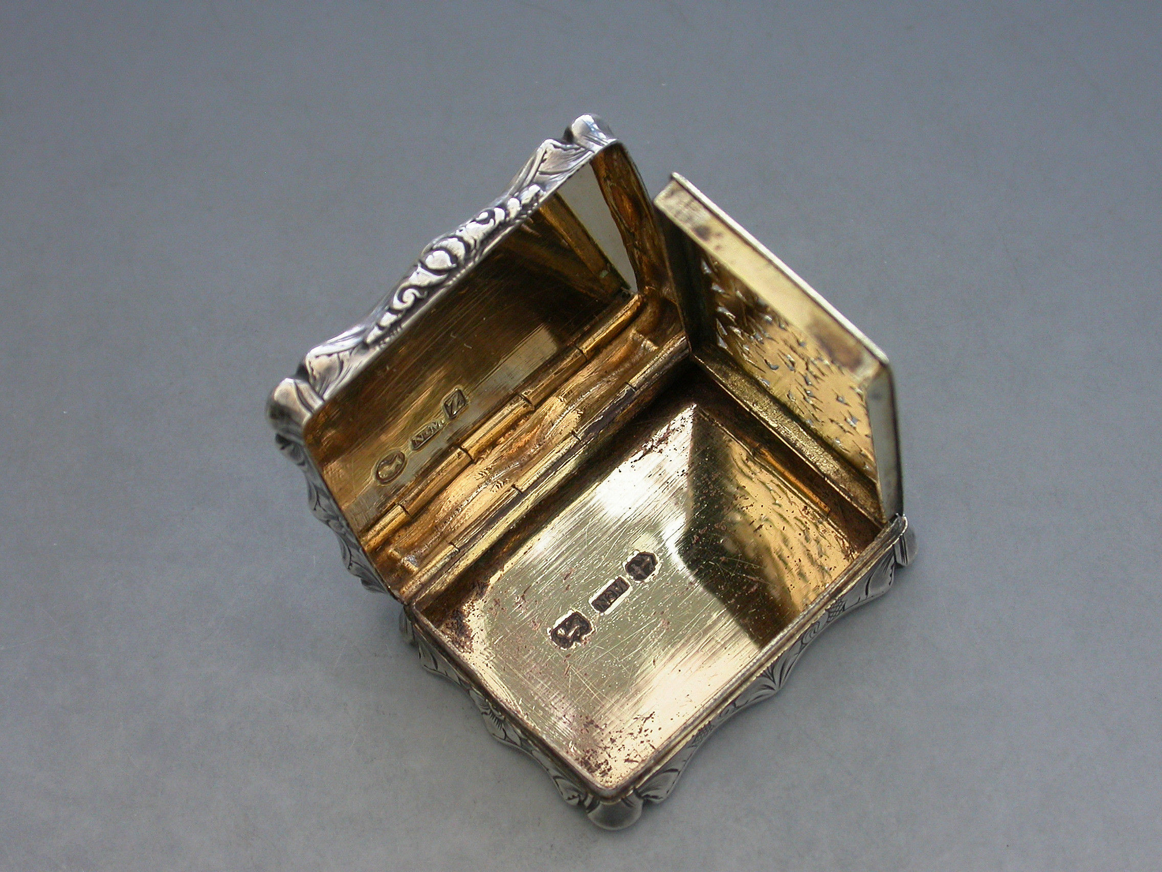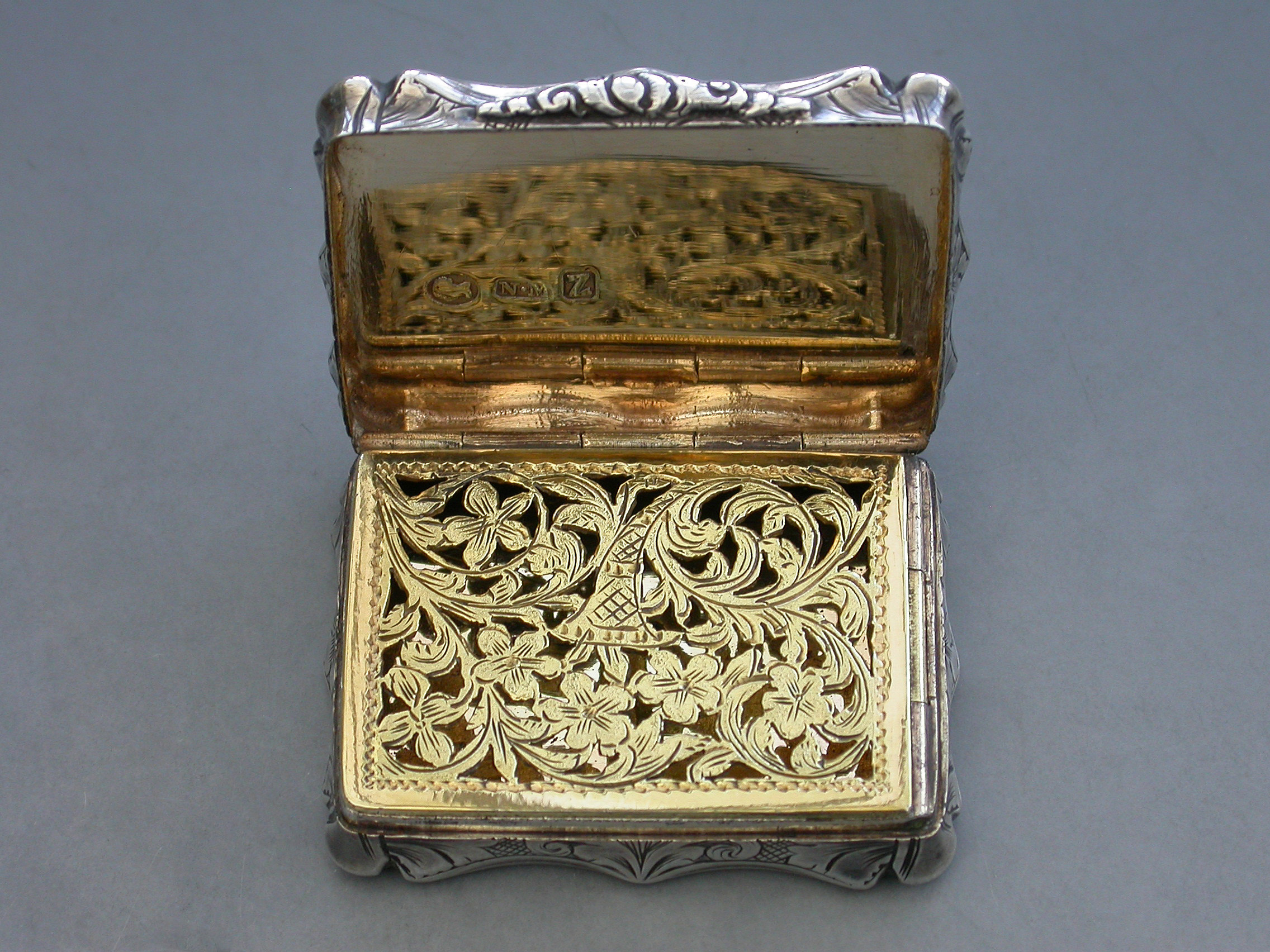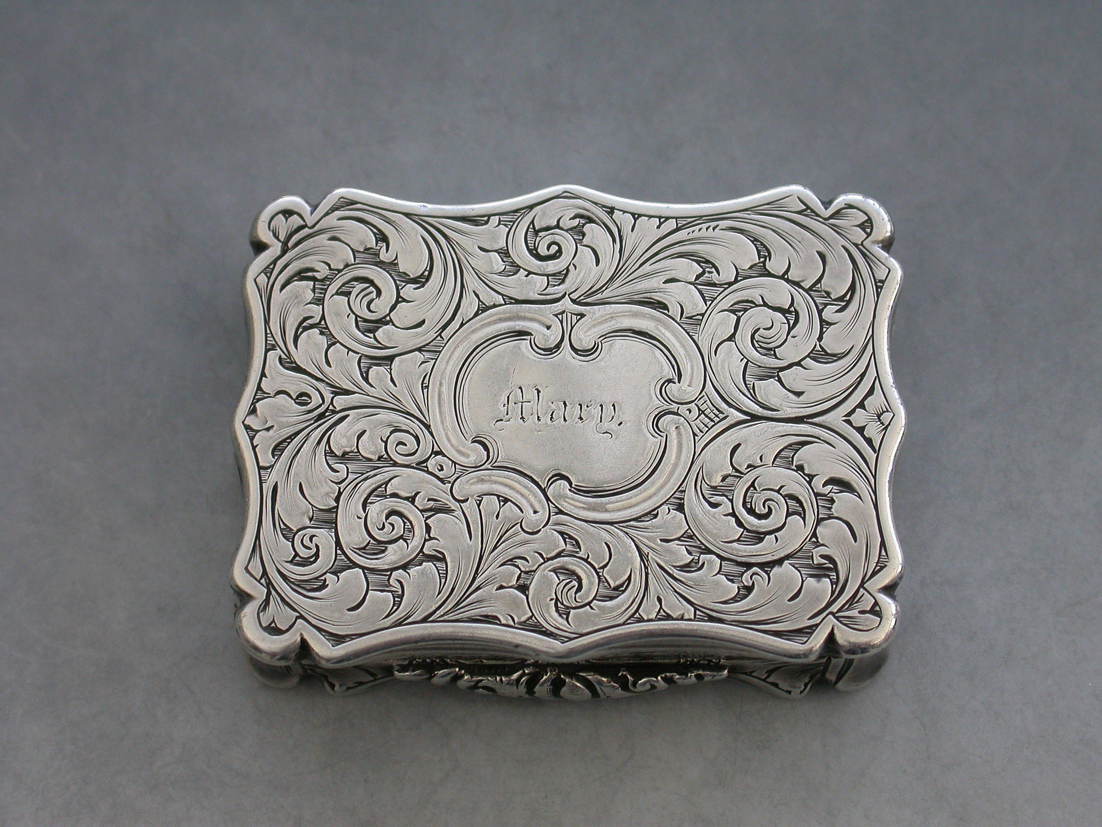 An extremely rare Victorian silver Vinaigrette of shaped rectangular form, the base and sides with foliate scroll decoration, a cartouche to the base engraved ""Mary"". The lid engraved with a scene depicting The Law Courts in Dublin on the river Liffey. Silver gilt interior with a foliate scroll pierced grille including a cornucopia.