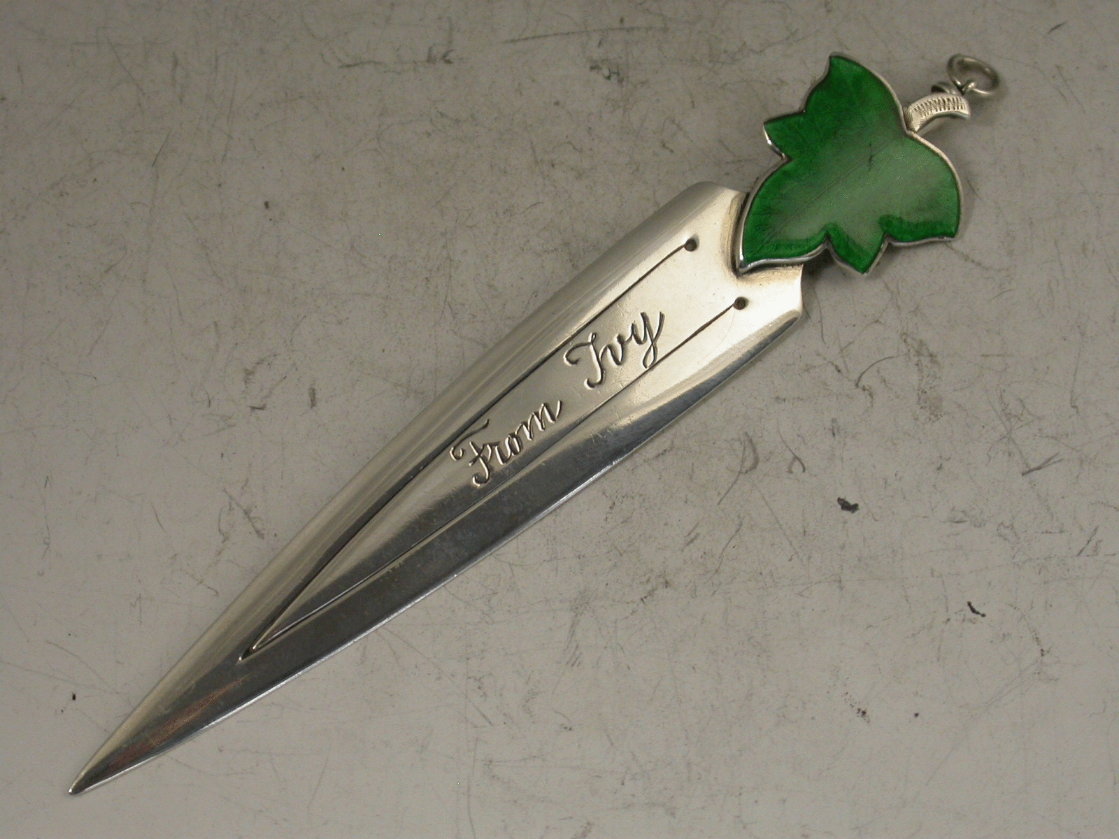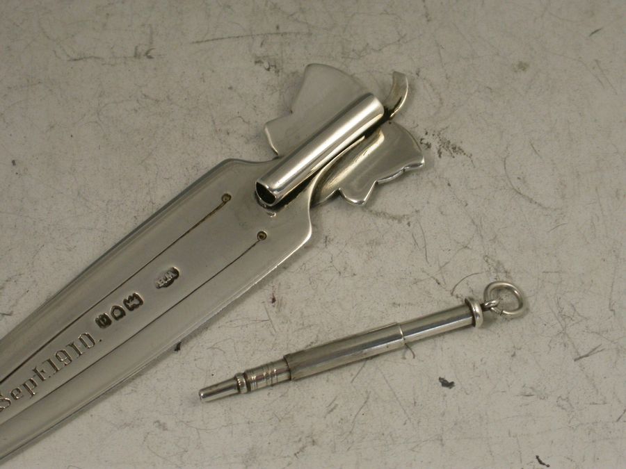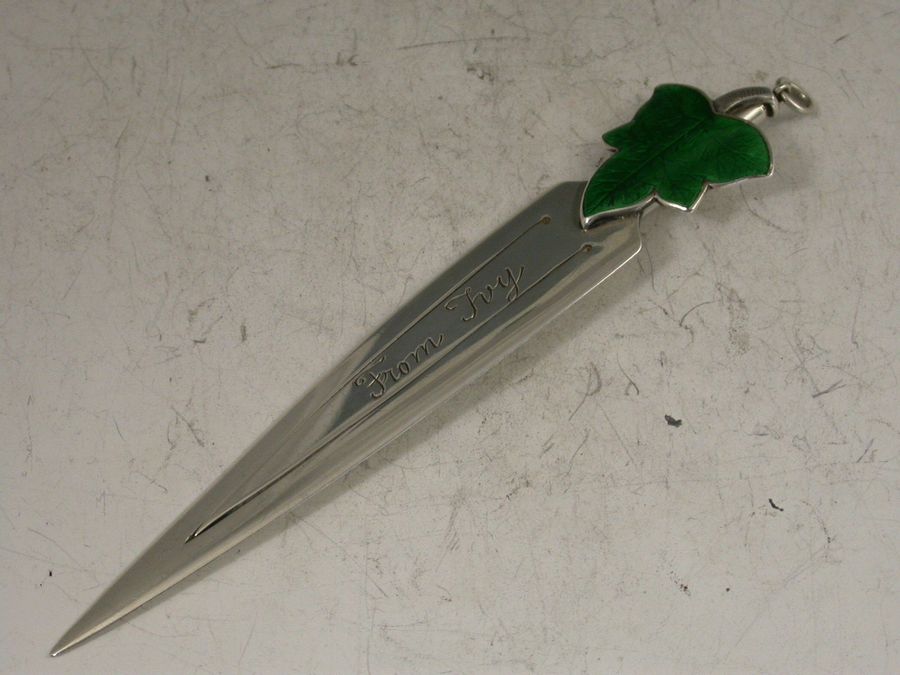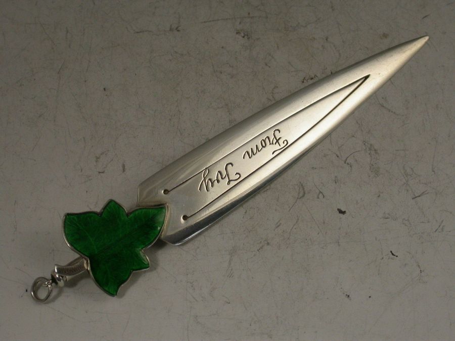 A fine Victorian silver Bookmark with green enamelled ivy leaf terminal, the reverse with attached propelling pencil, the blade, engraved ""From Ivy"" and ""22 Sept 1910"".