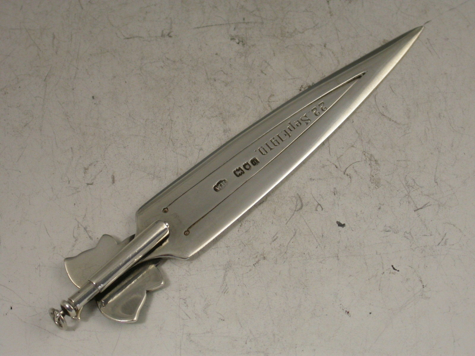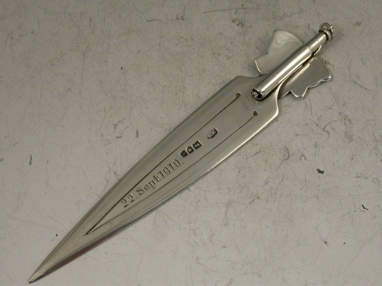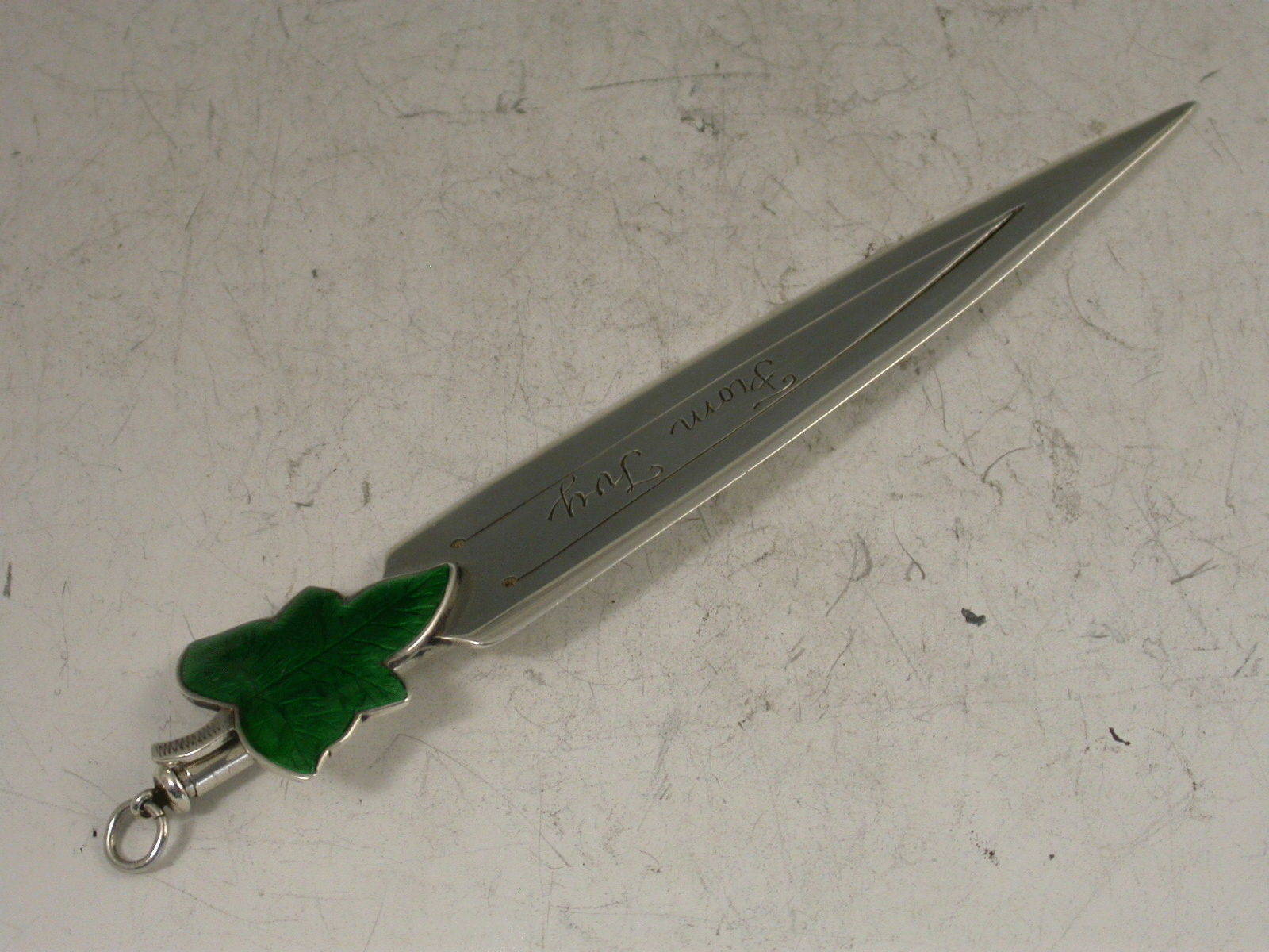 A fine Victorian silver Bookmark with green enamelled ivy leaf terminal, the reverse with attached propelling pencil, the blade, engraved ""From Ivy"" and ""22 Sept 1910"".