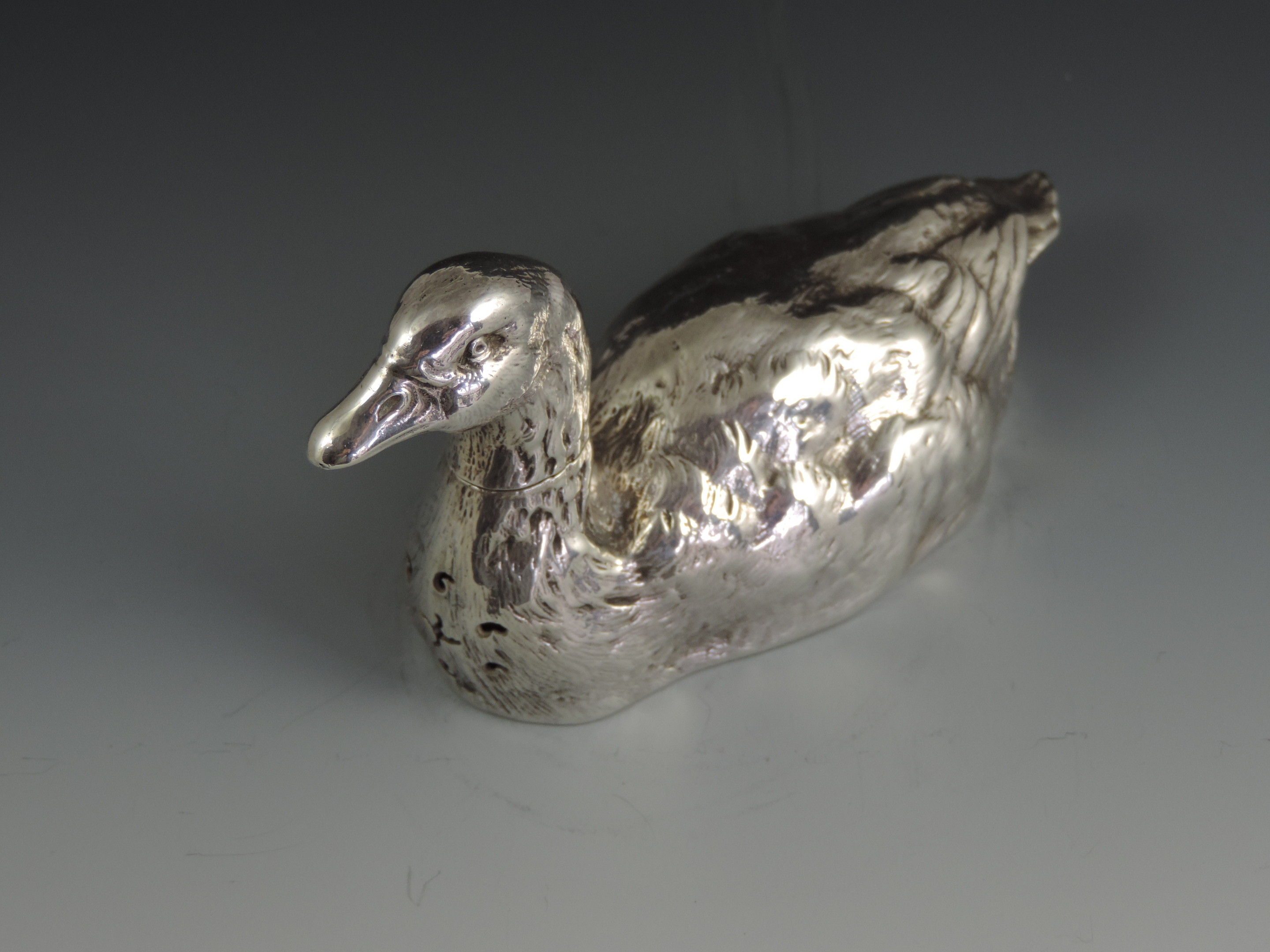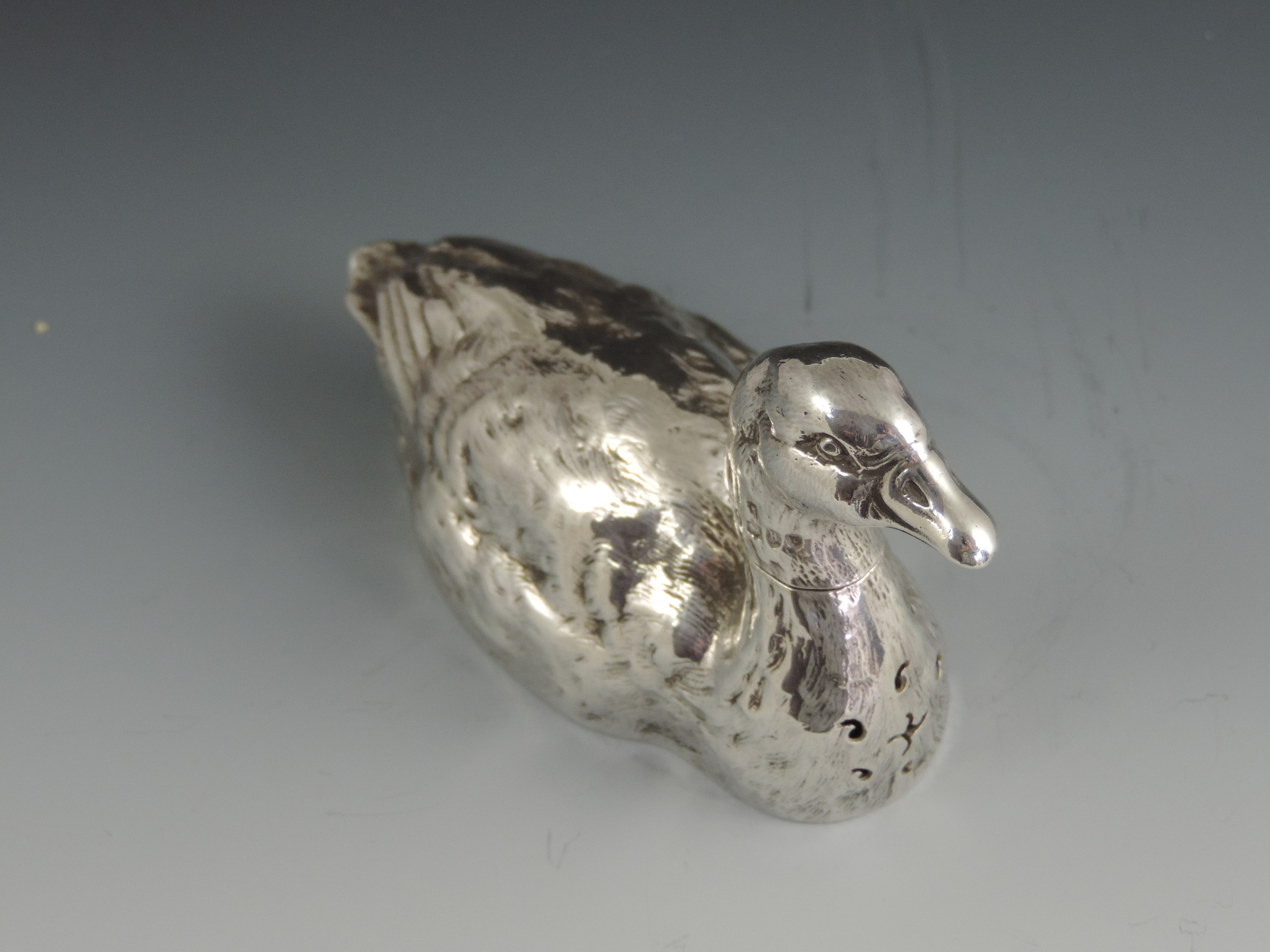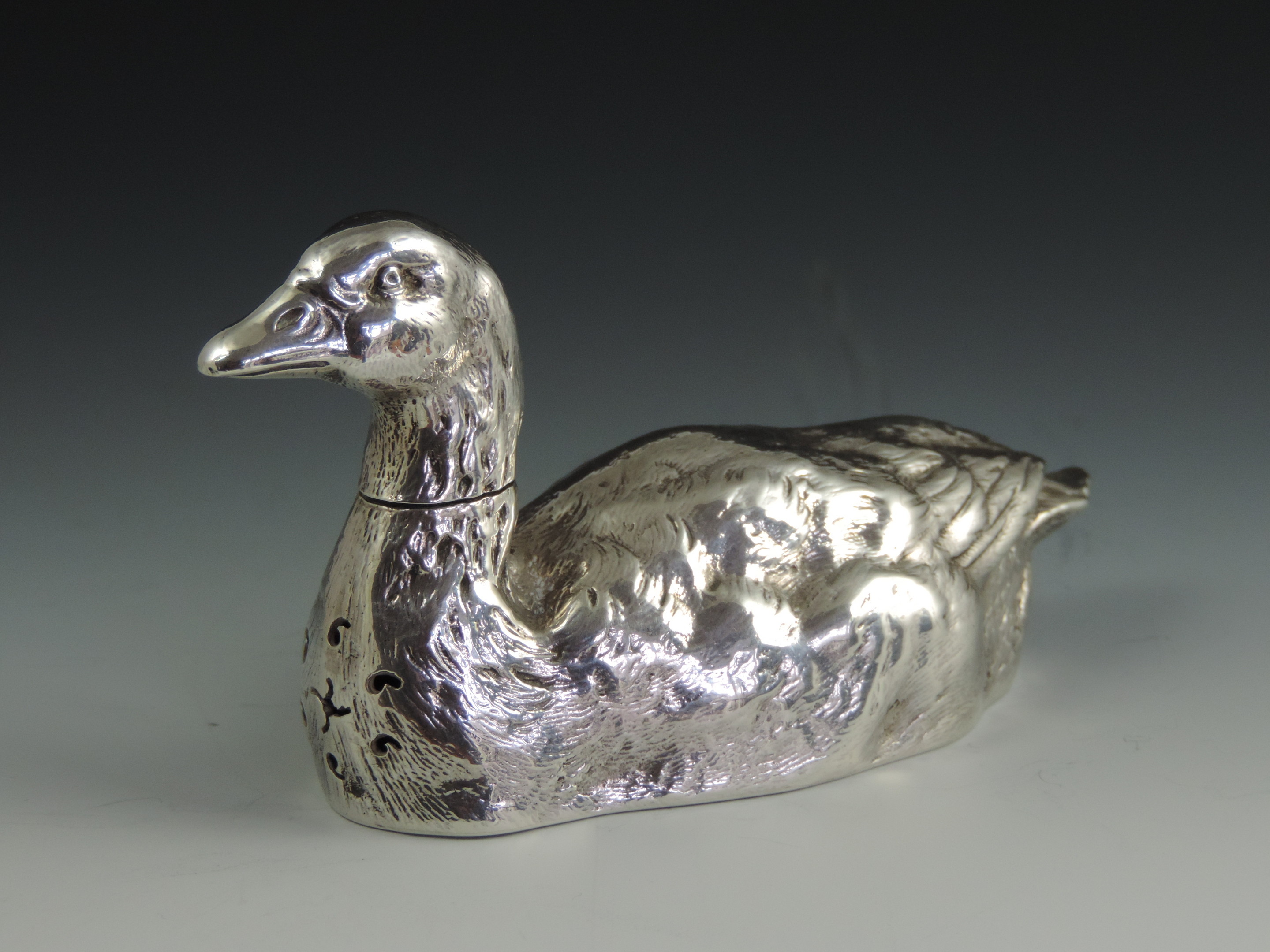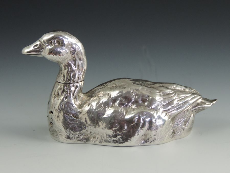 A very fine quality and rare cast novelty silver pepper made in the form of a swimming farmyard Goose, with pull-off head and pierced breast.