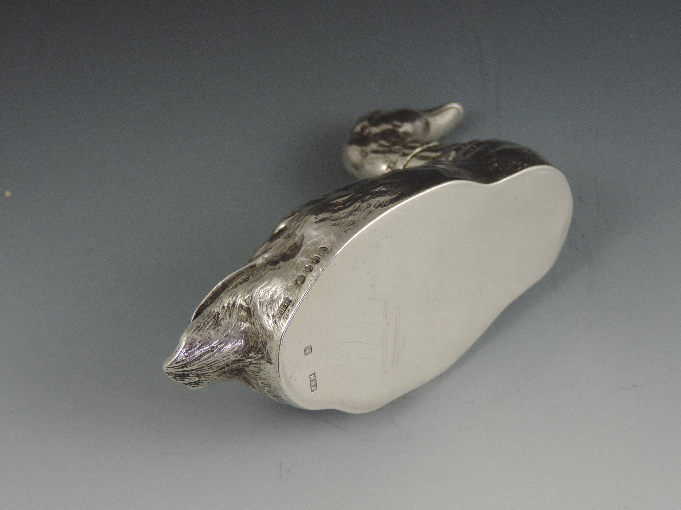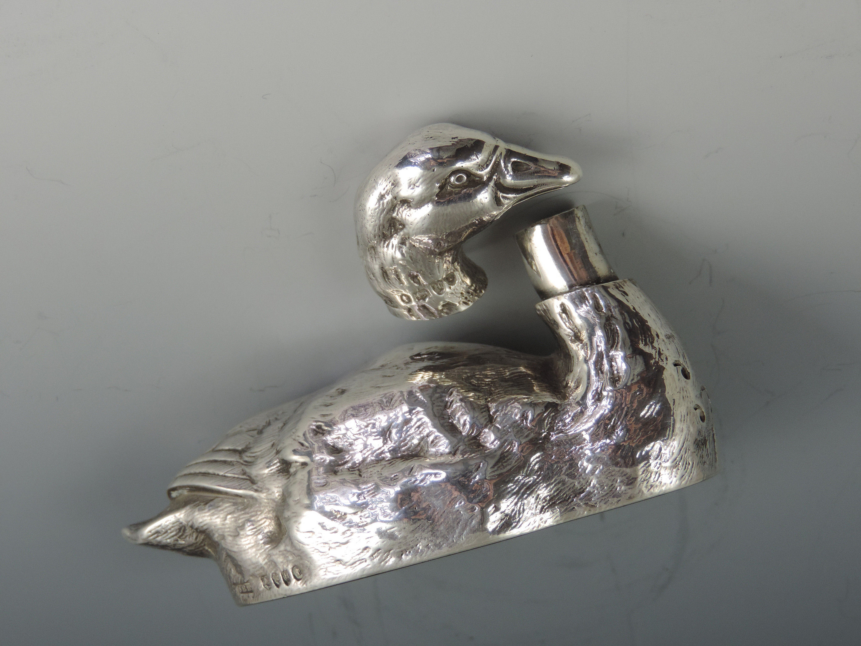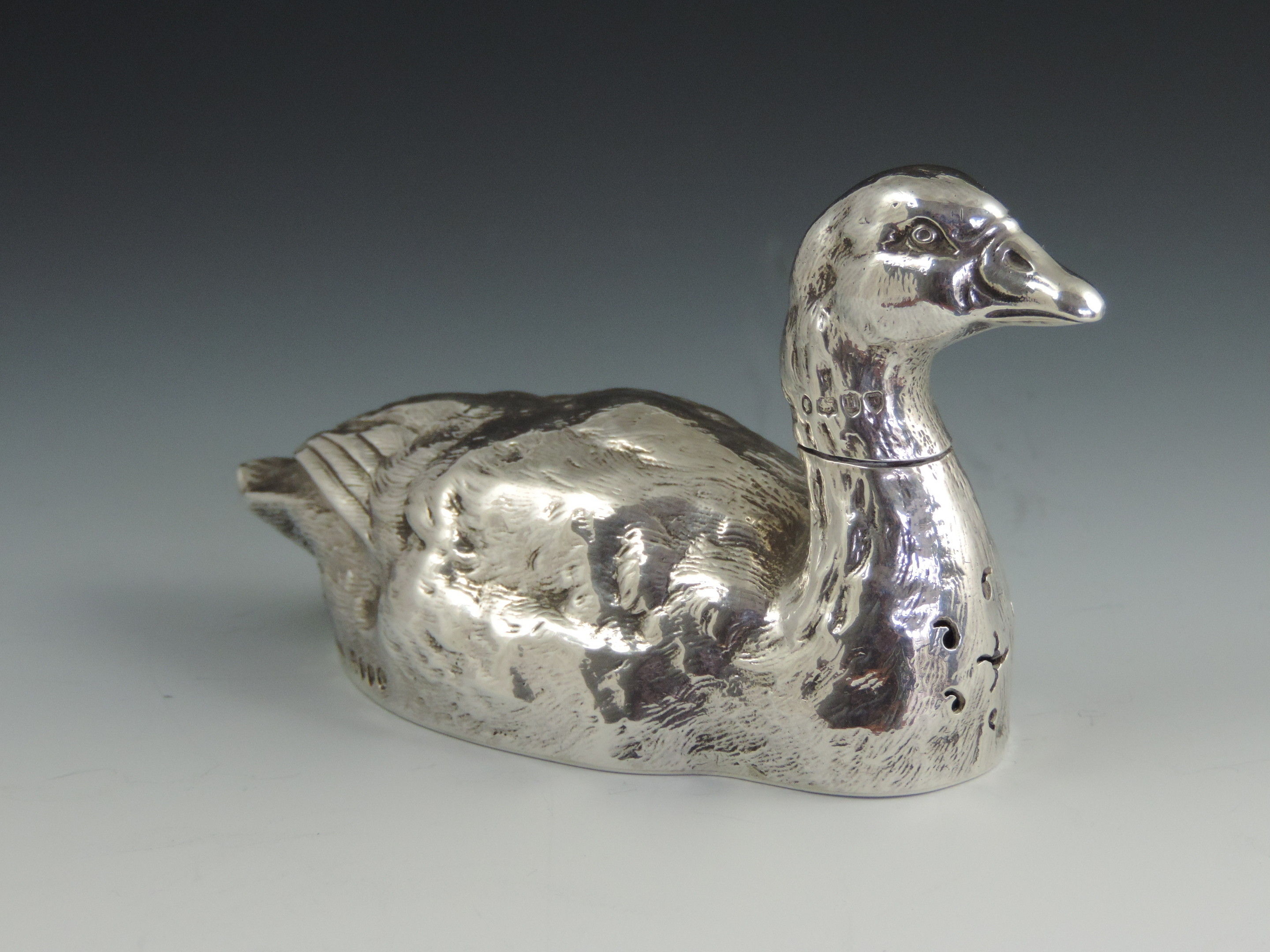 A very fine quality and rare cast novelty silver pepper made in the form of a swimming farmyard Goose, with pull-off head and pierced breast.
