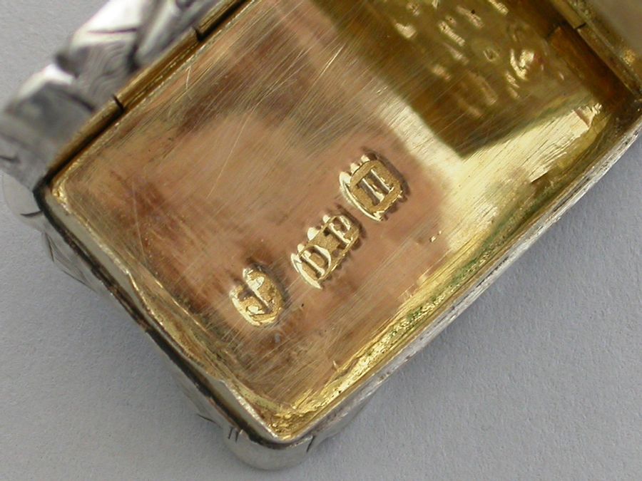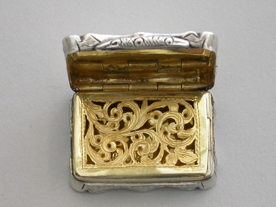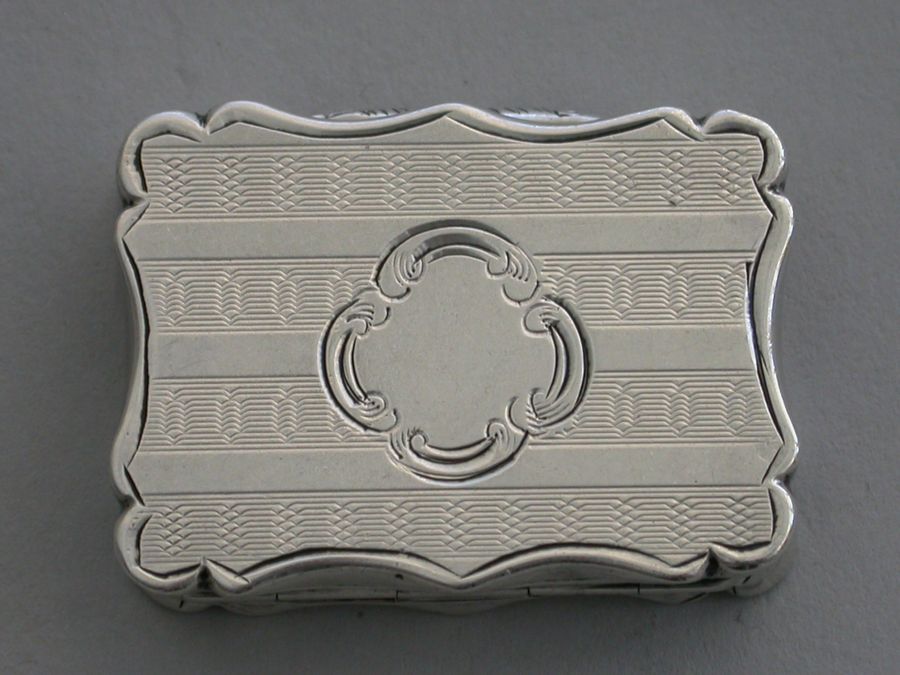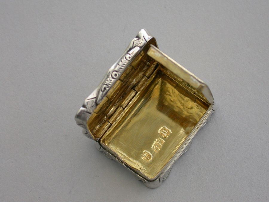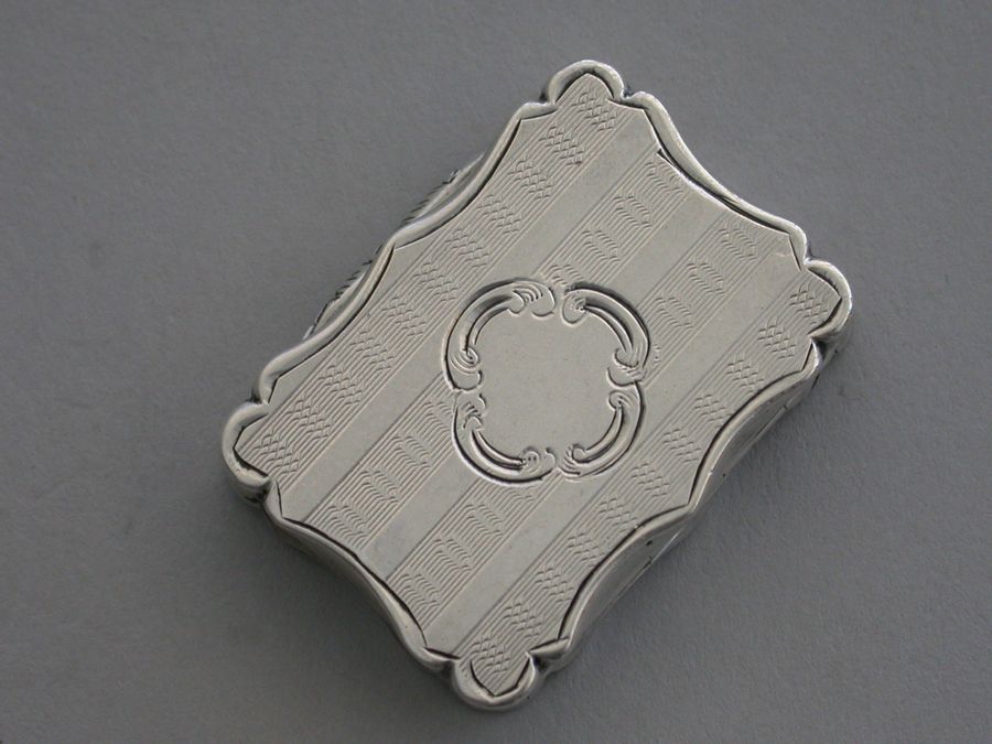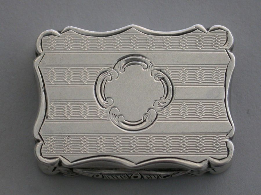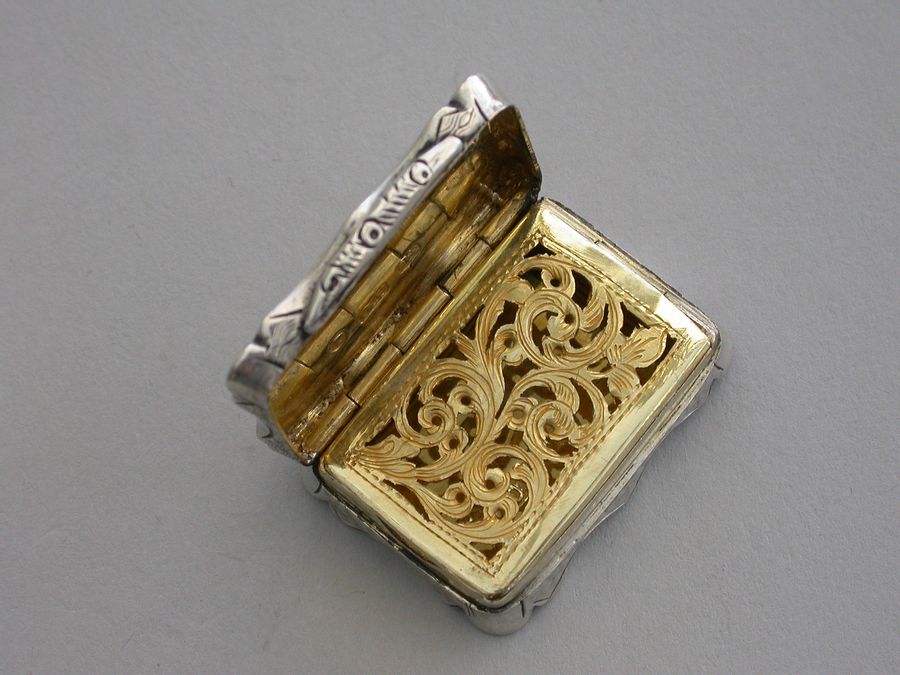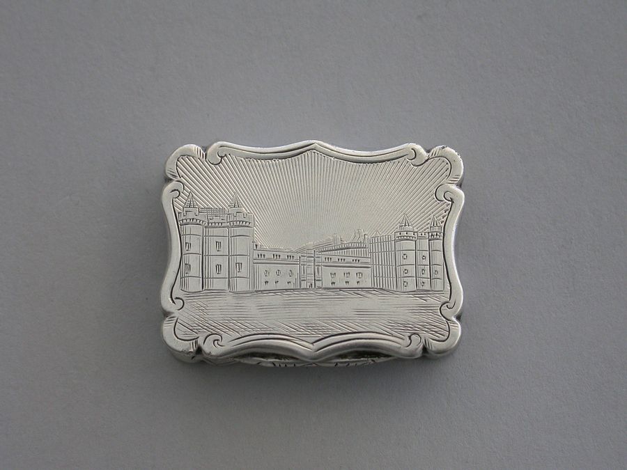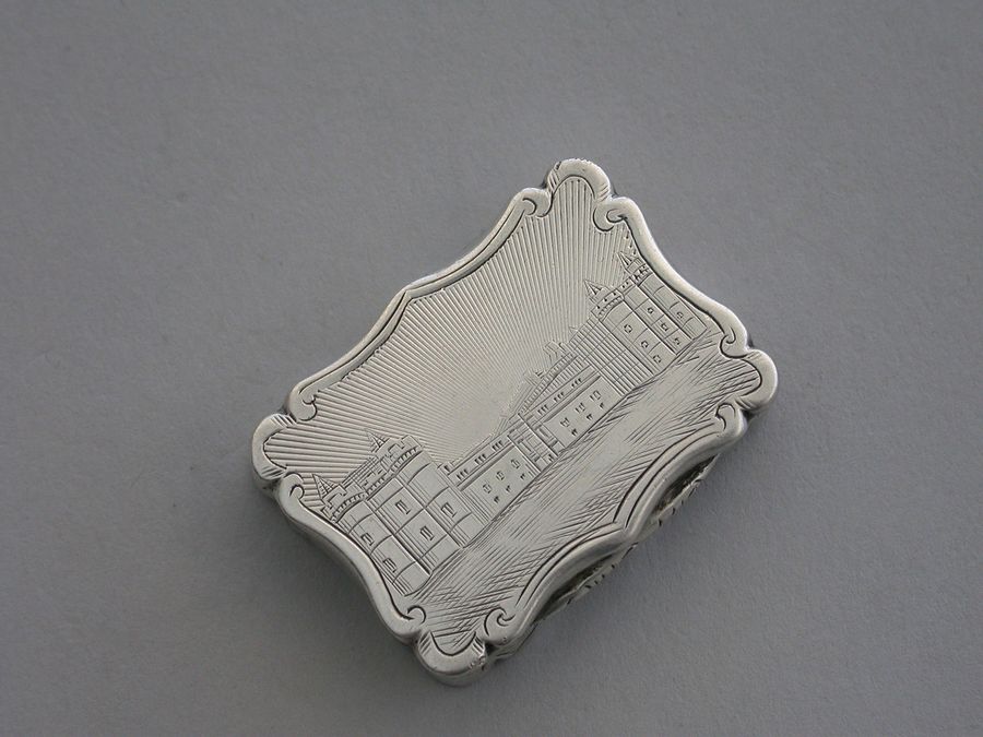 A rare Victorian silver Vinaigrette of shaped rectangular form, the base and sides with bands of engine turned decoration and a vacant shaped cartouche. The lid engraved with a scene depicting Holyrood House in Edinburgh, Scotland. The silver gilt interior with foliate scroll pierced grille.