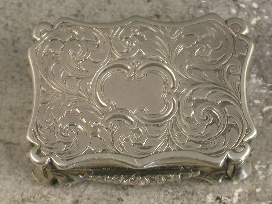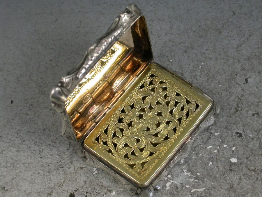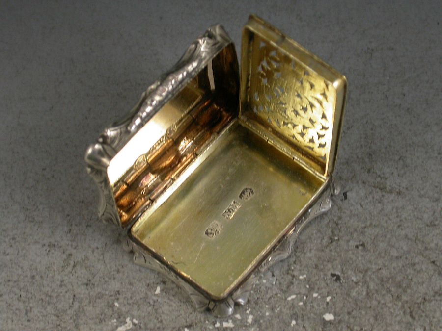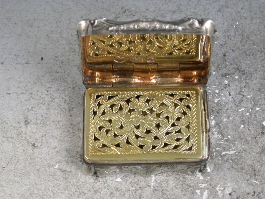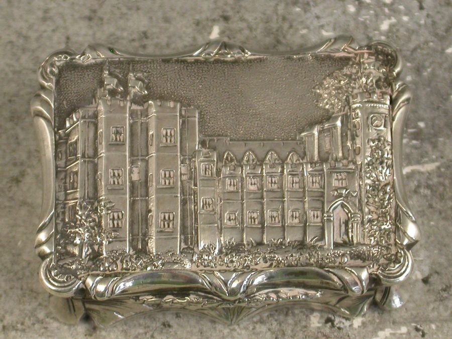A good Victorian silver 'Castle top' Vinaigrette of shaped rectangular form with foliate scroll decoration to the base and sides, the lid depicting a view of Kenilworth Castle in high relief, the silver gilt interior with foliate scroll pierced grille.