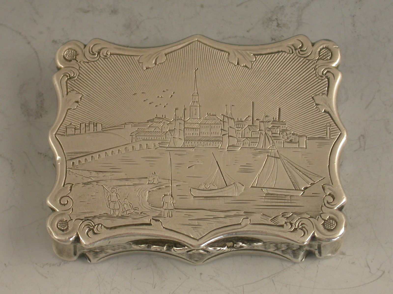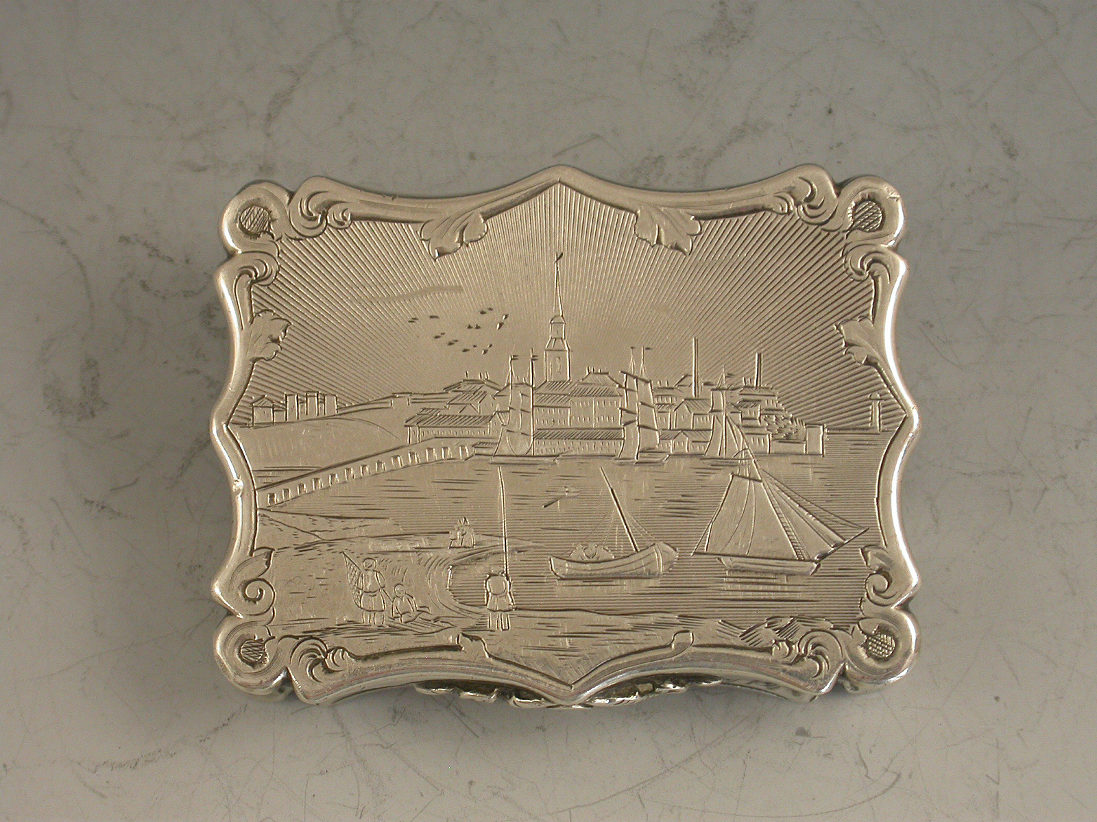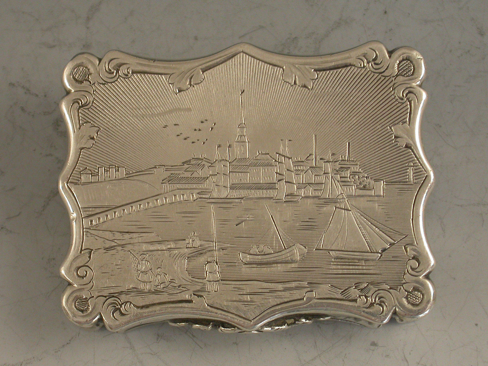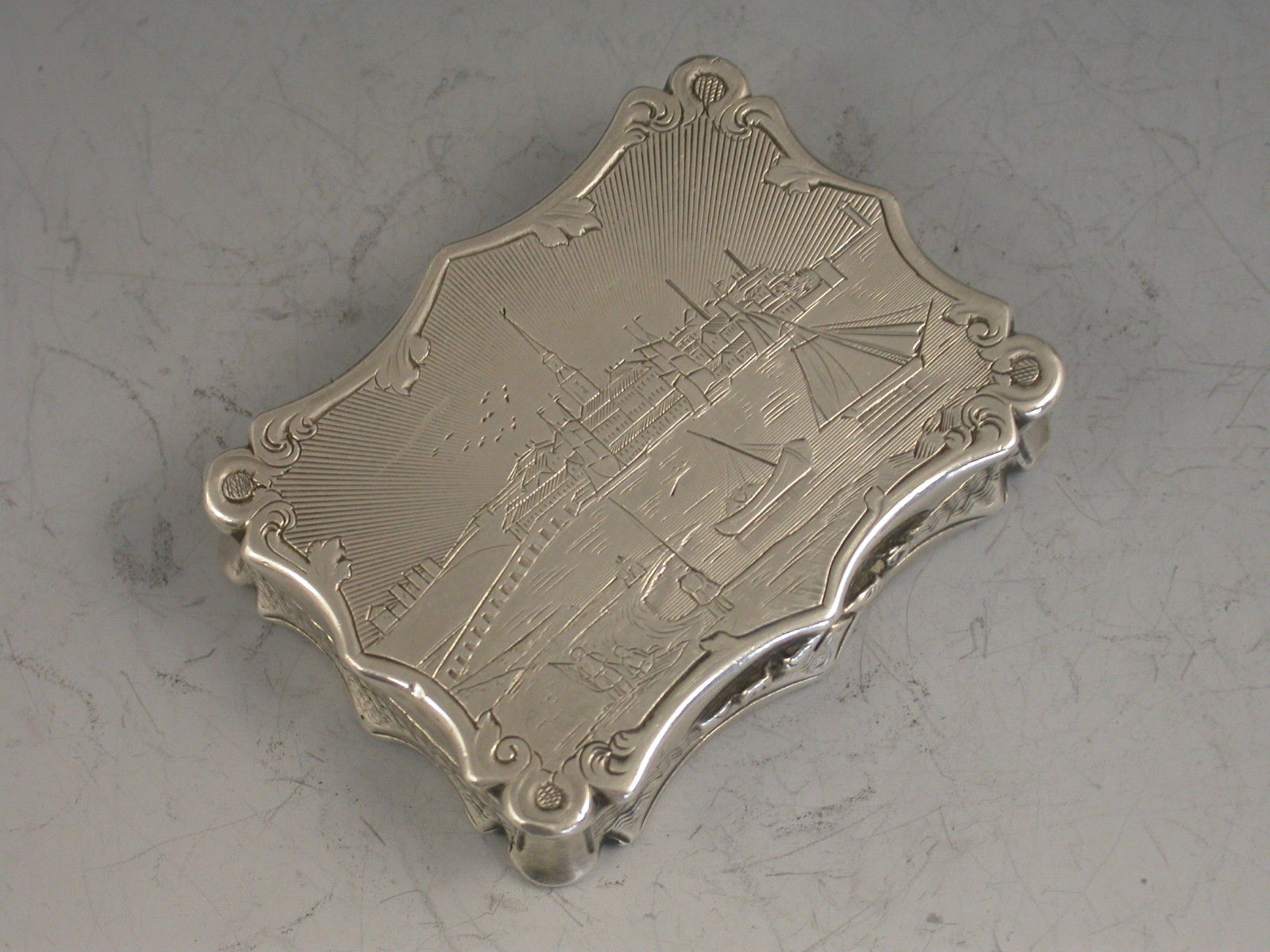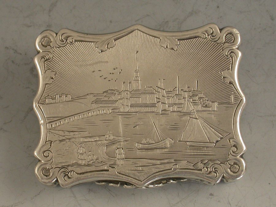 An extremely rare Victorian silver Vinaigrette of shaped rectangular form and large size, with bright- cut engraved bands of decoration to the base, the lid engraved with a scene depicting Londonderry across the river Foyle in Northern Ireland. The silver gilt interior with intricately pierced foliate scroll grille. A shield shaped cartouche to the base, engraved with contemporary initials.