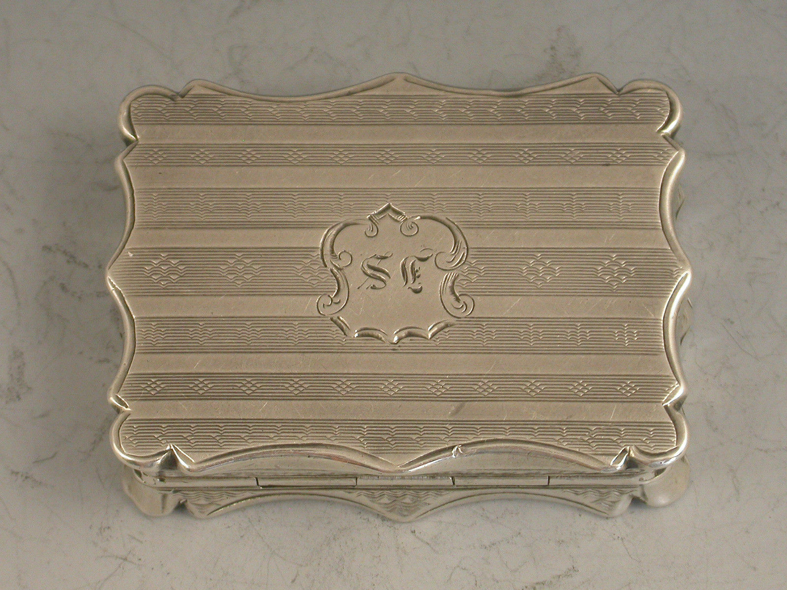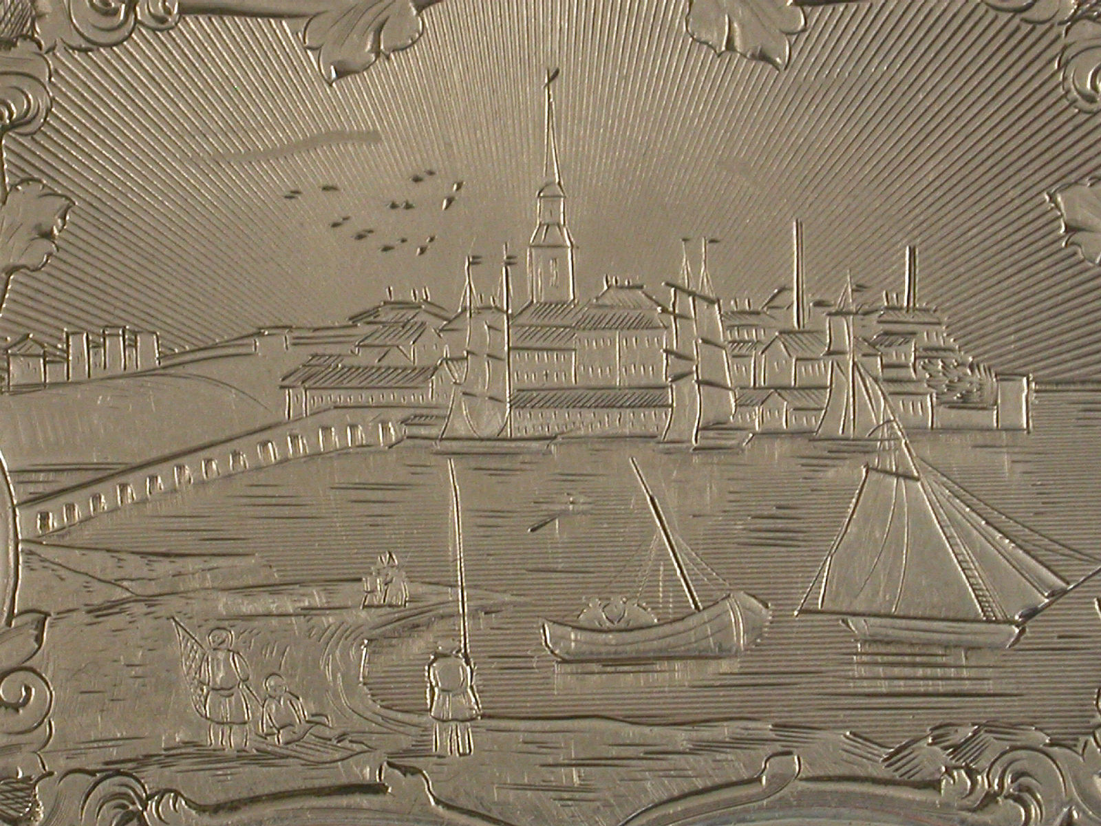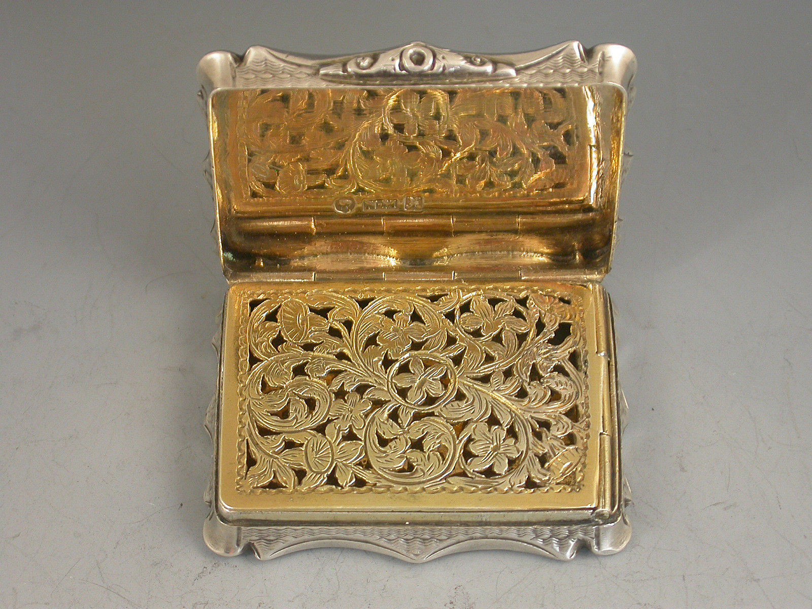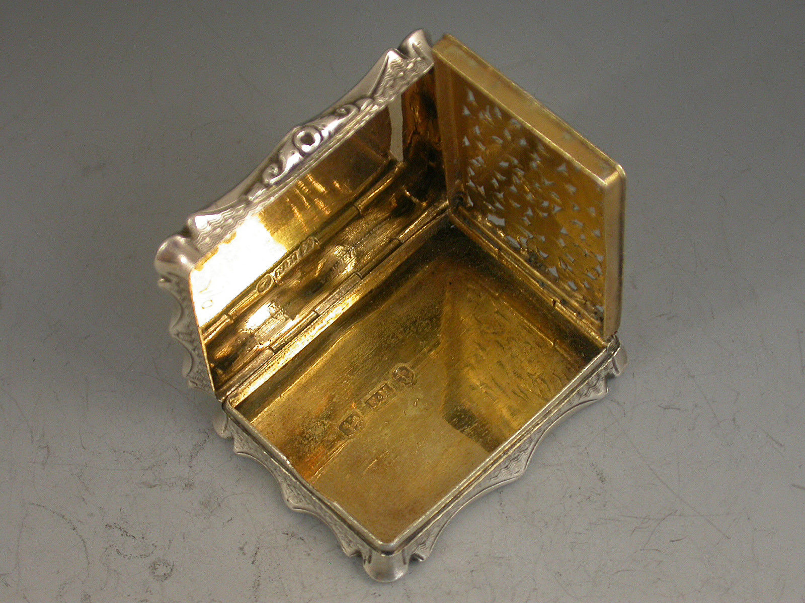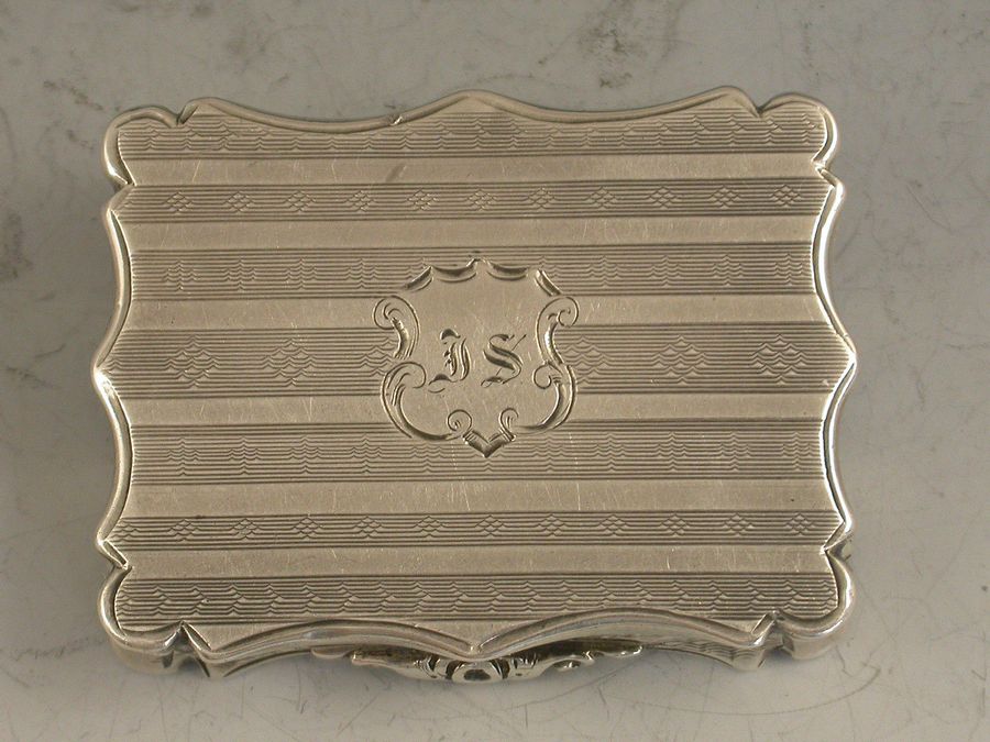 An extremely rare Victorian silver Vinaigrette of shaped rectangular form and large size, with bright- cut engraved bands of decoration to the base, the lid engraved with a scene depicting Londonderry across the river Foyle in Northern Ireland. The silver gilt interior with intricately pierced foliate scroll grille. A shield shaped cartouche to the base, engraved with contemporary initials.