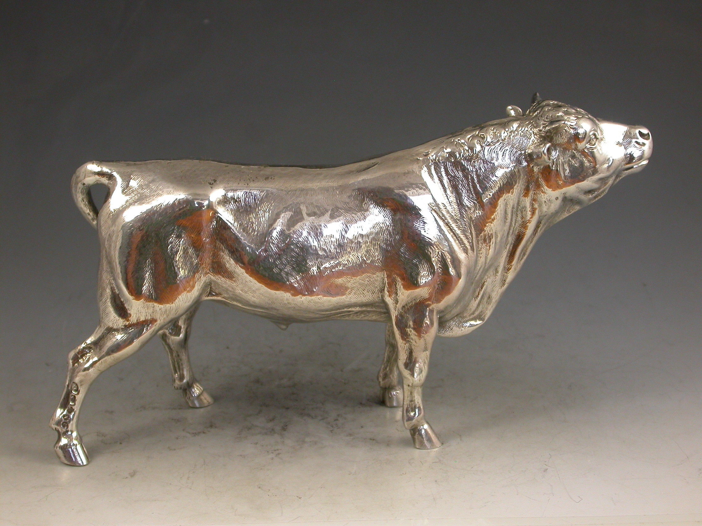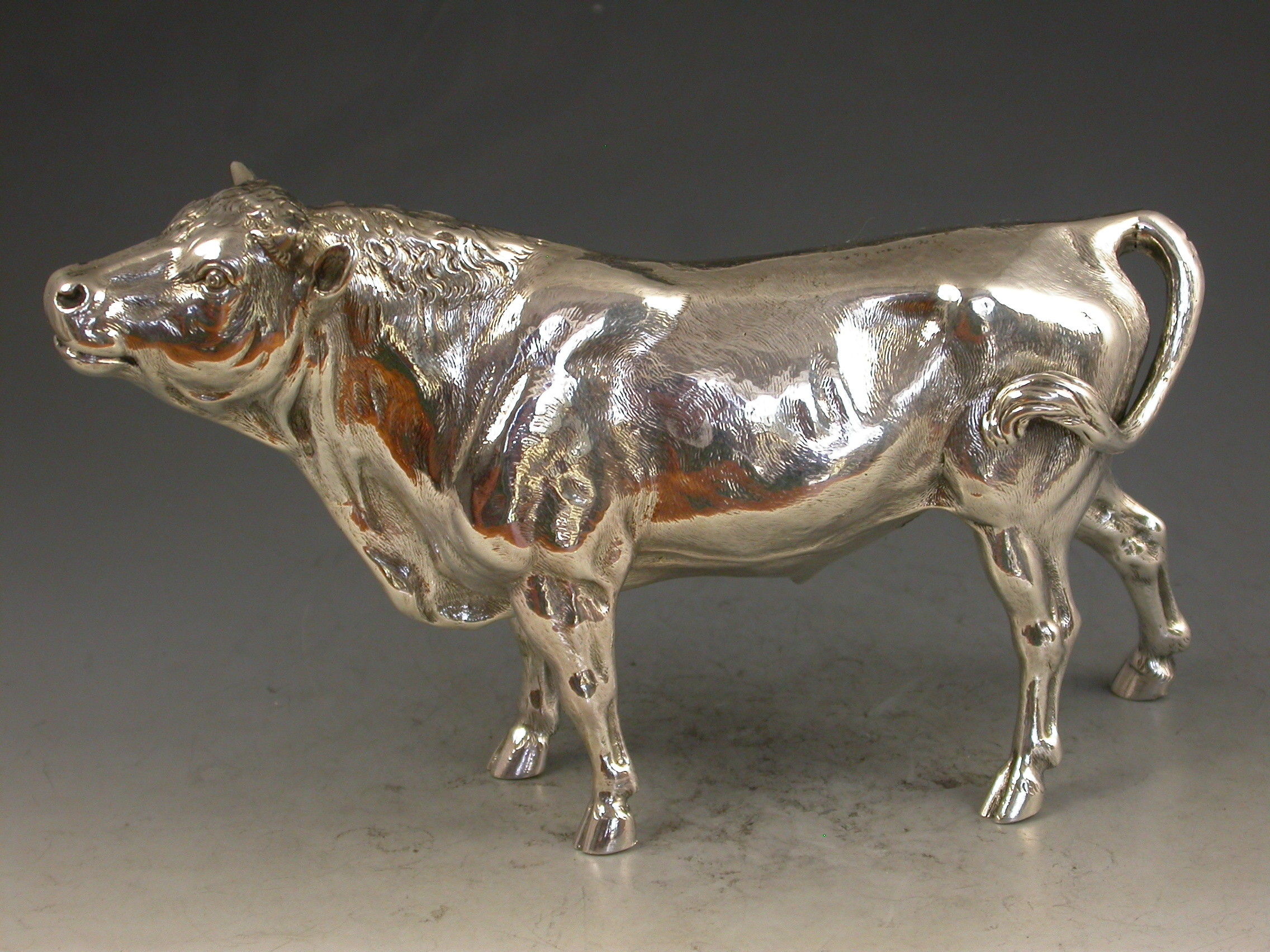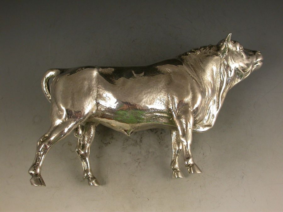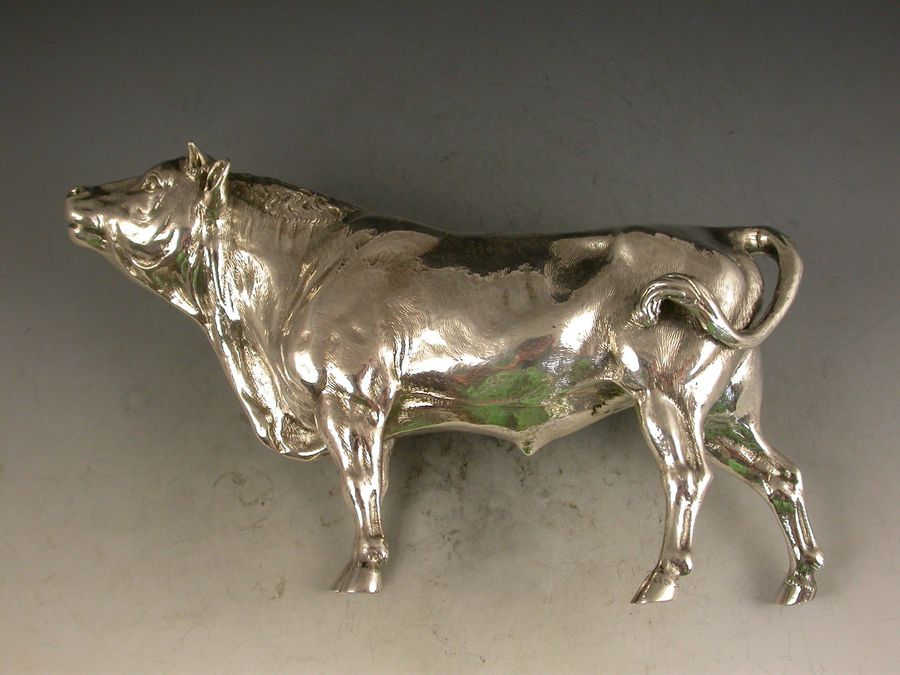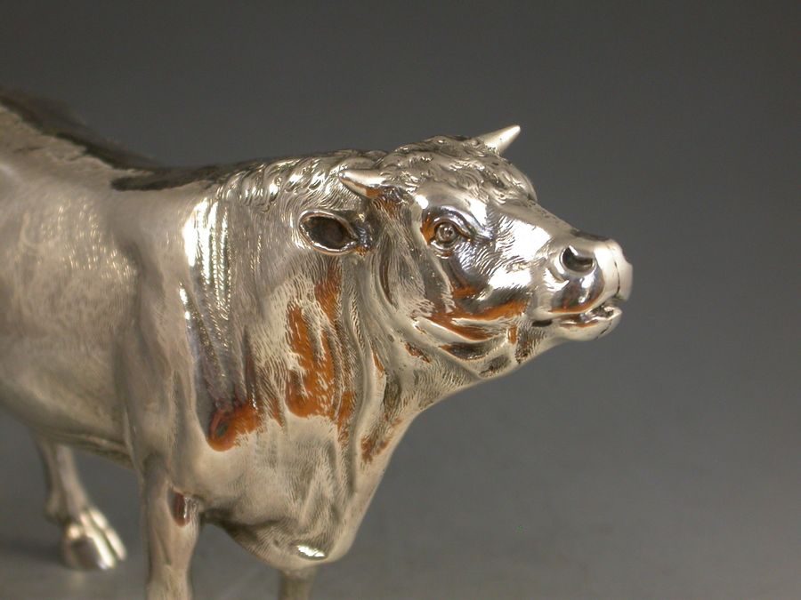 A good quality Victorian cast silver model of a horned Bull, possibly a Hereford, realistically chased with fine detail and an accurate interpretation.