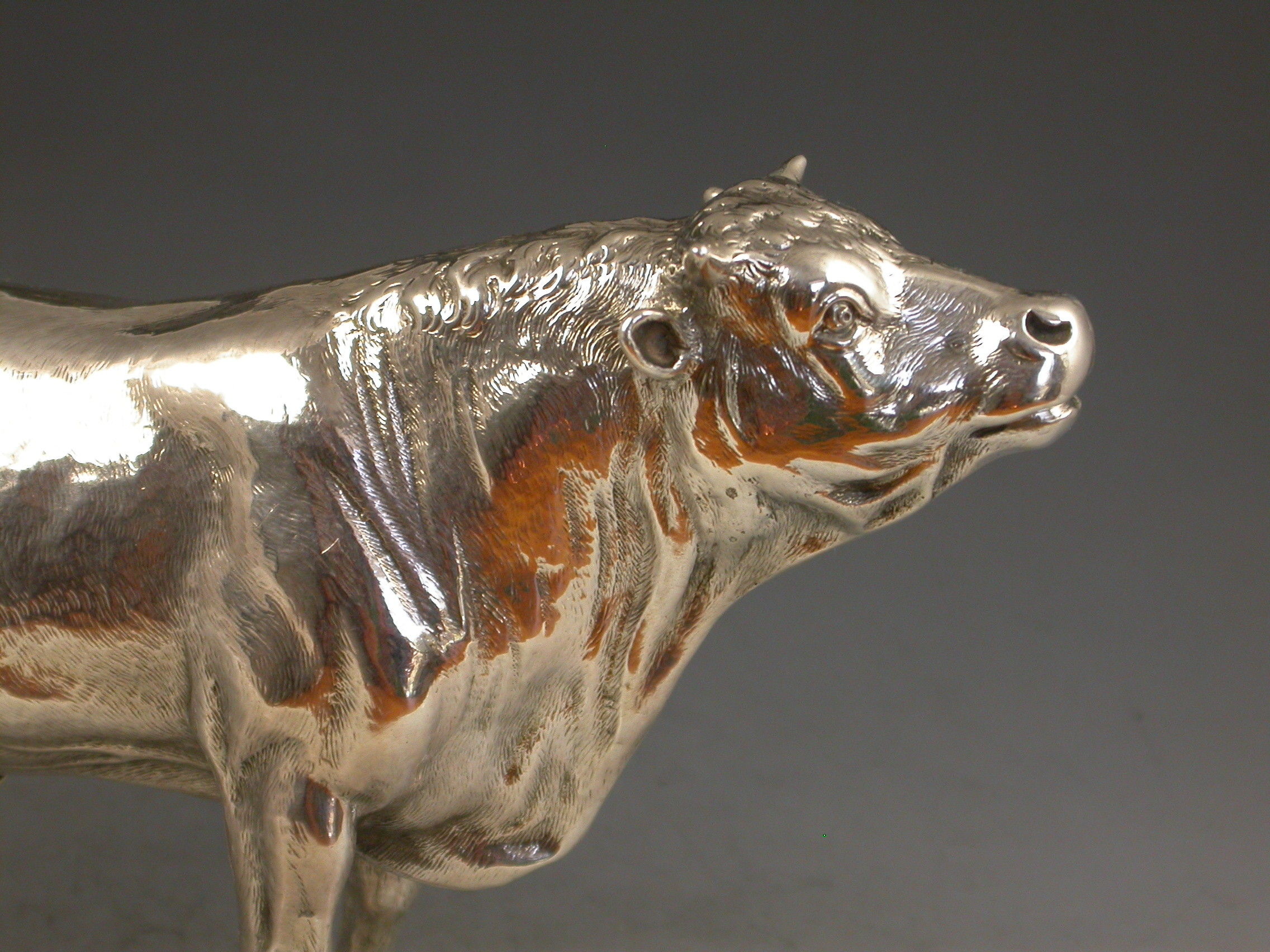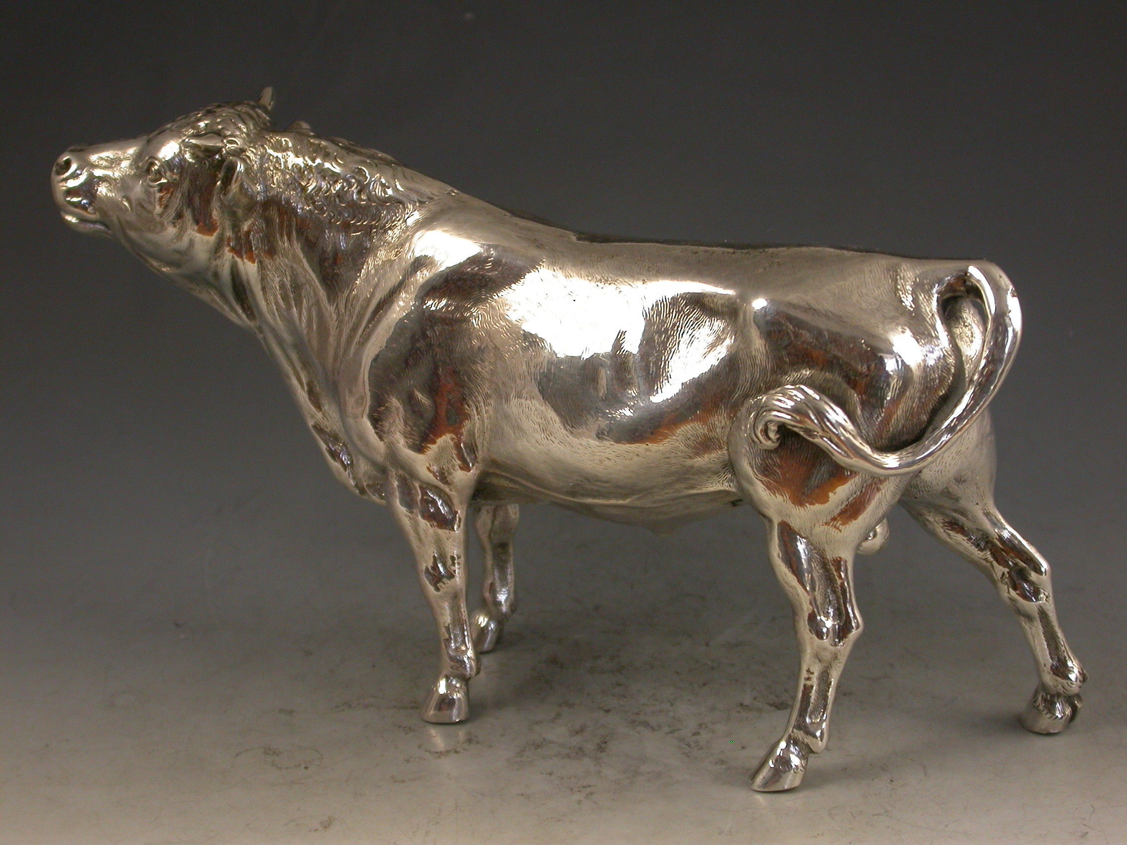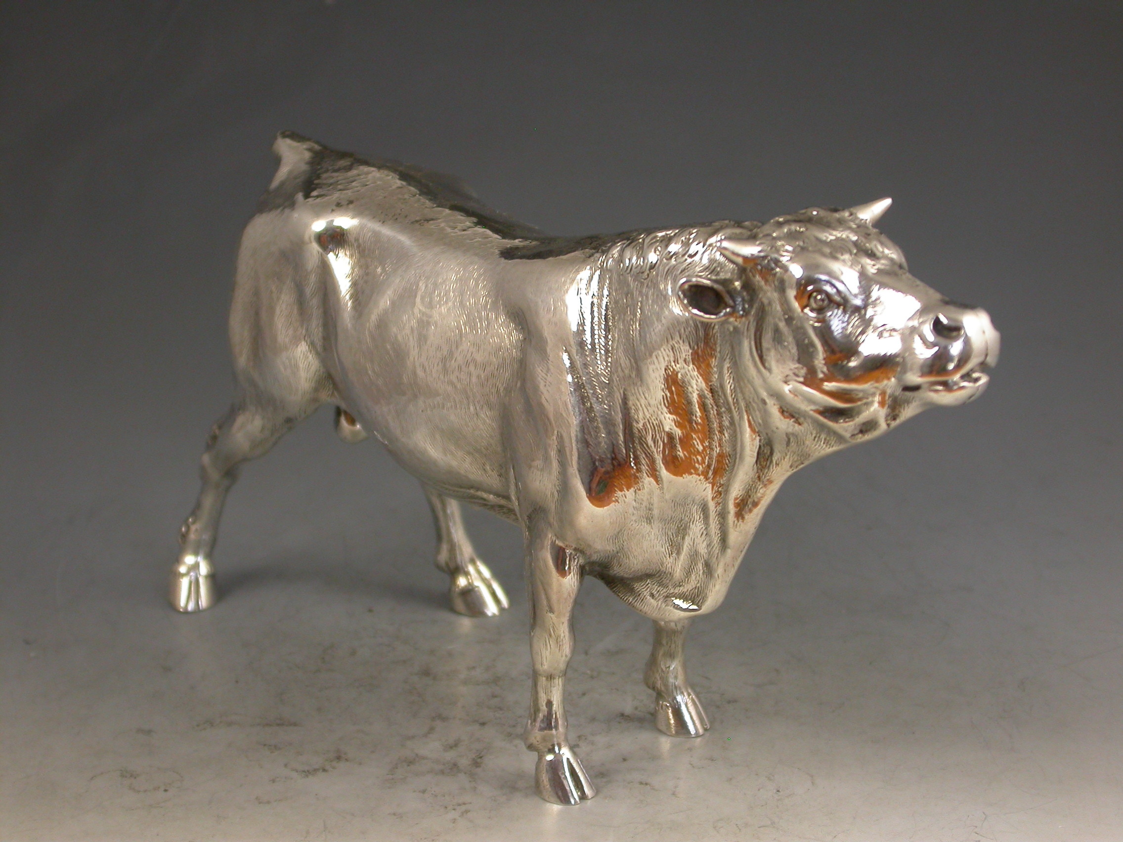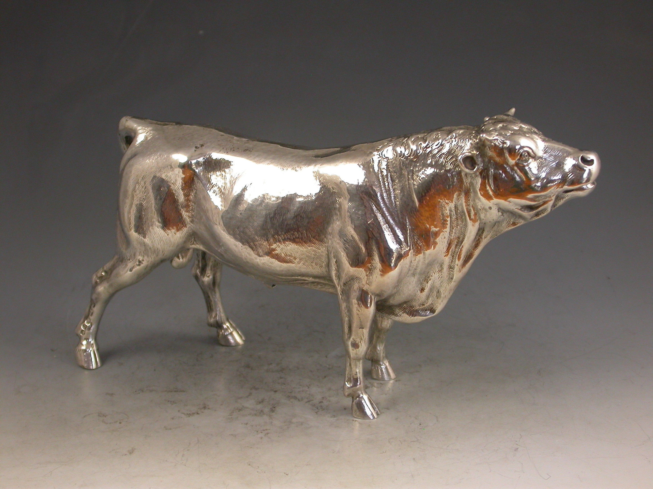 A good quality Victorian cast silver model of a horned Bull, possibly a Hereford, realistically chased with fine detail and an accurate interpretation.