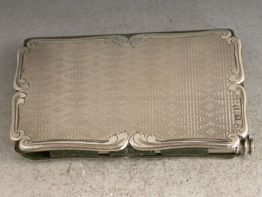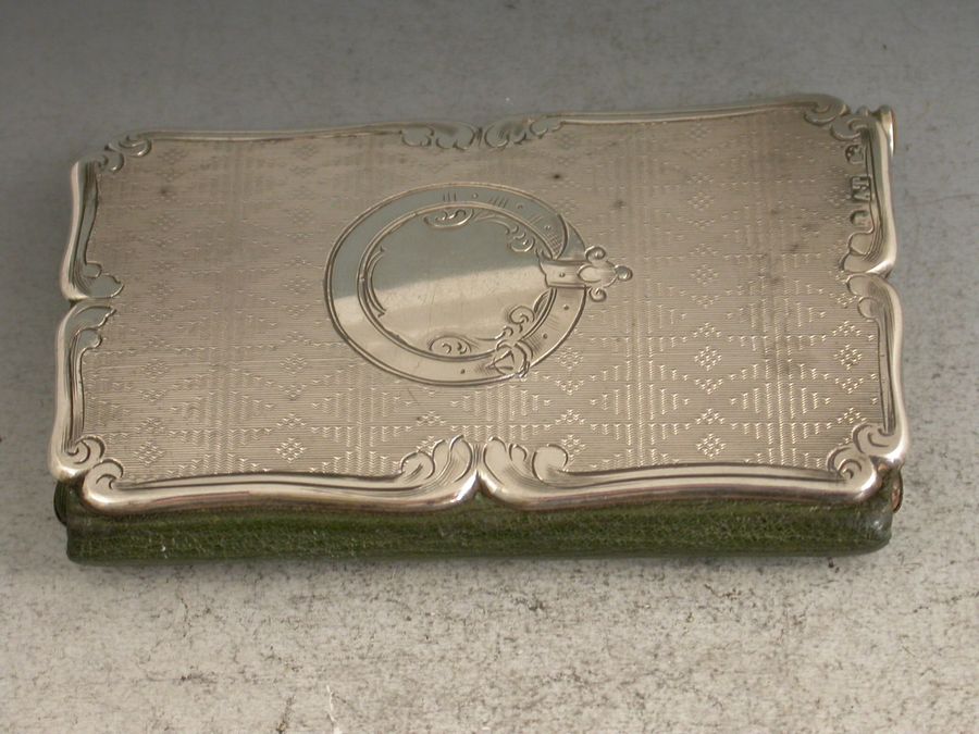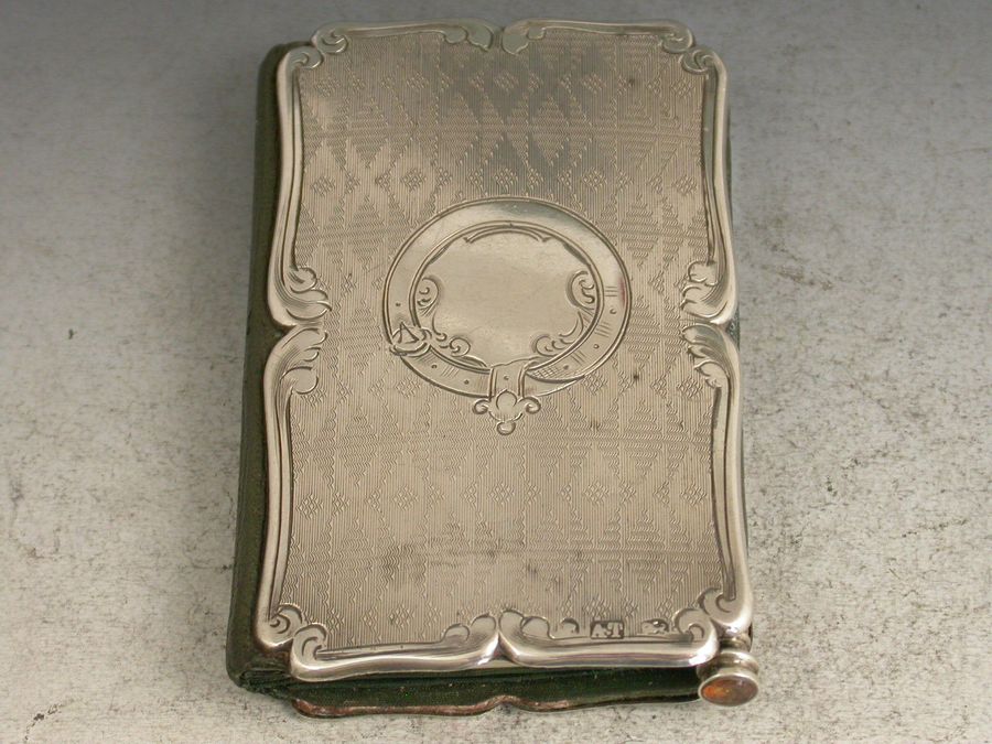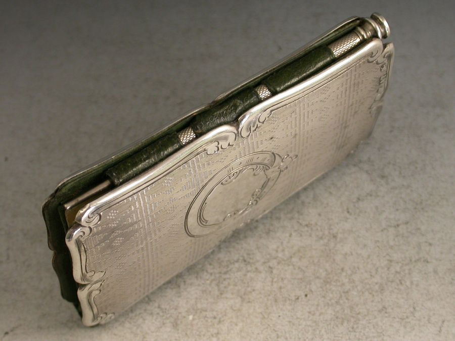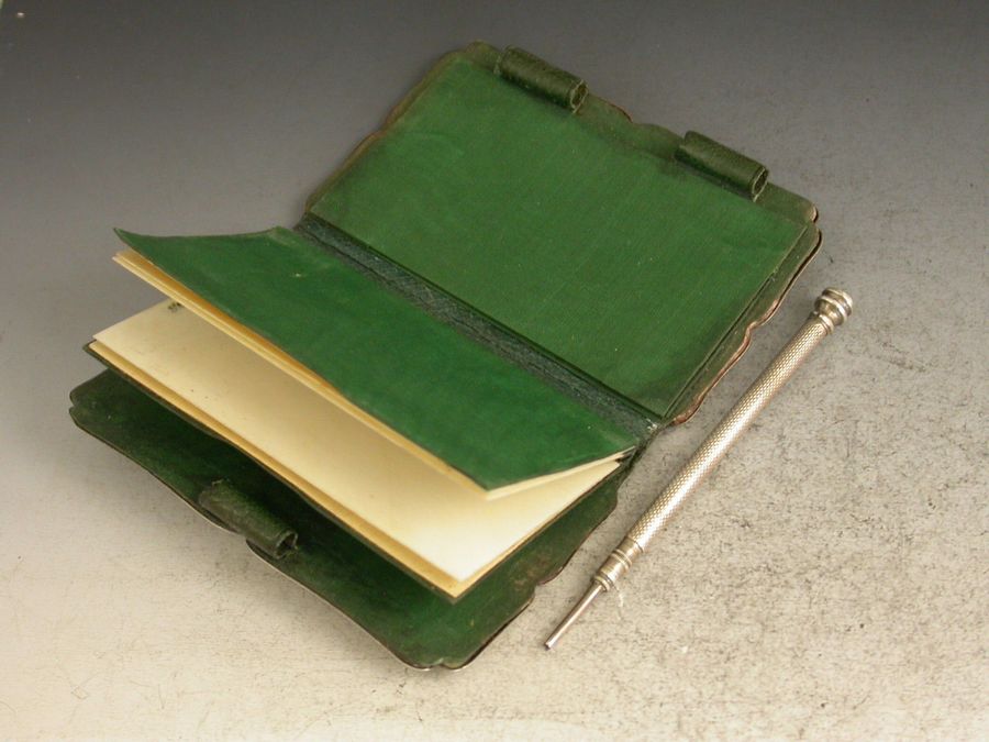 A good Victorian silver mounted Aide Memoire, the two shaped rectangular silver covers engraved with a geometric engine turned design, a vacant circular cartouche to the cover surrounded by a garter belt. The green leather and silk lined interior complete with five ivory pages named with the days of the week (excluding Sunday). The whole held together with a contemporary silver Propelling Pencil inserted within three leather loops.