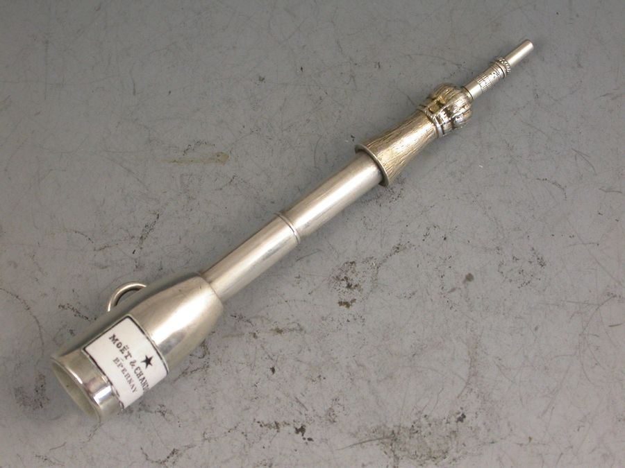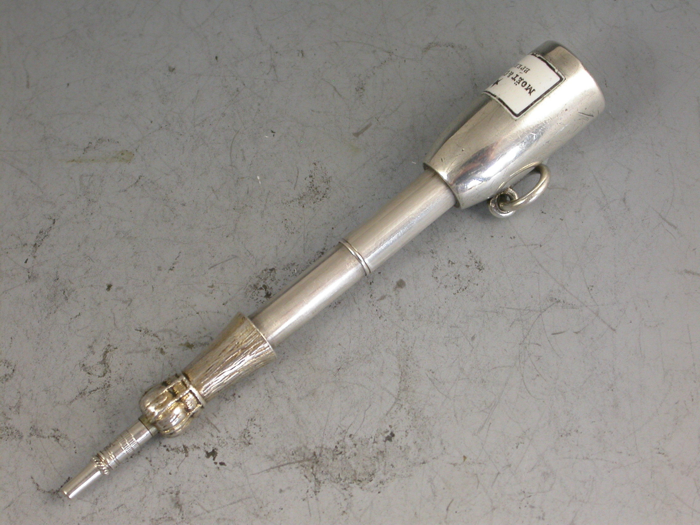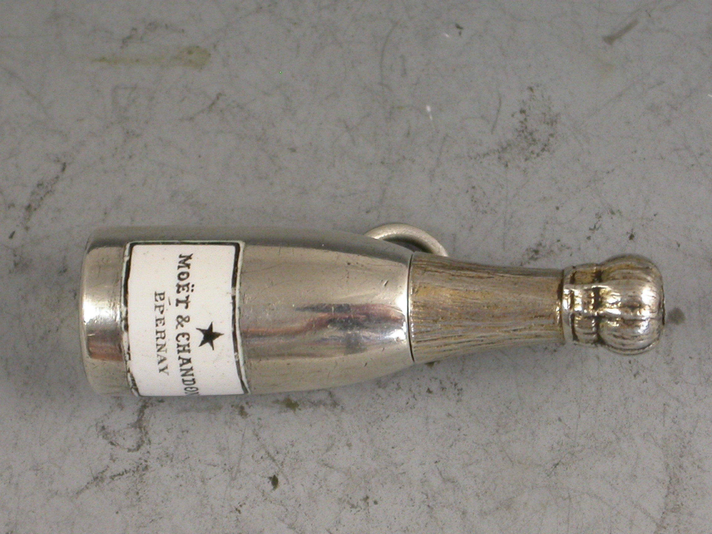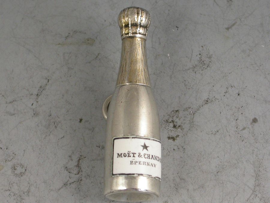 A rare Victorian novelty silver Propelling Pencil, modeled as a Champagne Bottle and of smaller than standard size, with gilded top to imitate the foil and inset black and white enamel label for ""Moet & Chandon, Epernay"". With attached suspension ring.