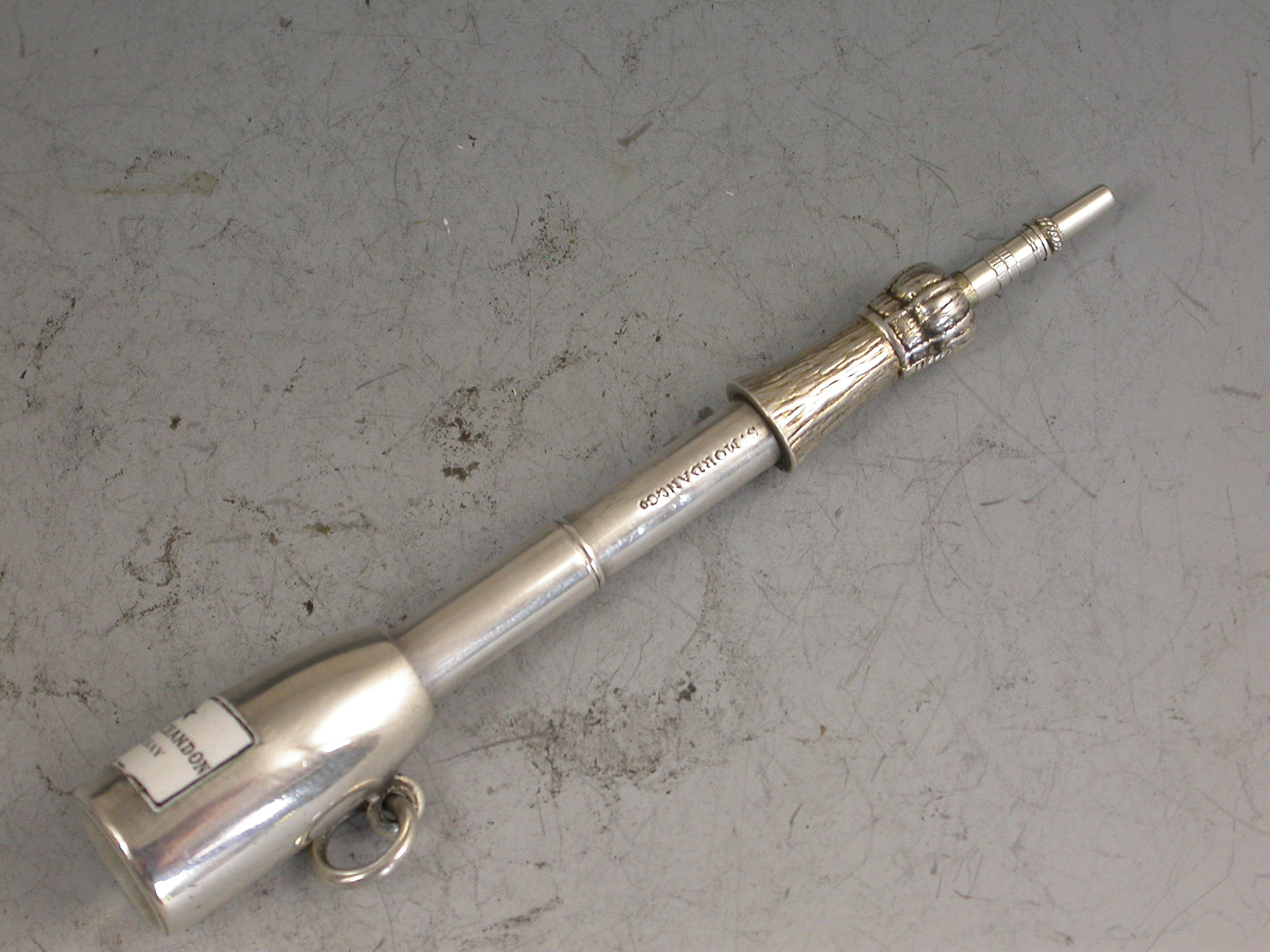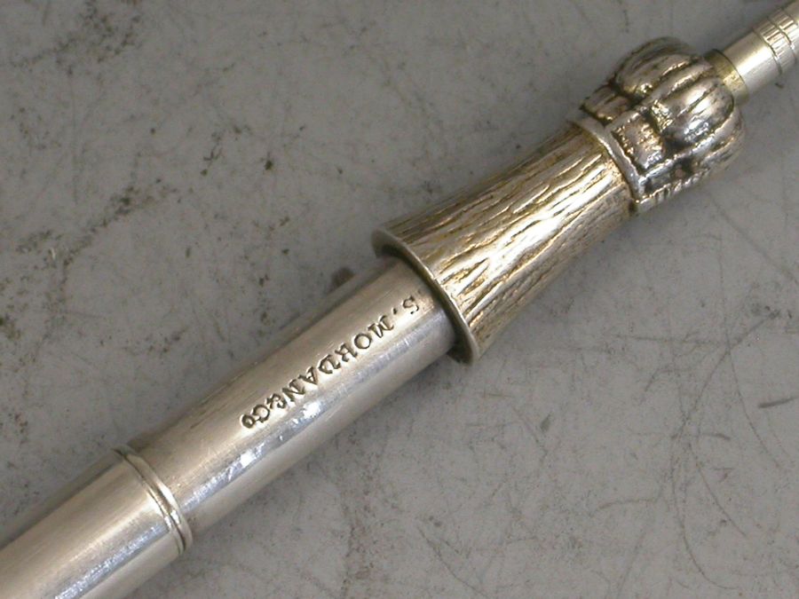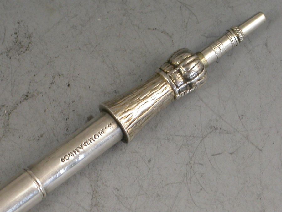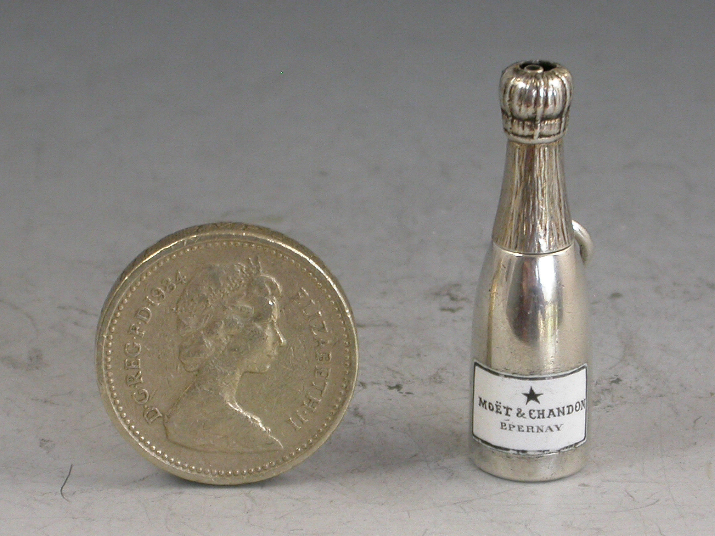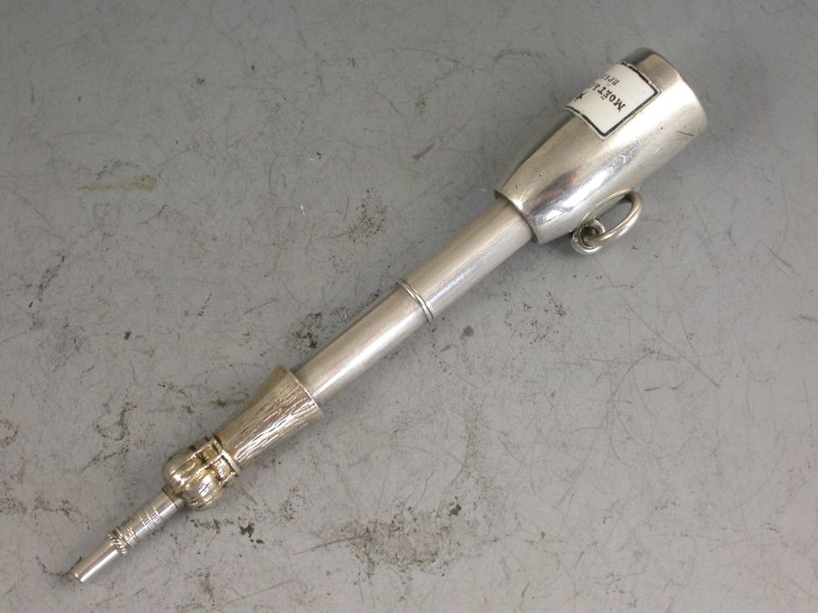 A rare Victorian novelty silver Propelling Pencil, modeled as a Champagne Bottle and of smaller than standard size, with gilded top to imitate the foil and inset black and white enamel label for ""Moet & Chandon, Epernay"". With attached suspension ring.