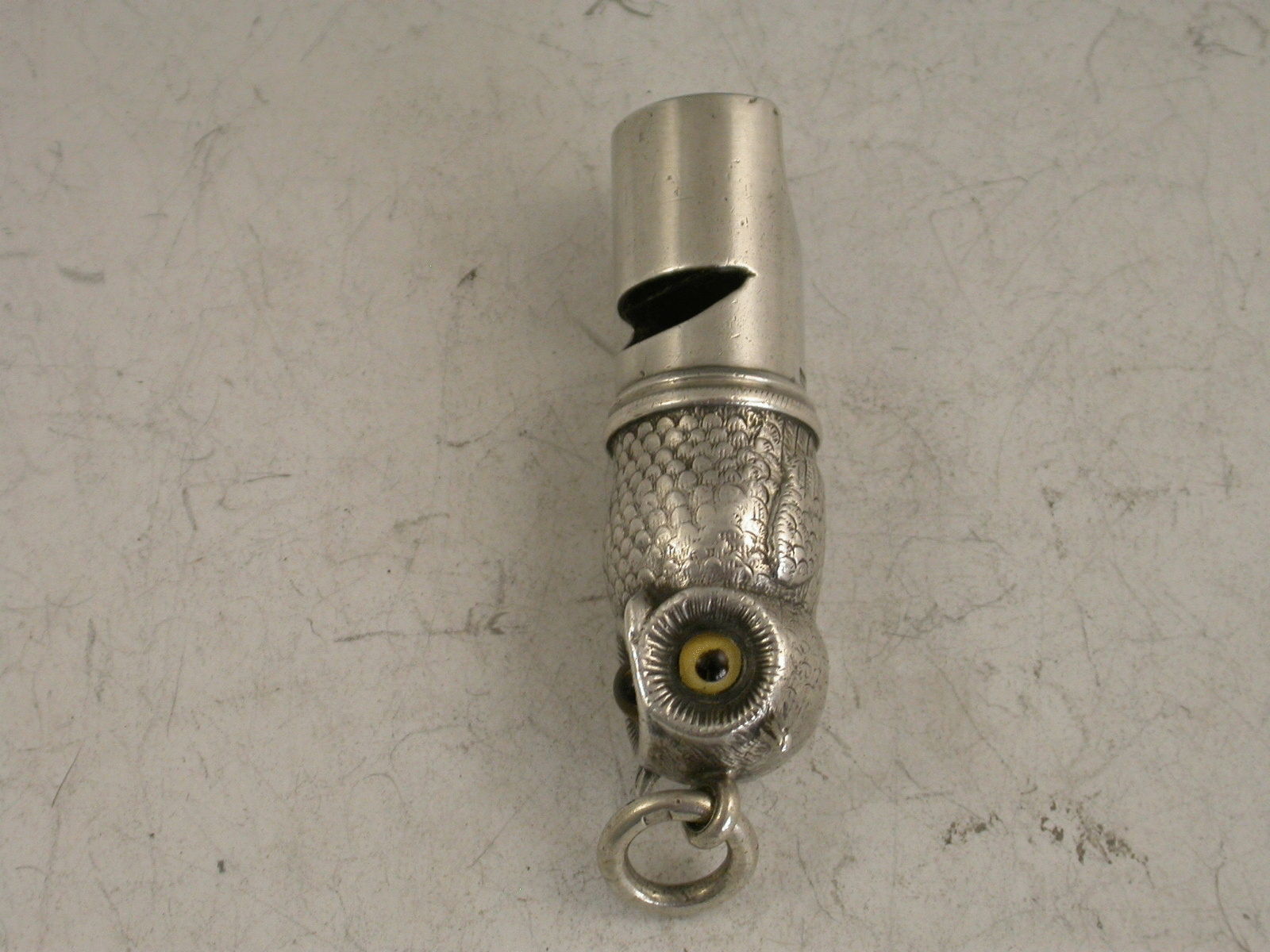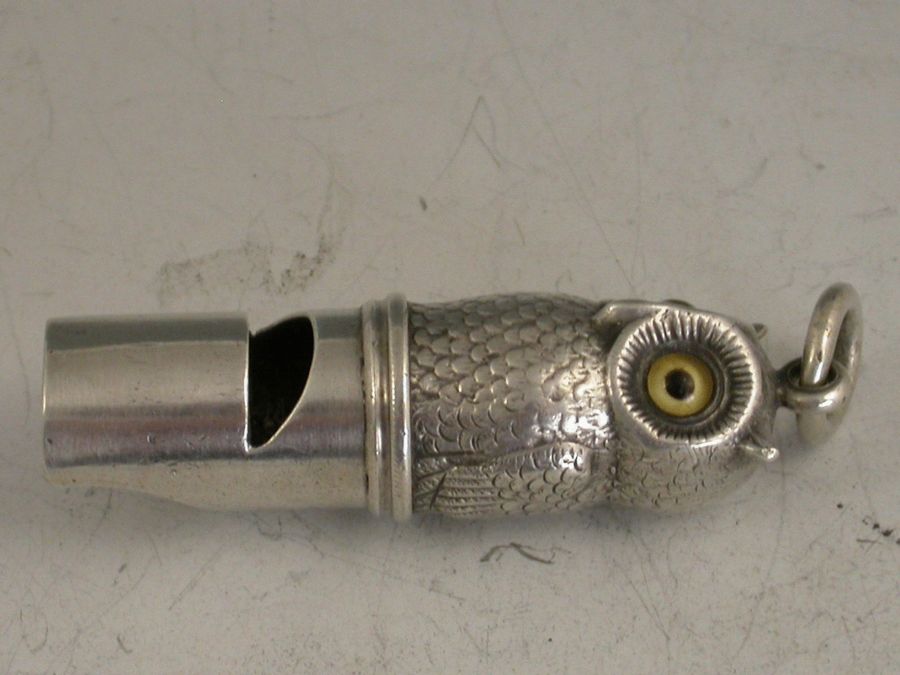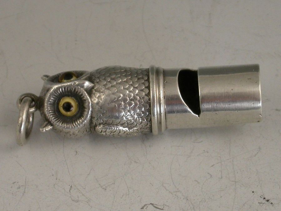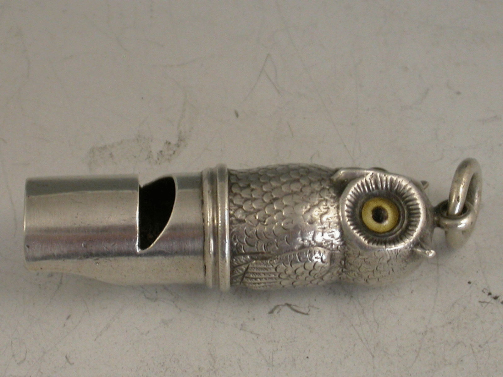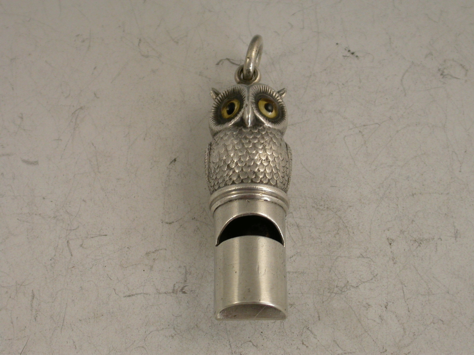 A good Victorian novelty silver Whistle formed as an owl with yellow glass eyes and suspension ring.