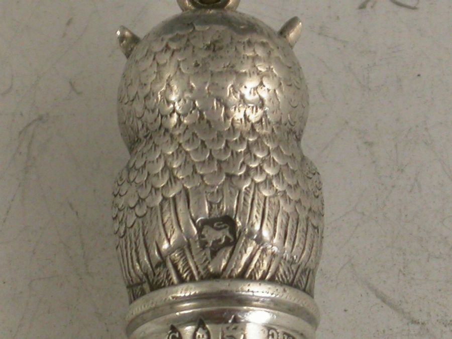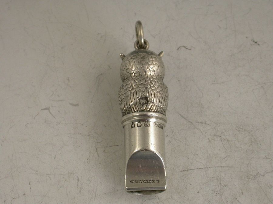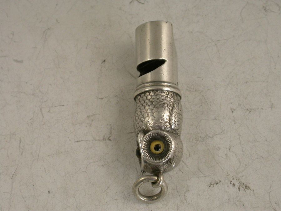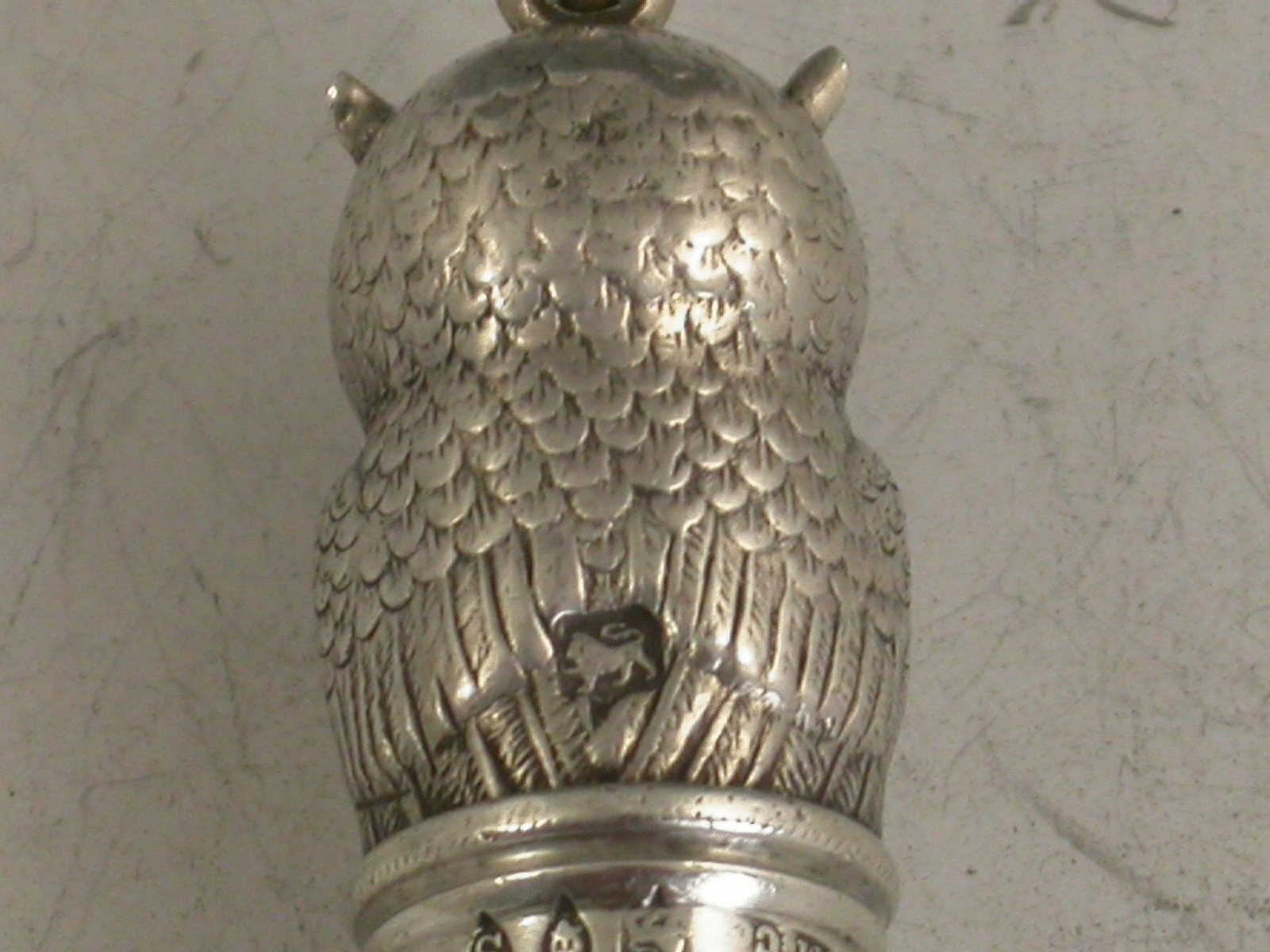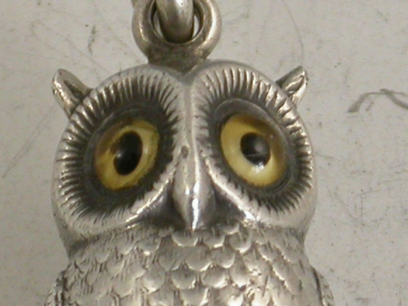 A good Victorian novelty silver Whistle formed as an owl with yellow glass eyes and suspension ring.