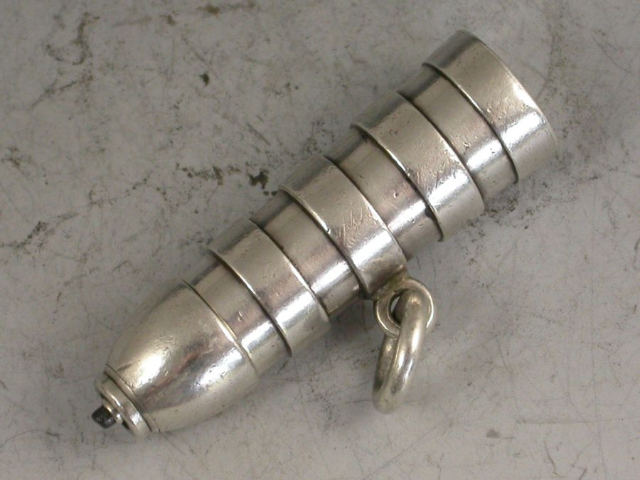 A rare Victorian novelty silver Propelling Pencil, made in the form of a Palliser Artillery Shell, with ribbed sections and attached suspension ring.