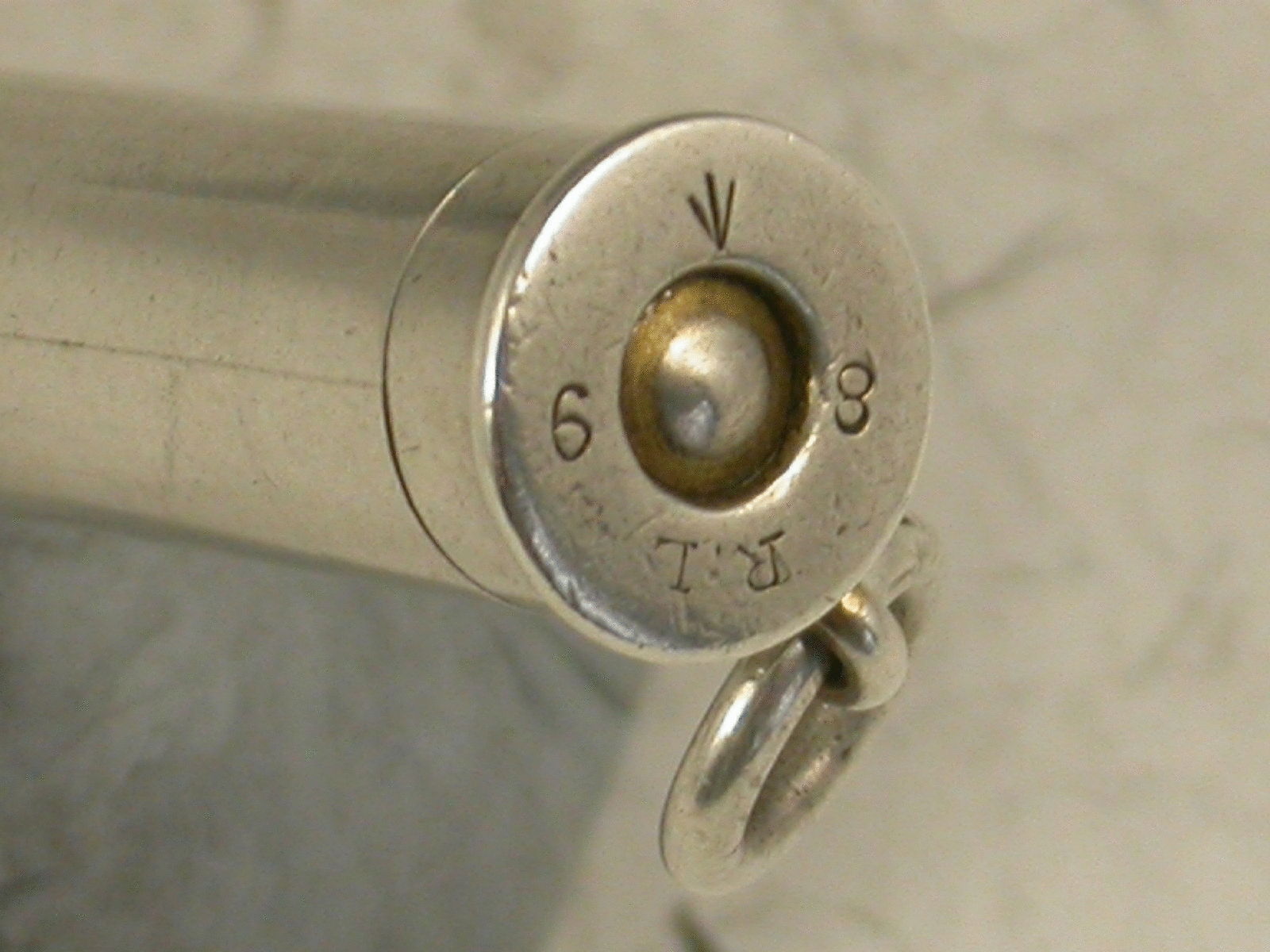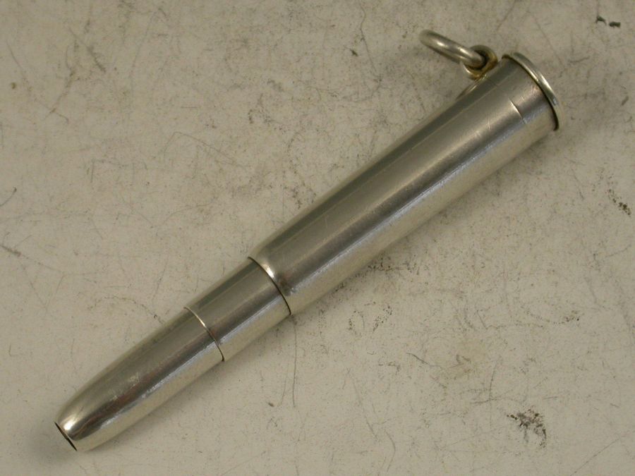 A rare Victorian novelty silver telescopic Pencil in the form of a .303 British Service Rifle Cartridge. The cartridge head stamped R.L 89 and a pheon, for the Royal Laboratory, Woolwich Arsenal 1889.