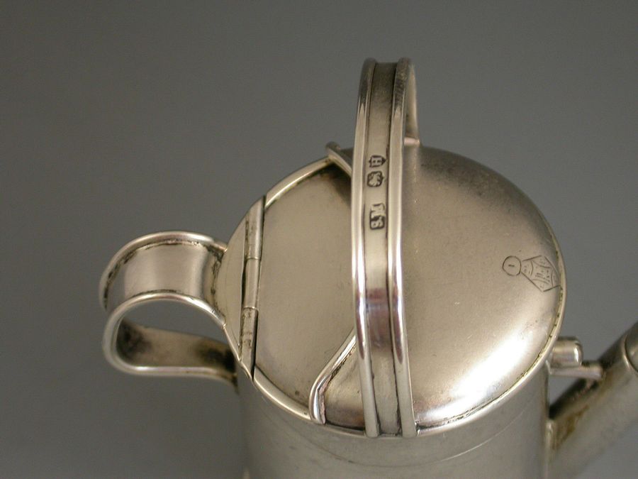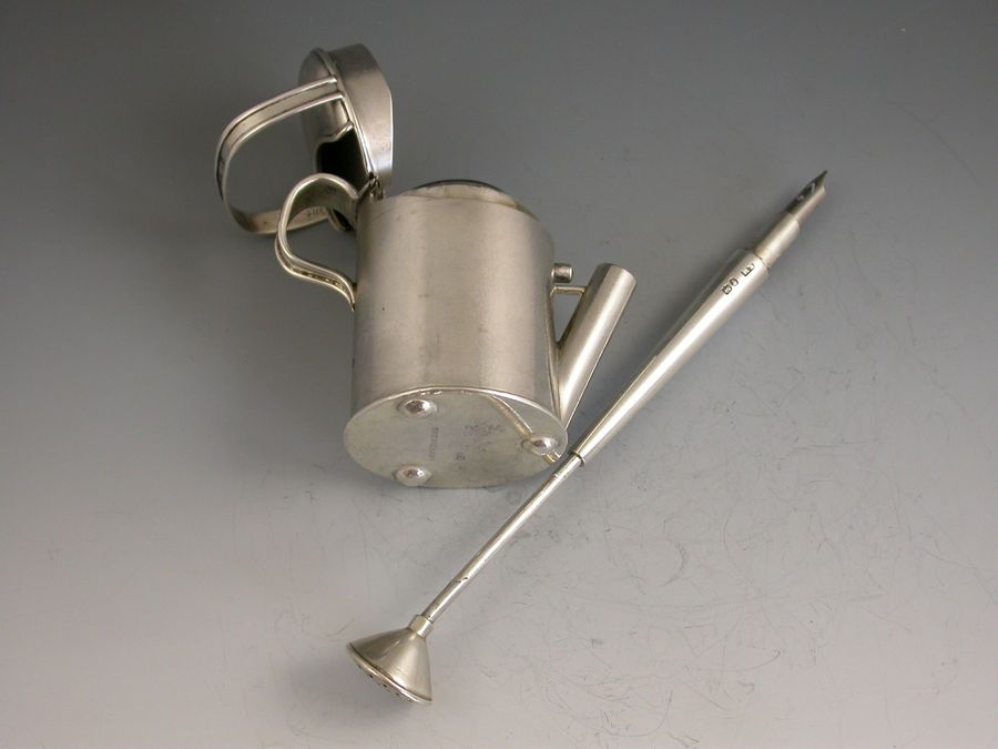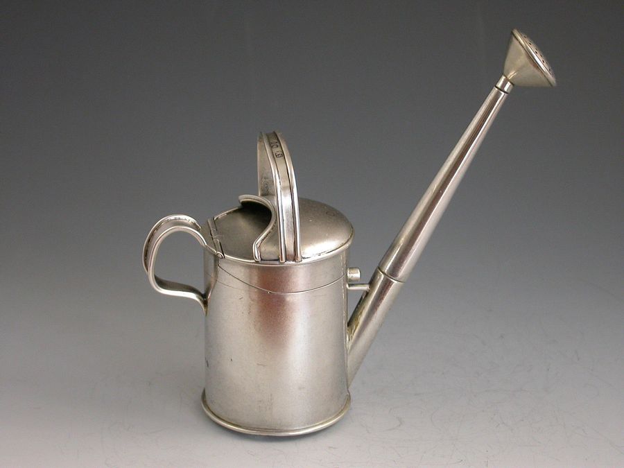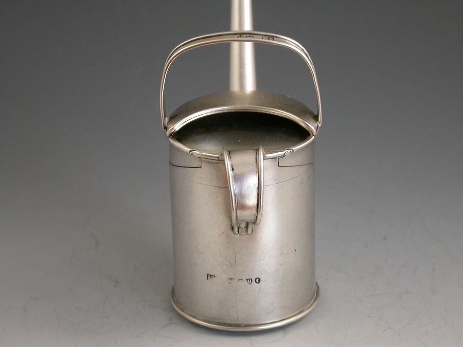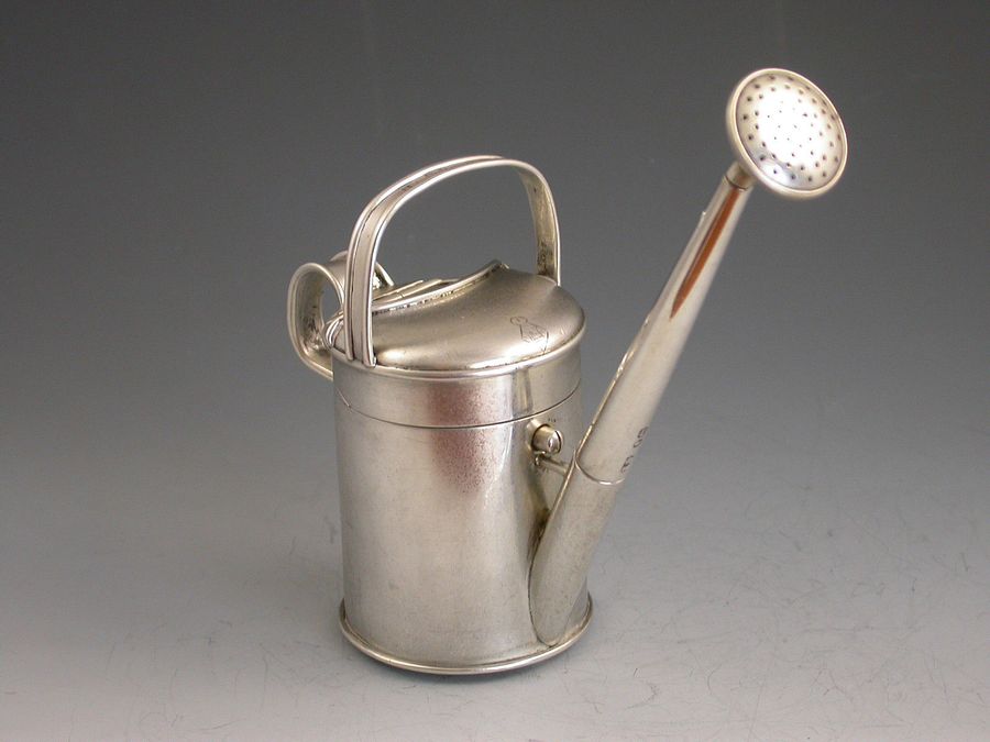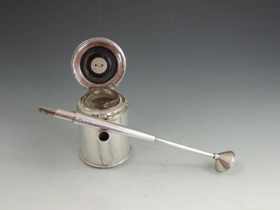 An outstanding Victorian novelty silver Inkwell with integral Penner made in the form of a Watering Can and of a registered design, the sprung hinged cover with compartment to take stamps or seals and opening to reveal a glass lined inkwell. The spout and rose spray forming a dip pen with extendable shaft.